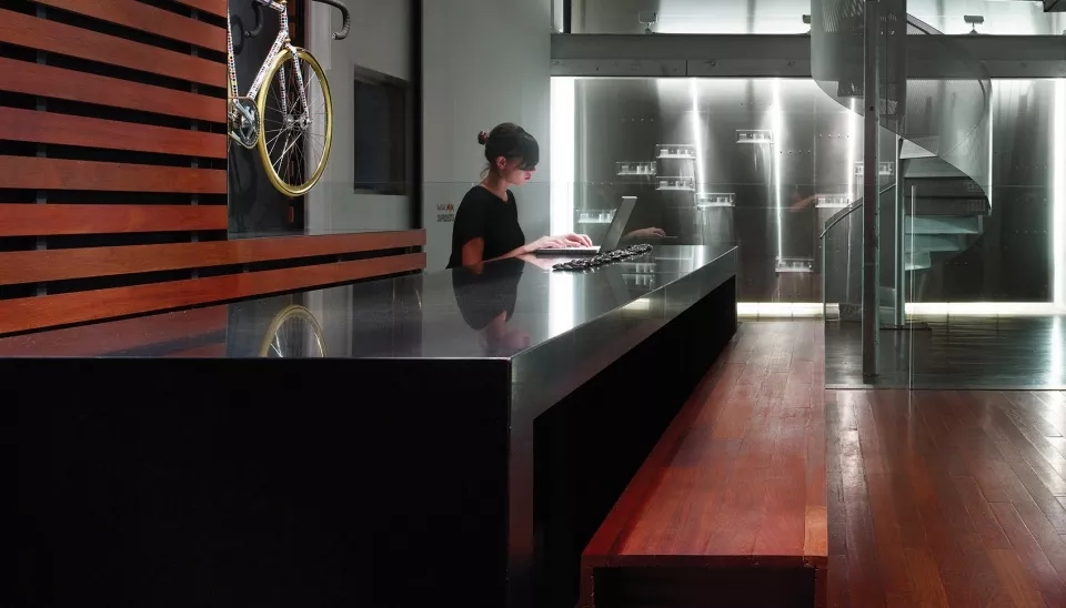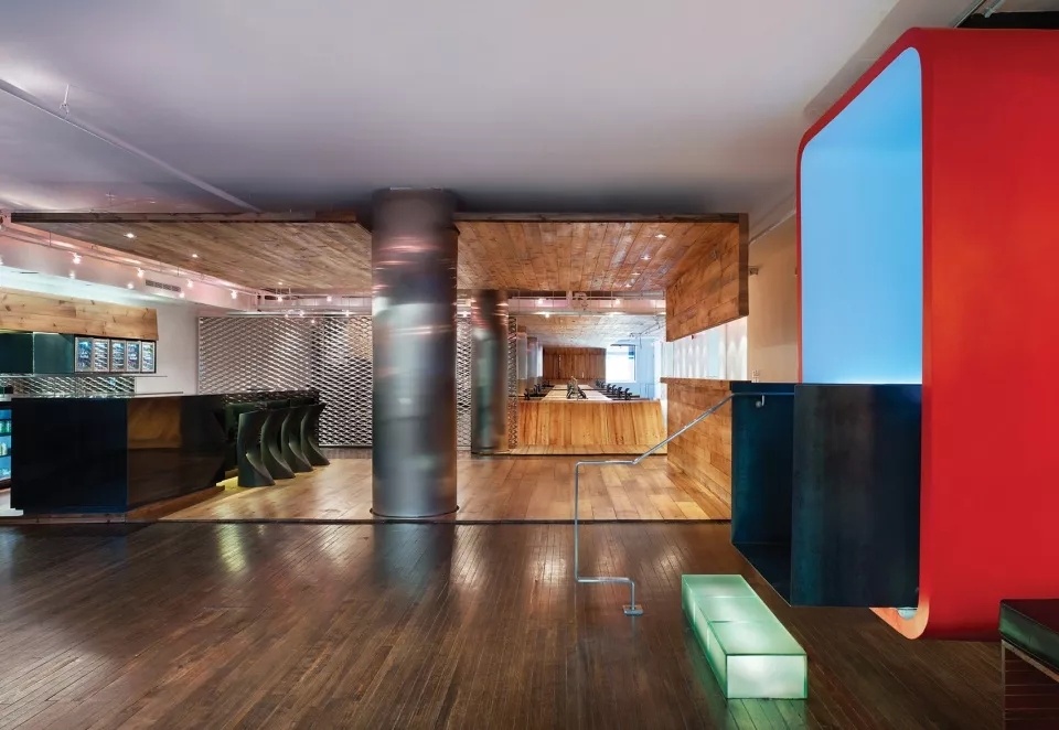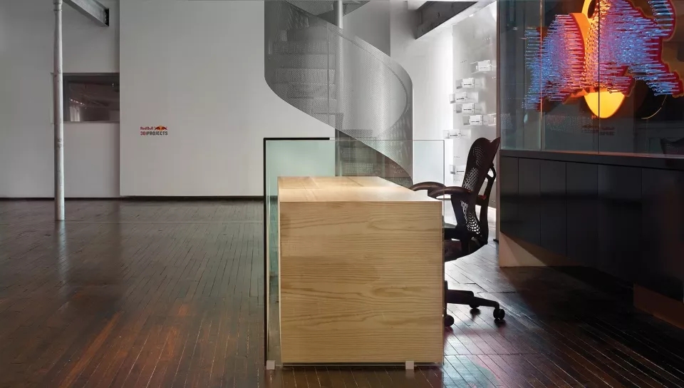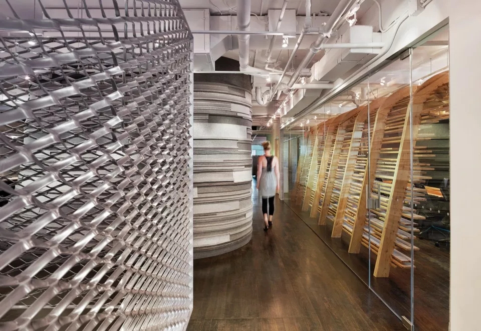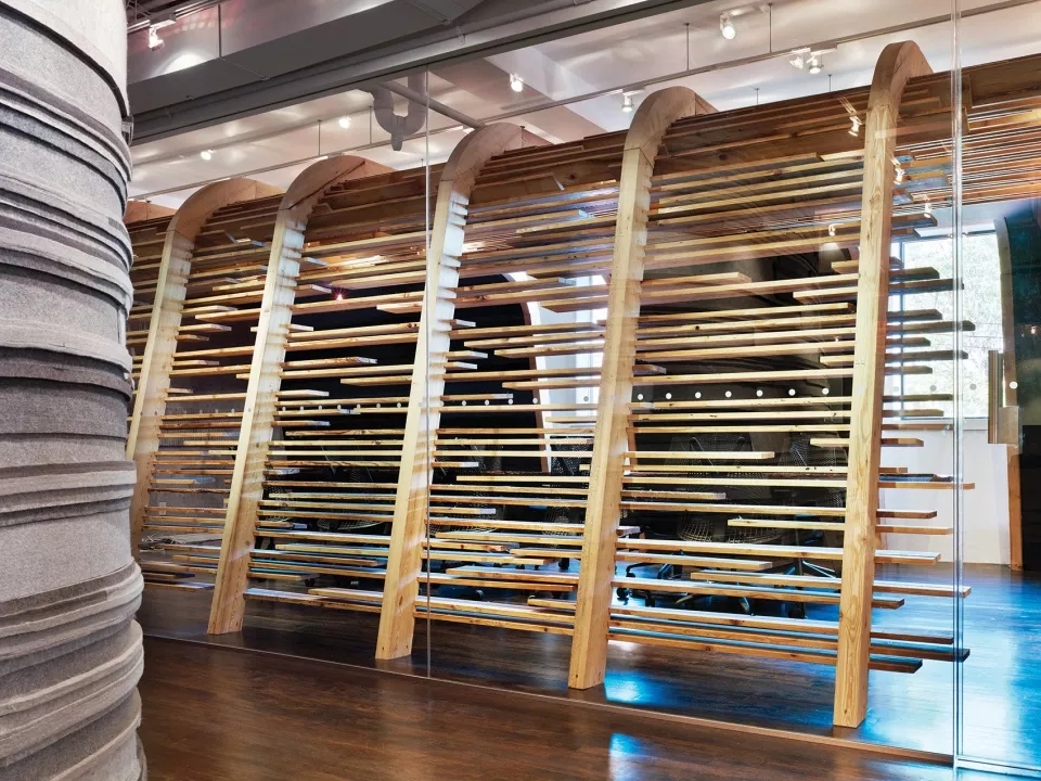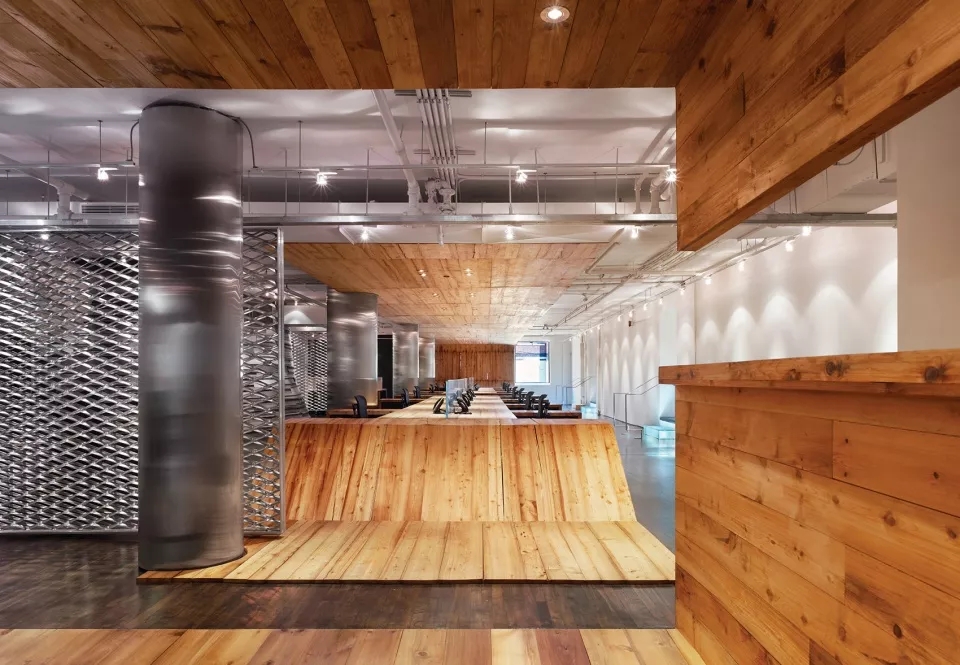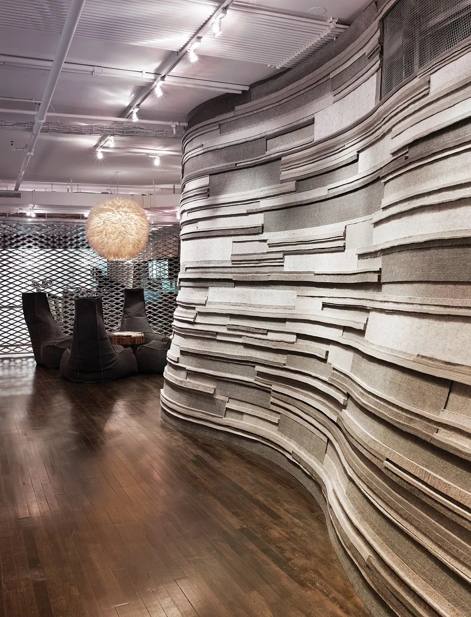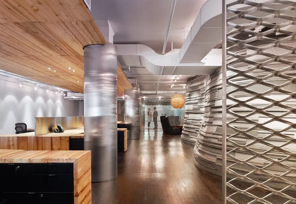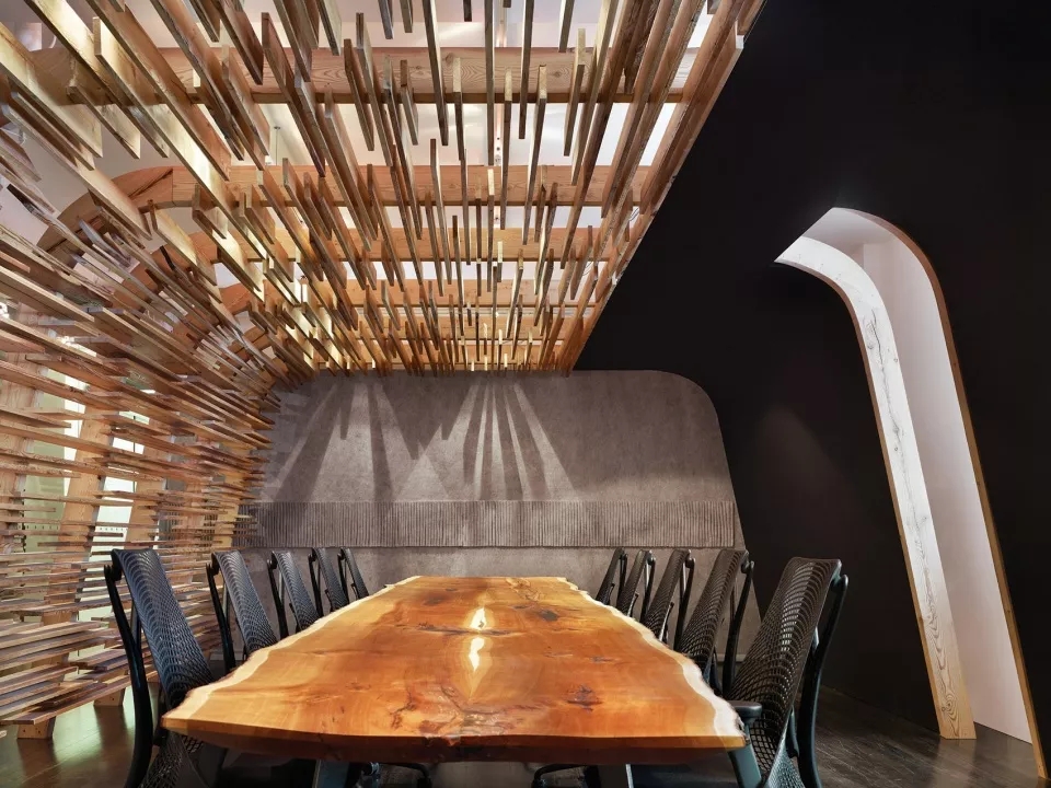 部分采用木饰面将空间分开来,线性办公区采用木质桌面,在桌面底端与地面相结合,部分空间又采用羊毛毡饰面,柔化了整个木质质感的硬度,就连会议室,也是采用木板条构成的天花板和墙面,木质在这些空间内占有大部分利用率。