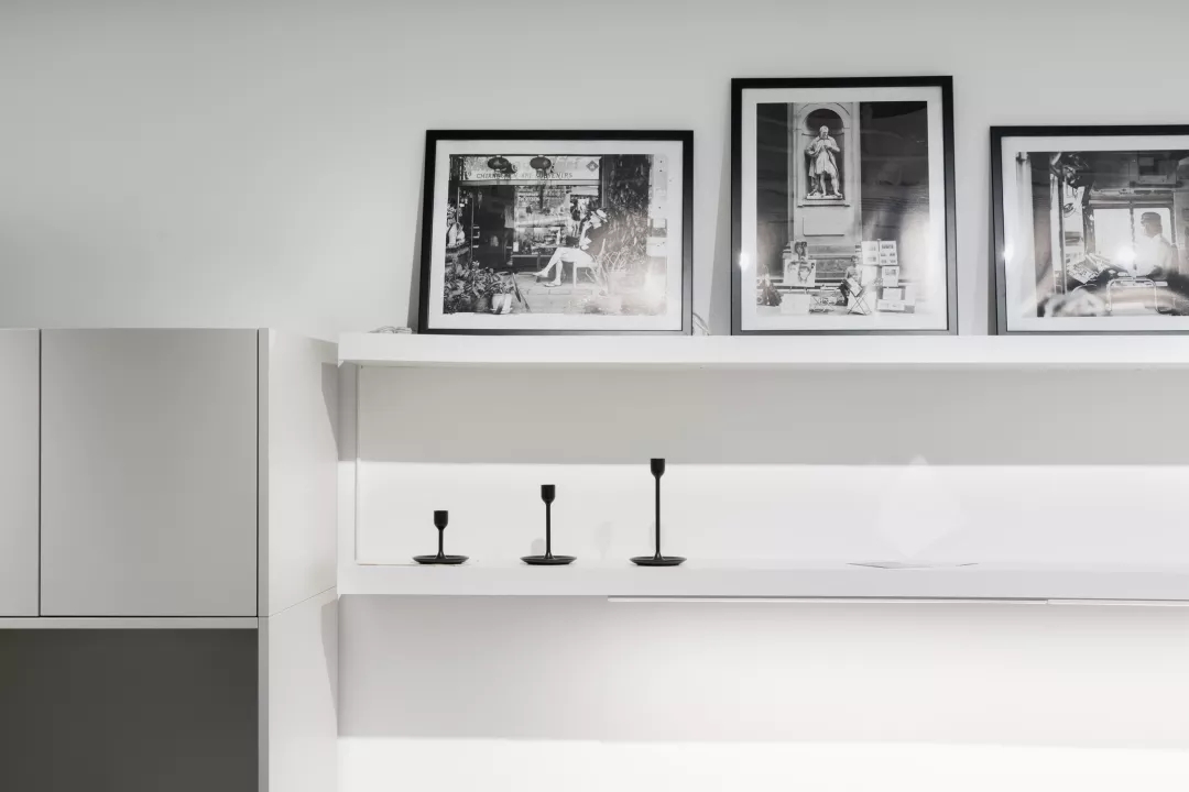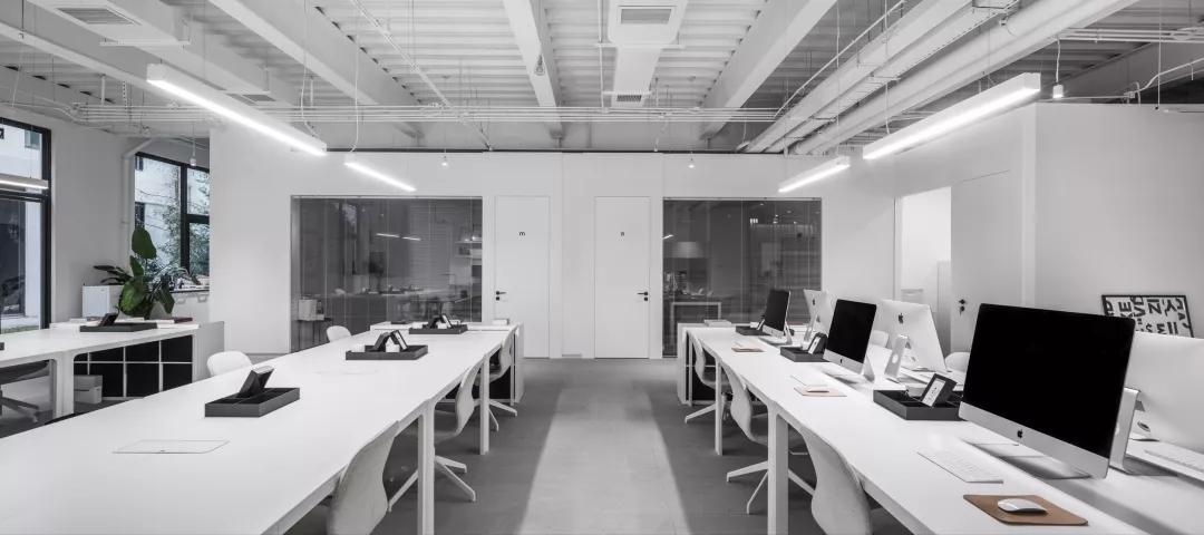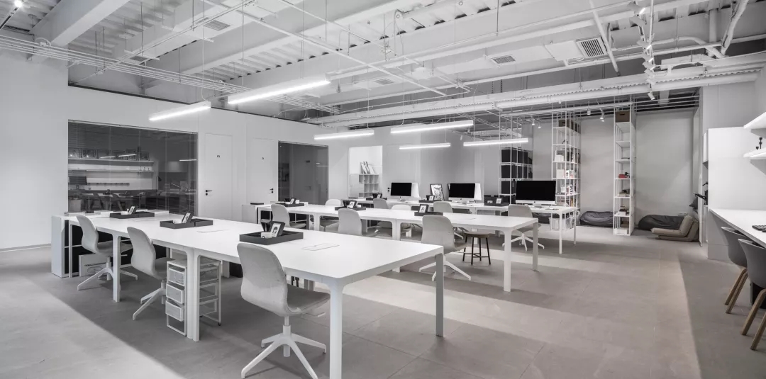 室内的主要材质采用浅灰色的干粒通体砖、黑钛拉丝不锈钢以及大面积的白色定制柜体。材质的选用既考虑到与建筑的整体色调统一,在视觉上,给予足够的有序及利落感。空间视觉上的适当留白,将“内容”交给充盈在空间中的无限创意和发生的故事。
