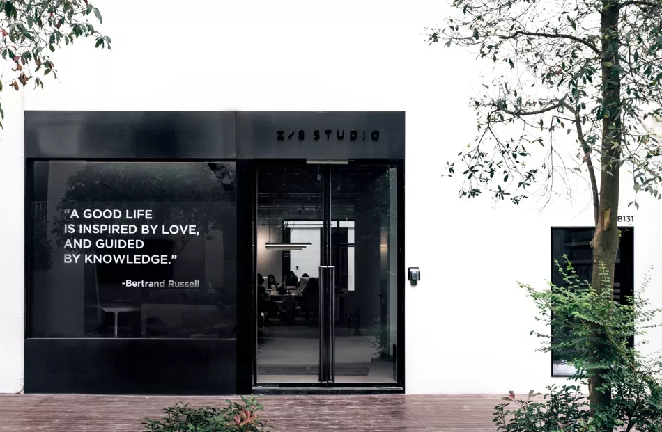 门头的设计考虑到与园区建筑白色工业风格的呼应,在利落的黑钛拉丝不锈钢的衬托下,橱窗上的英文,正婉婉道来Z/S的理念。“档案室”所代表的丰富内涵、沉稳积淀和并然有序,成了Z/S STUDIO新办公空间最核心的设计基调。在空间入口处的展示区不仅陈列着Z/S STUDIO过往所有的出版物及生活好物,更为日后更多创意内容和展览预留出空间,呼应着“档案室”的设计灵感。