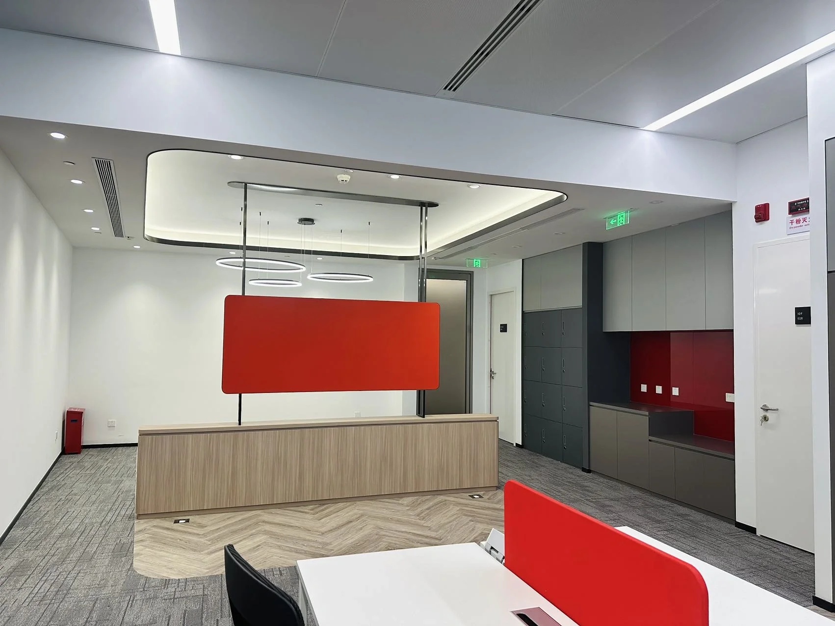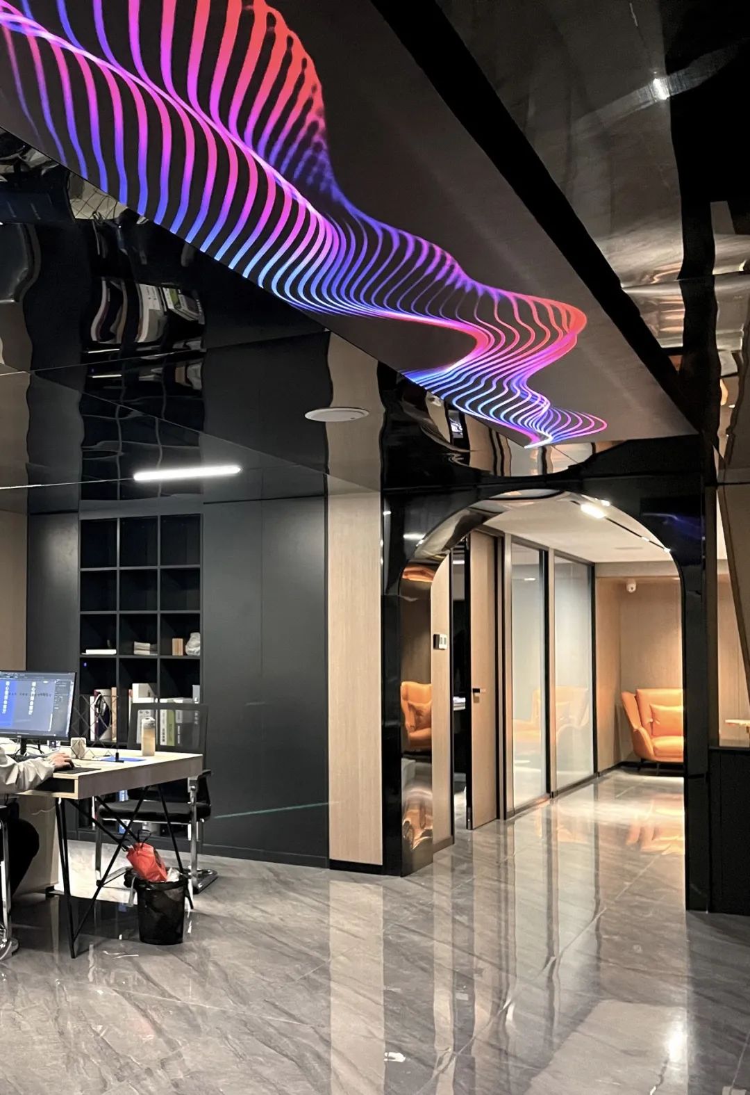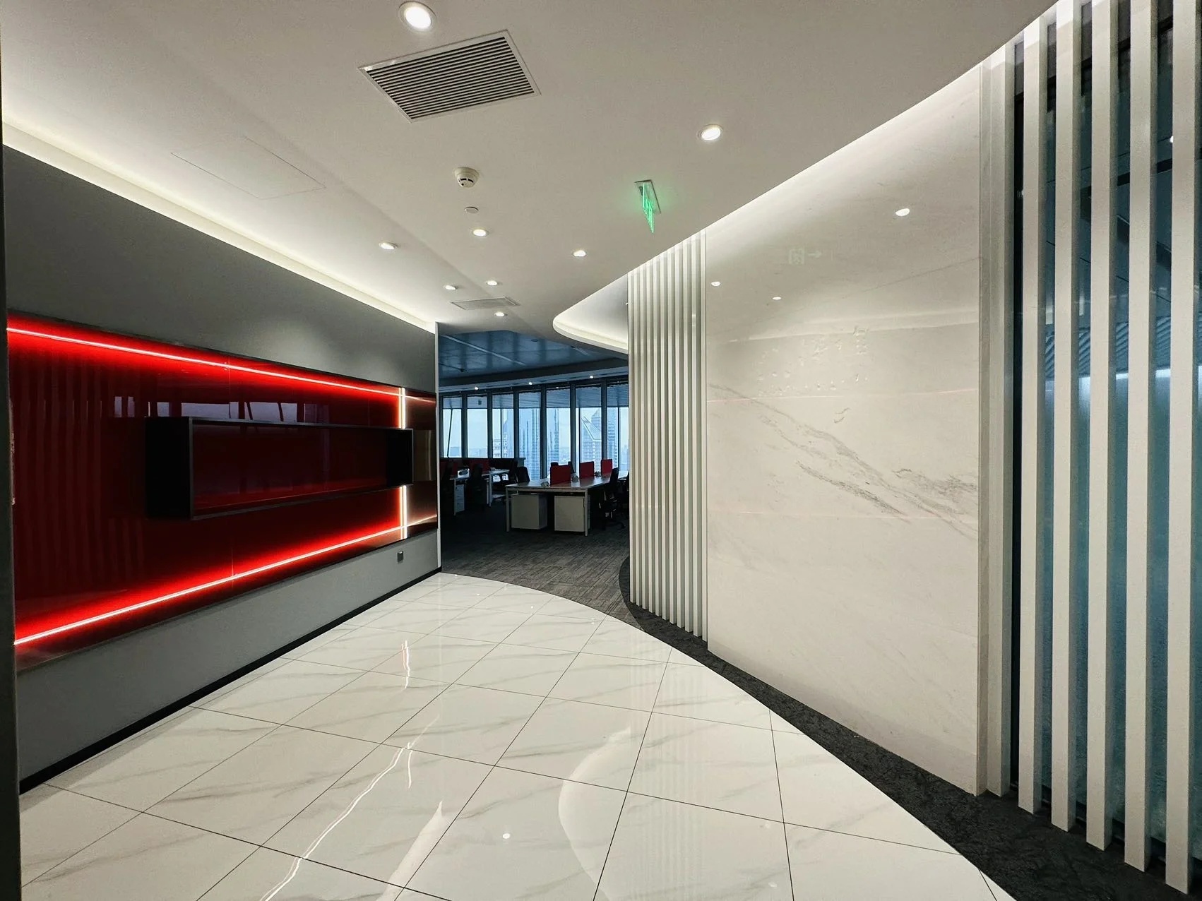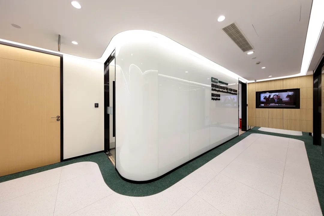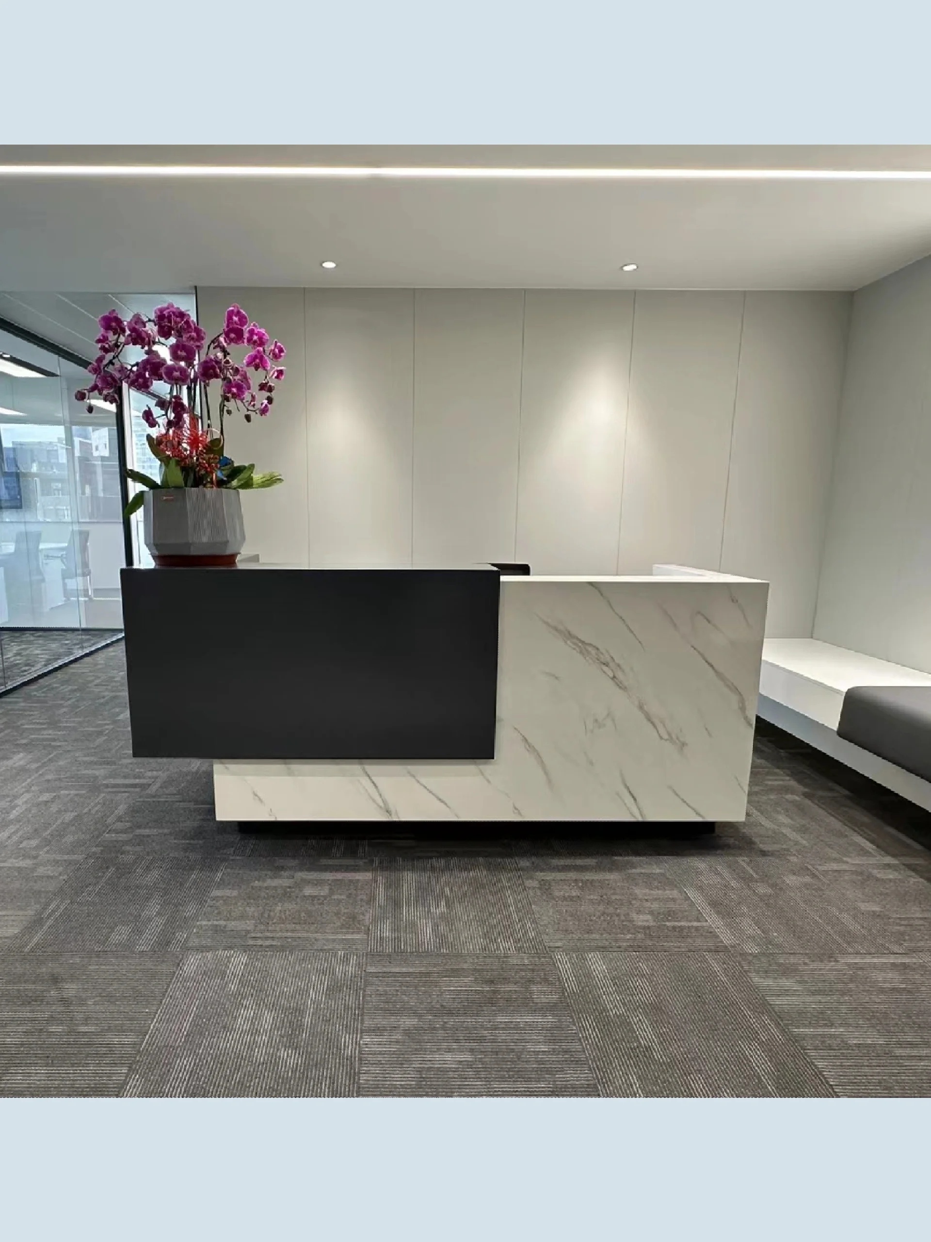 墨绿的企业色(SHAW地毯)和白色的配色,让整个前厅空间显得更高雅;而点缀于饰面上的少量木纹肌理,为时尚的空间增添了一抹轻奢的质感。