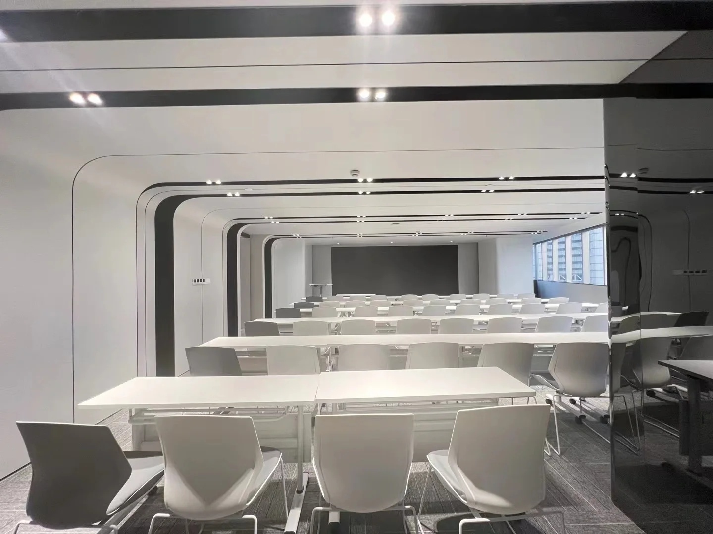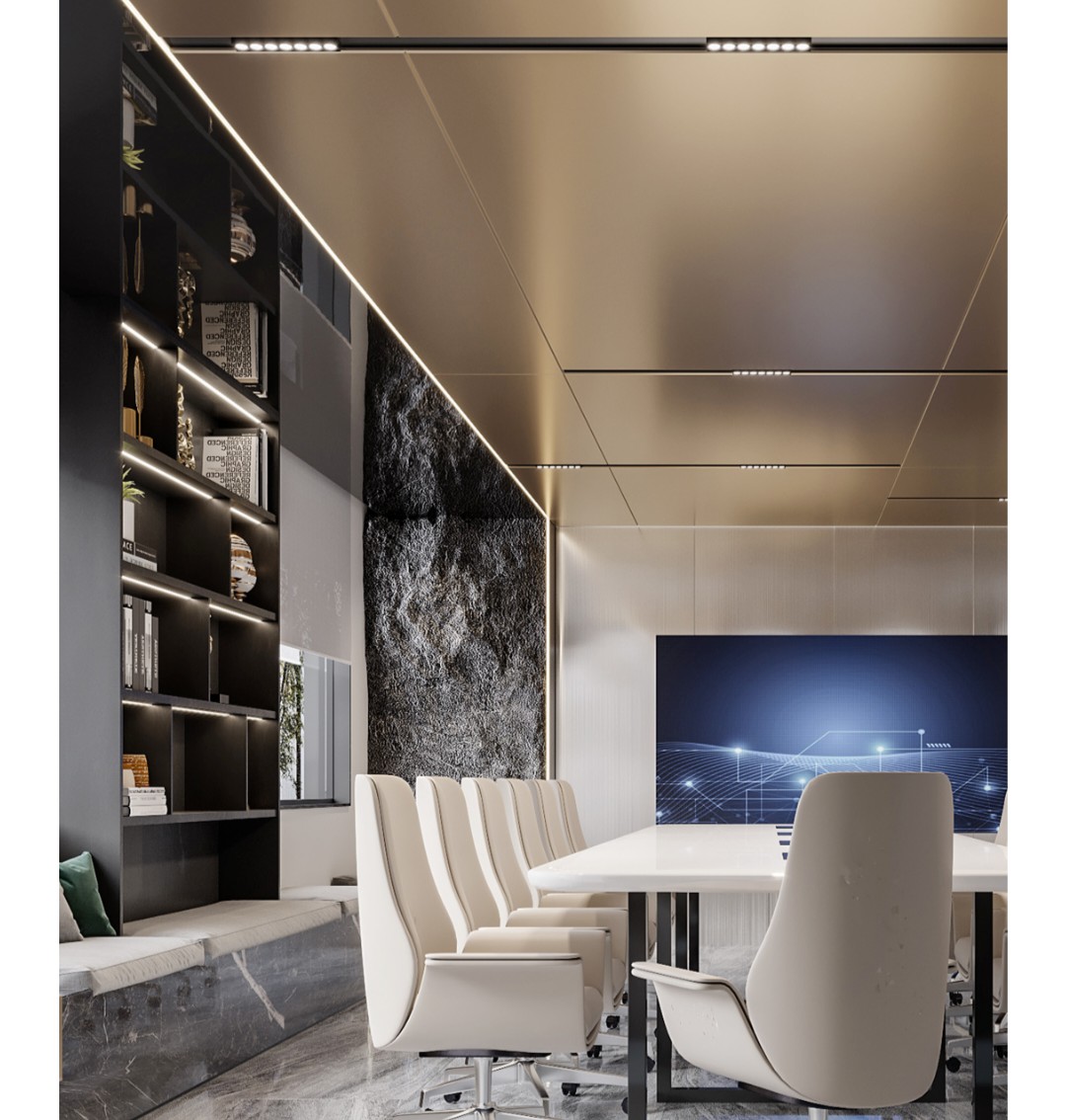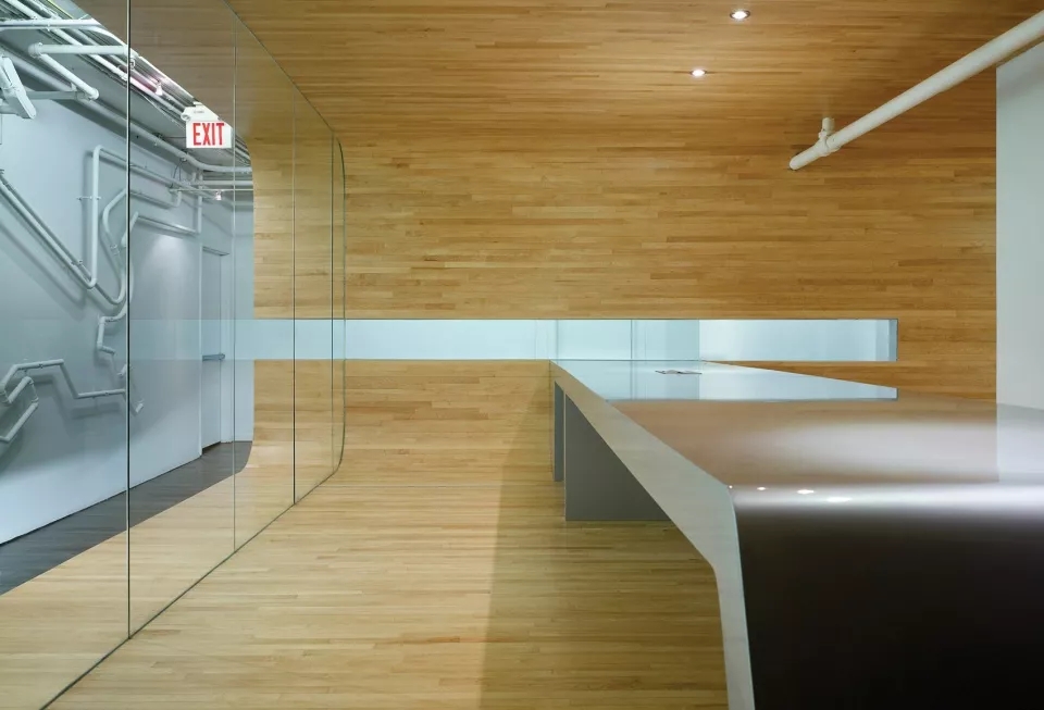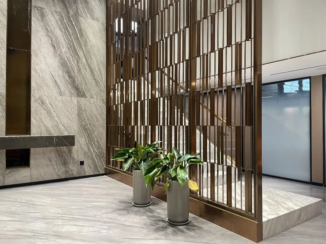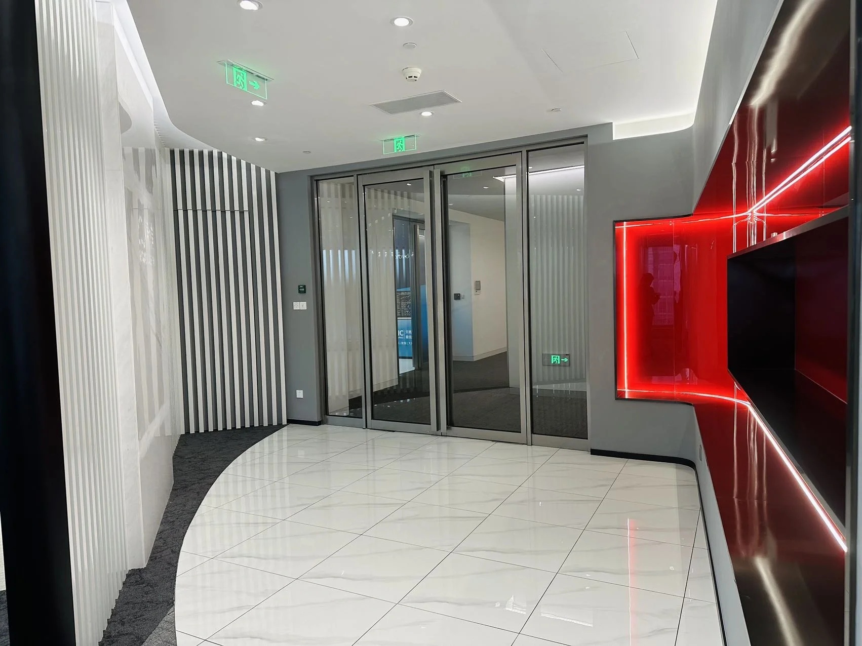 墨绿的企业色(SHAW地毯)和白色的配色,让整个前厅空间显得更高雅;而点缀于饰面上的少量木纹肌理,为时尚的空间增添了一抹轻奢的质感。