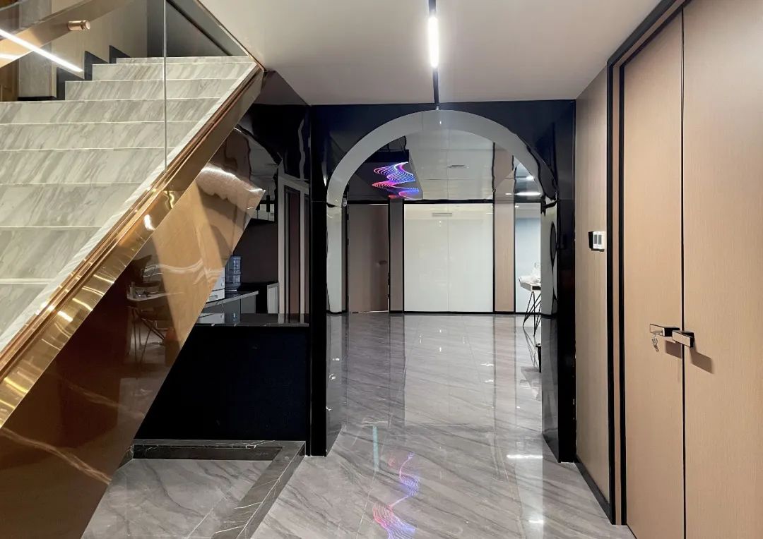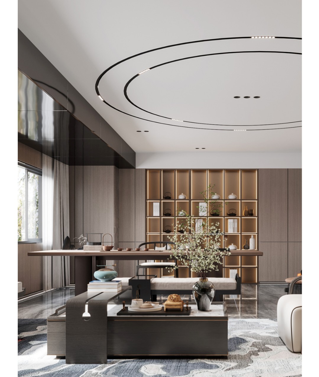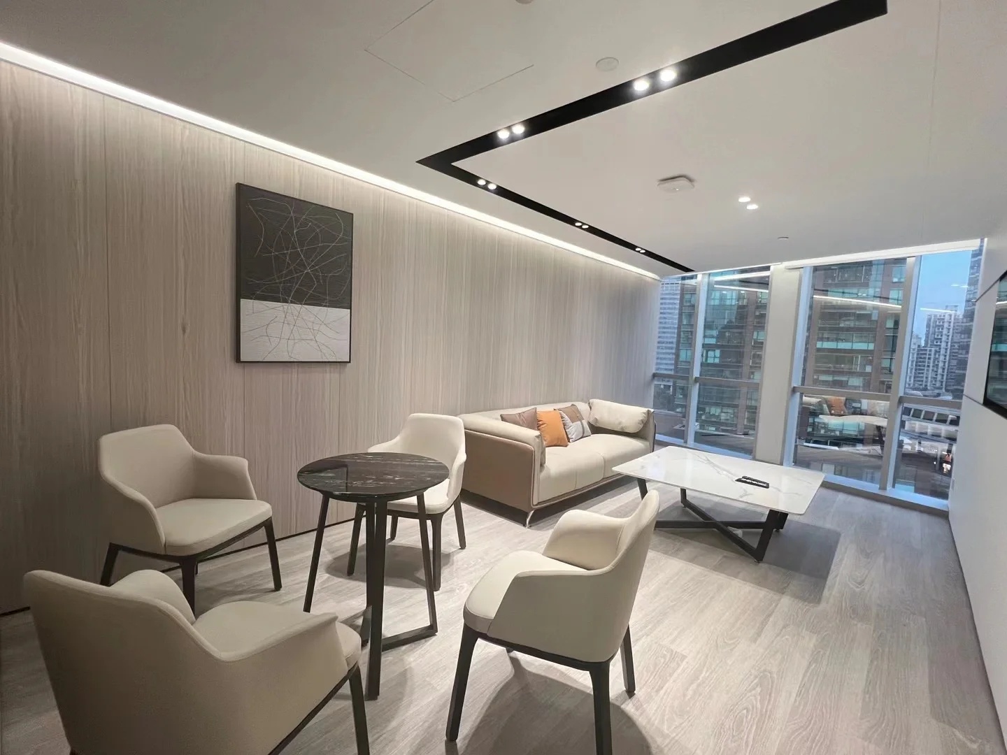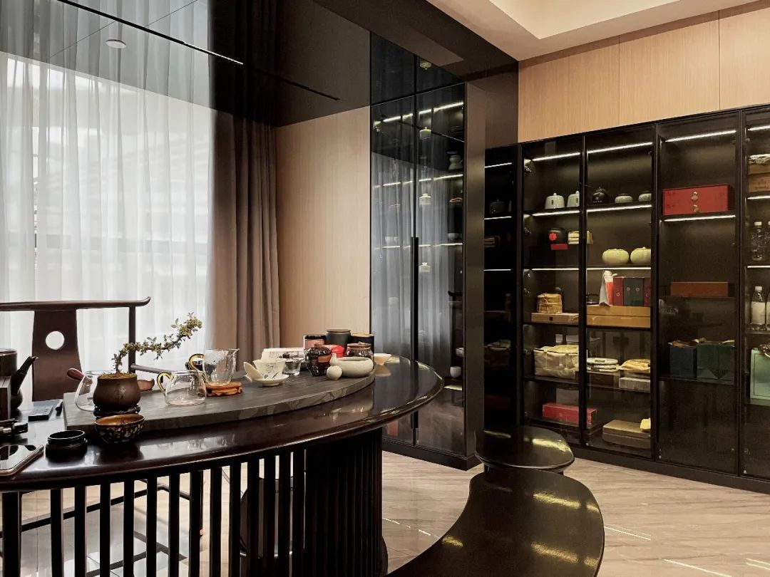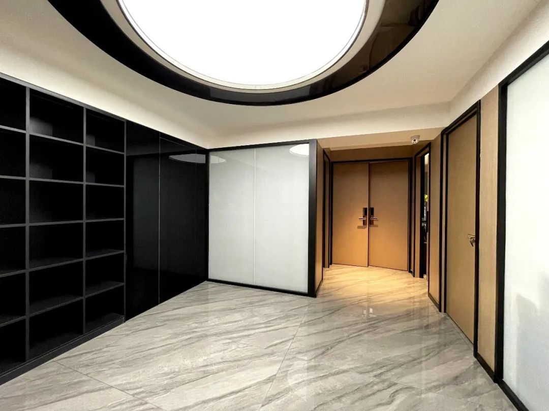 淡雅的木饰面、神秘高雅的墨绿色、隐约透光的玻璃隔间,让整个空间在简约凝练的现代美学中增添了时尚与沉稳的气息。