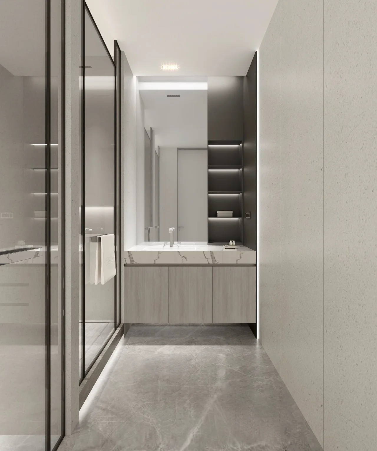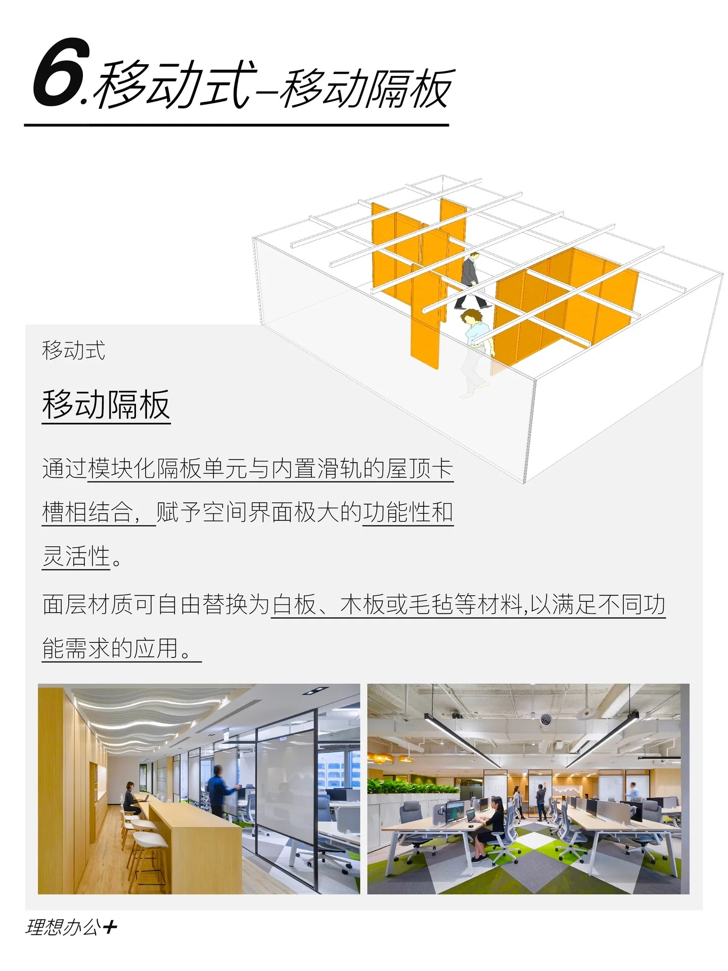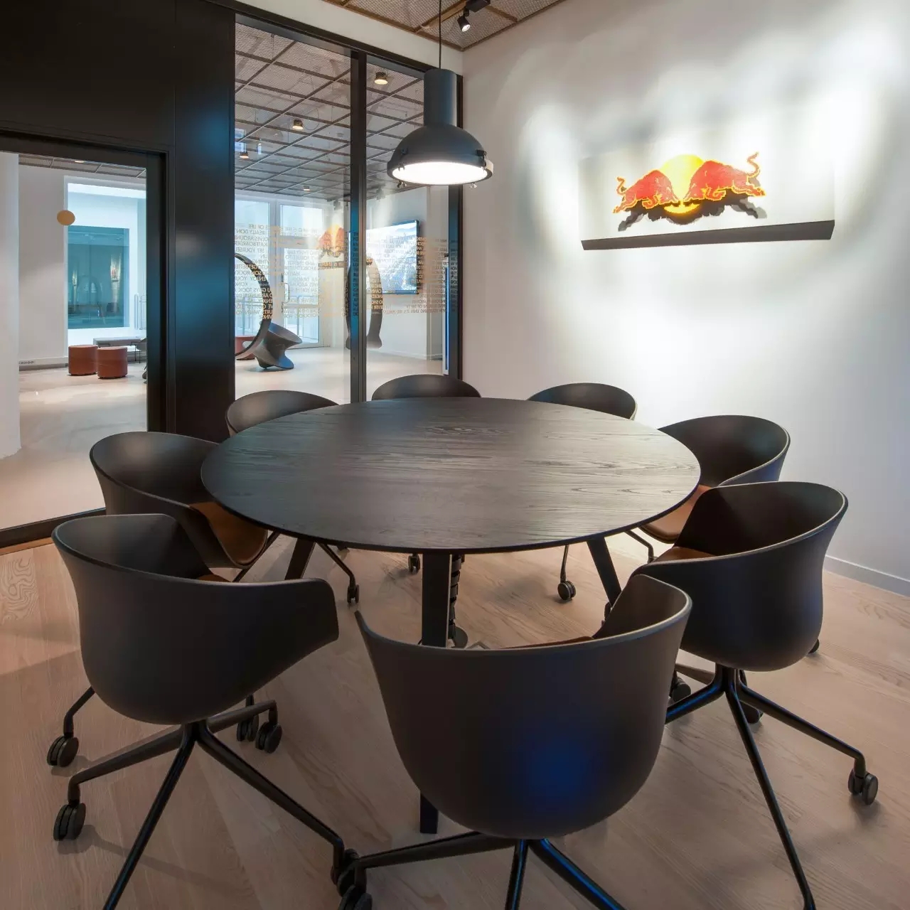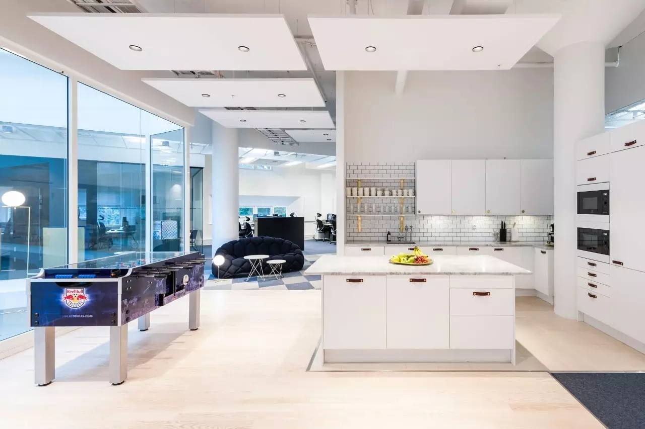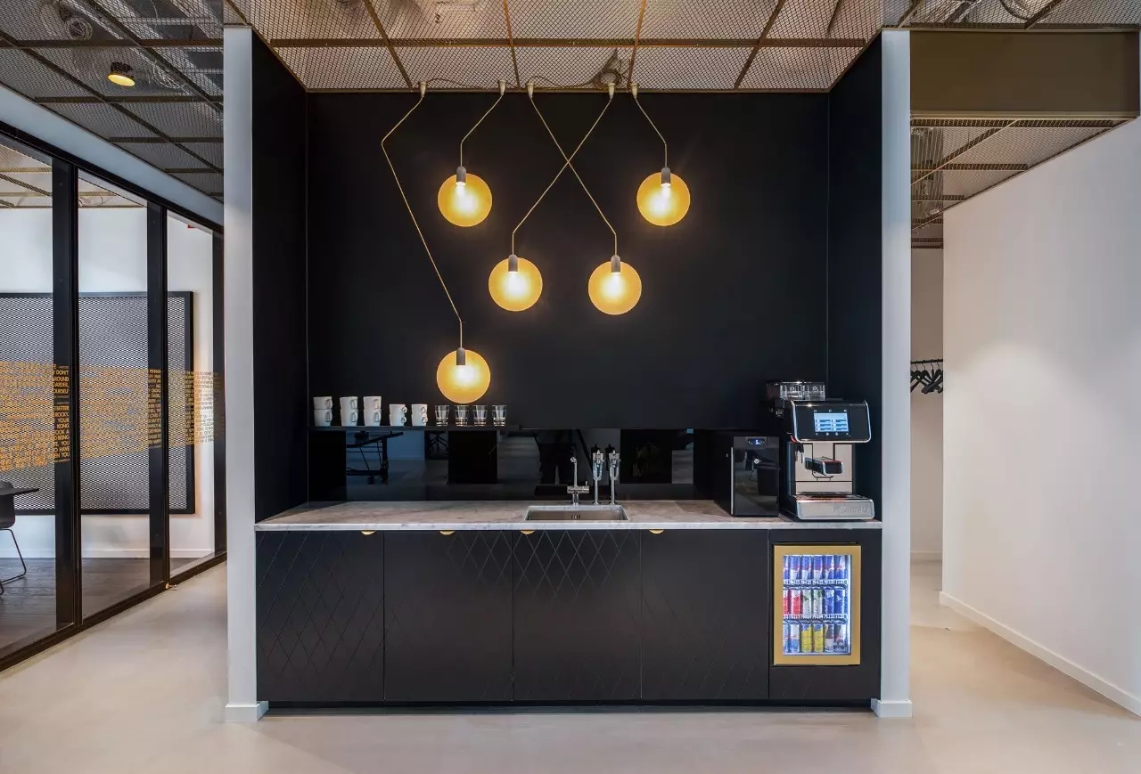 工作区设置有小型工作间,而在工作间外围则是一个小型的休息场所。深蓝色的波浪形沙发搭配墙壁上一副抽象油画,给人以轻松和舒适感。会议室的风格沉稳而严肃,黑色桌椅的搭配诠释出空间的简约与时尚。外部透明的玻璃窗上印有公司的宣传标语和工作口号,起到激励员工之用。饮料供应区采用吧台设计,整体昏暗的背景与墙面黄色的灯具之间形成对比。厨房的设计则采用了白色大理石材料,看上去纯净而自然,充满温馨。此外,为了让整个办公室利用率更高,设计师巧妙利用空间原理,设计了大量可移动和折叠的趣味组件家具,赋予空间灵活性,充分体现了红牛不屈服,勇于冒险的精神。