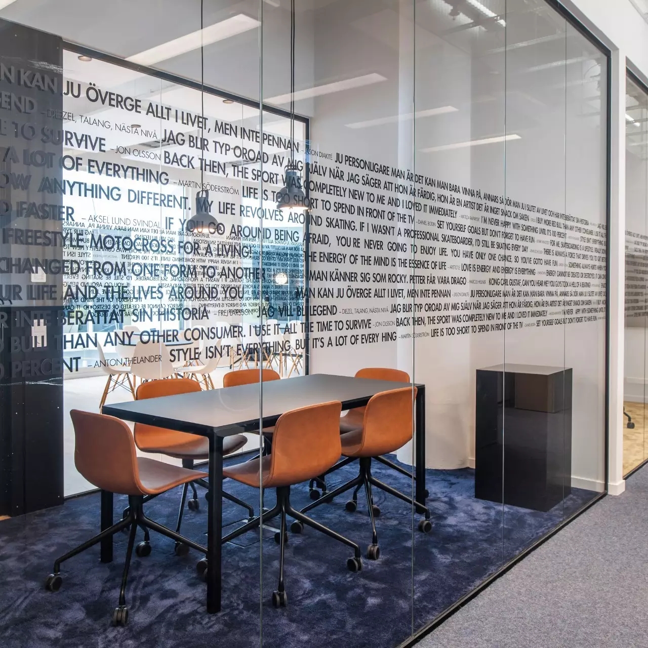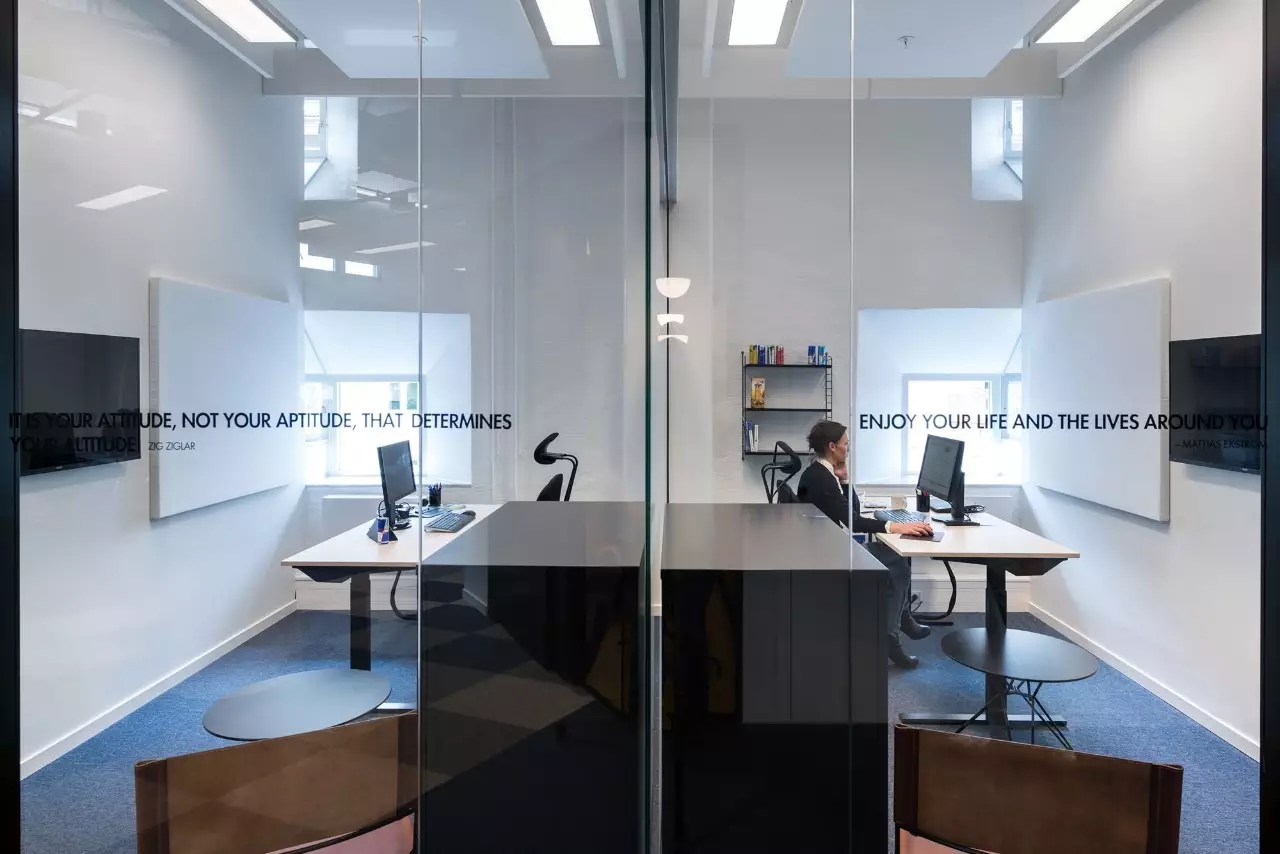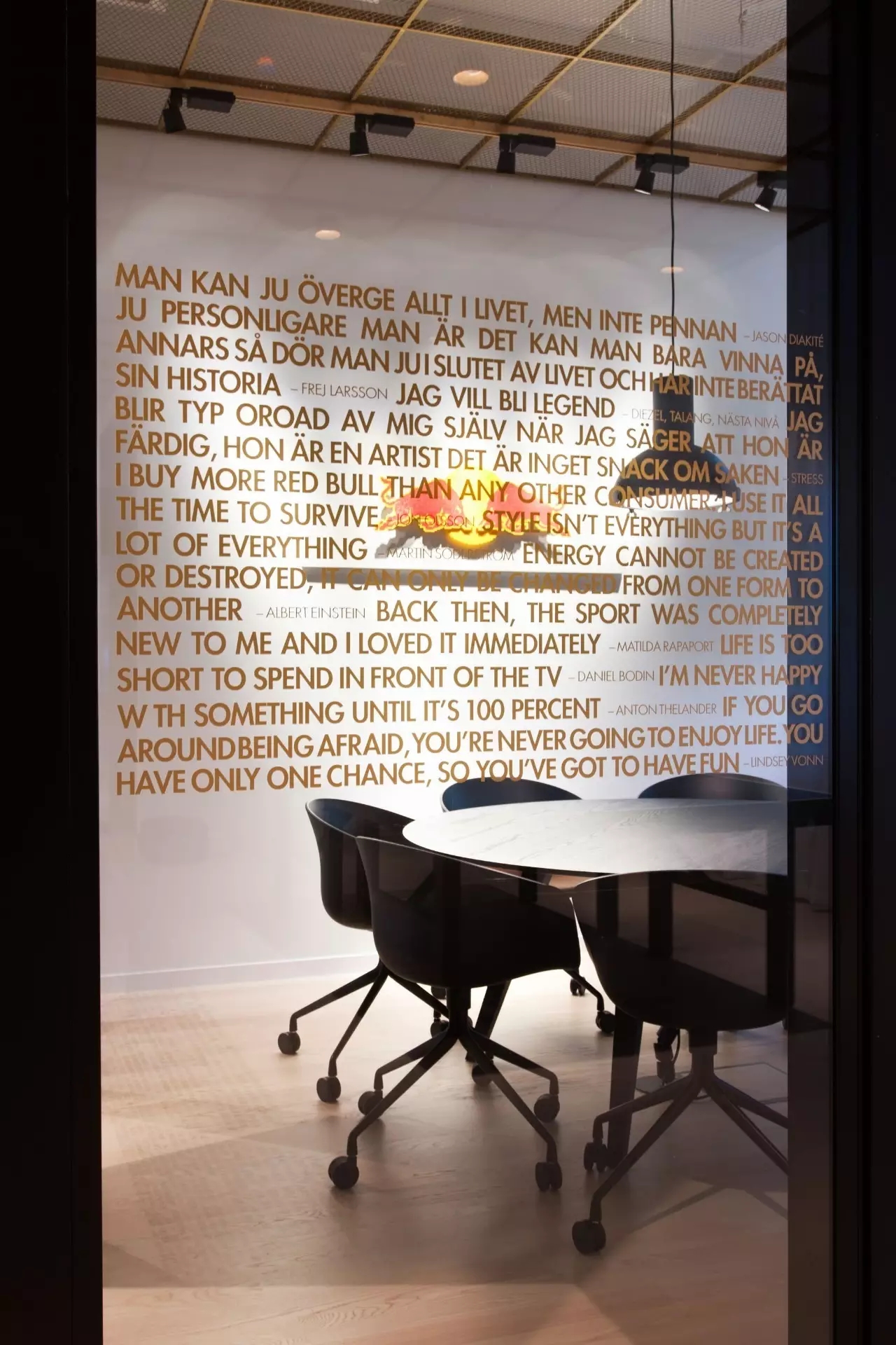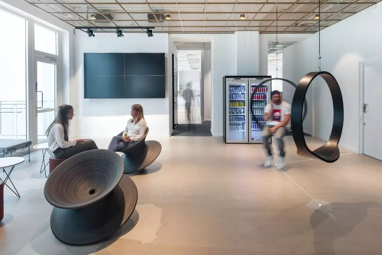 该项目的设计灵感来源于红牛的企业精神和标志,设计师将阳光、菱形、公牛和字体作为主要设计元素。大量的皮革家具代表公牛,圆形家具则寓意着阳光,而带有菱形图案的家具、地毯以及附有字体的丝网印刷玻璃都体现了红牛品牌标识中的菱形元素,为人们营造出一种唯美、和谐的感觉。白色作为室内的背景色,得到大面积运用,时尚且浪漫,不禁让人联想起地处北欧的斯德哥尔摩这里常常是一片冰雪的天地,设计师寻求的正是这样一种天然寂静和唯美浪漫的感觉。整个室内采用褐色作为点缀色,低调优雅。在褐色接待台的上方,醒目地标识着金色的红牛公司LOGO。蓝色和黄色作为互补色,不仅给人带来视觉上的冲击,更是为空间增添了生机与活力。