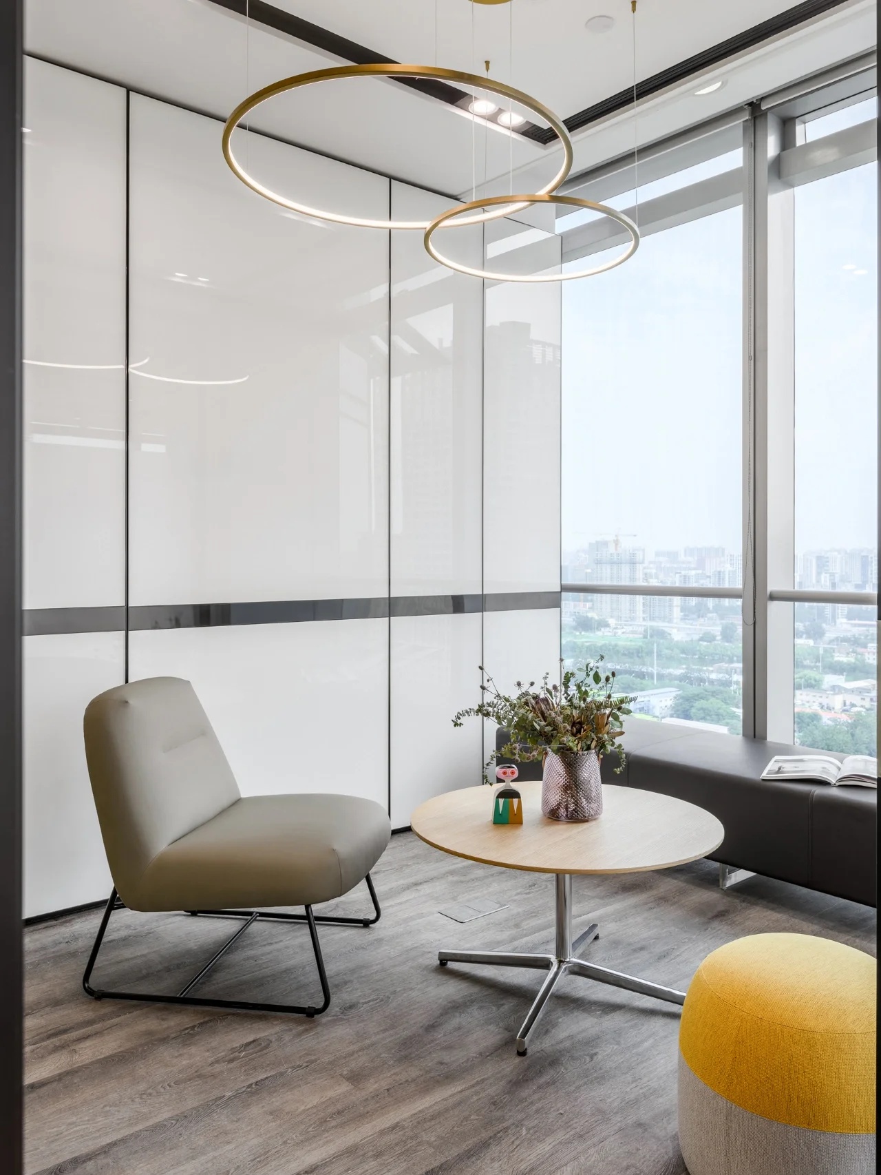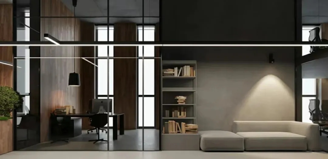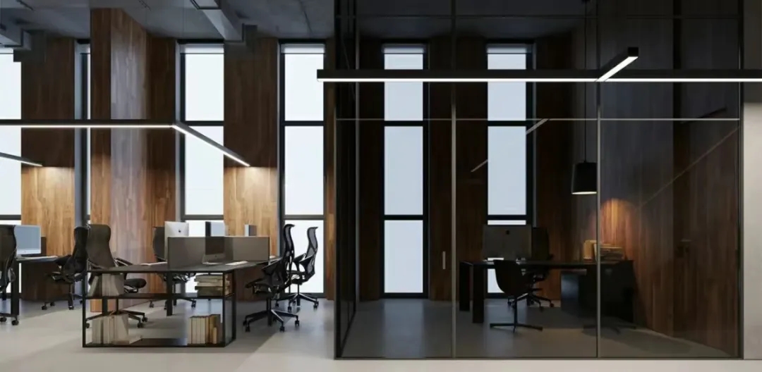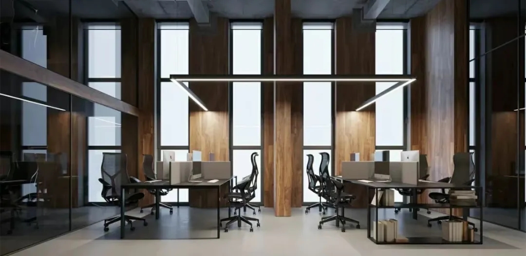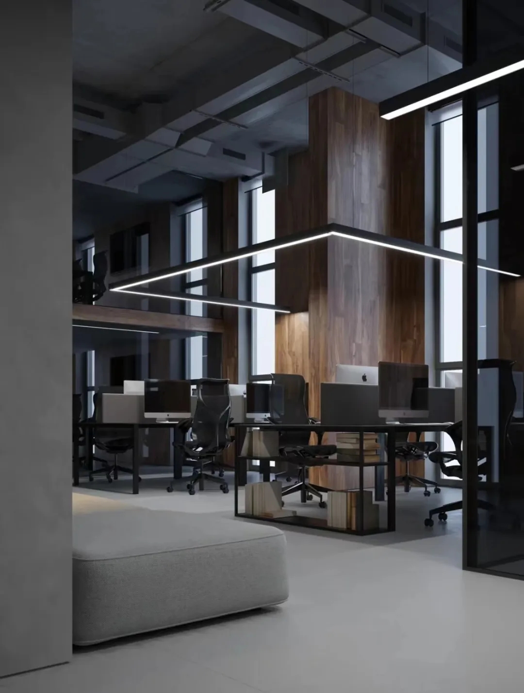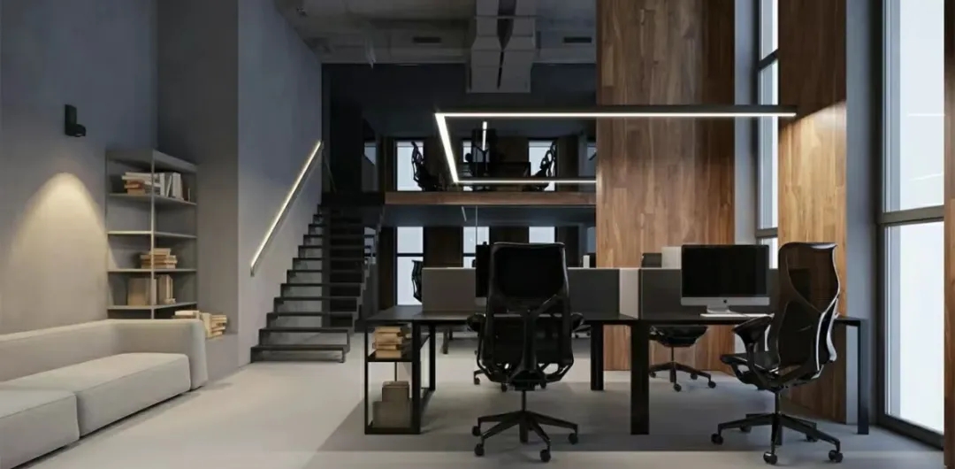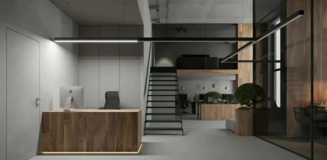 该案例为一个L型500㎡的办公空间,考虑到办公日常需求,设计师在布局方面将部分空间改为双层,将空间利用最大化来满足日常办公的需求在材料方面,地面统一采用了灰色的水磨石,墙面和隔断则采用仿木地板拼装。