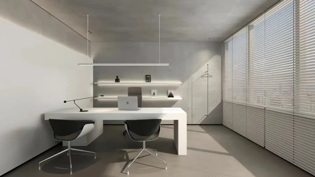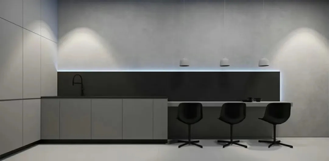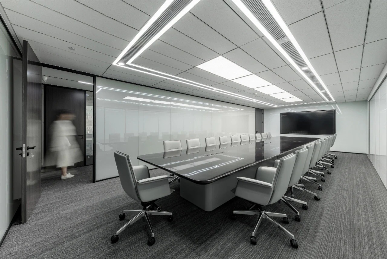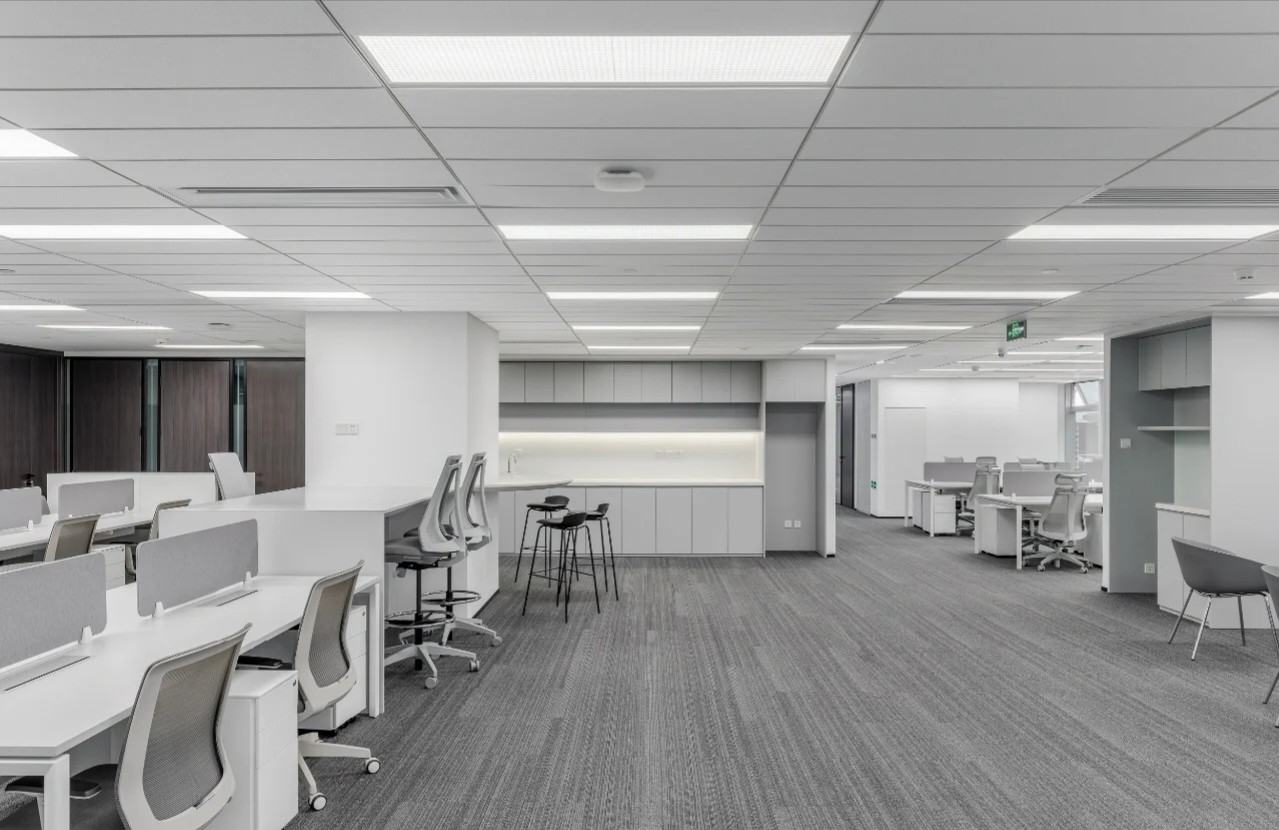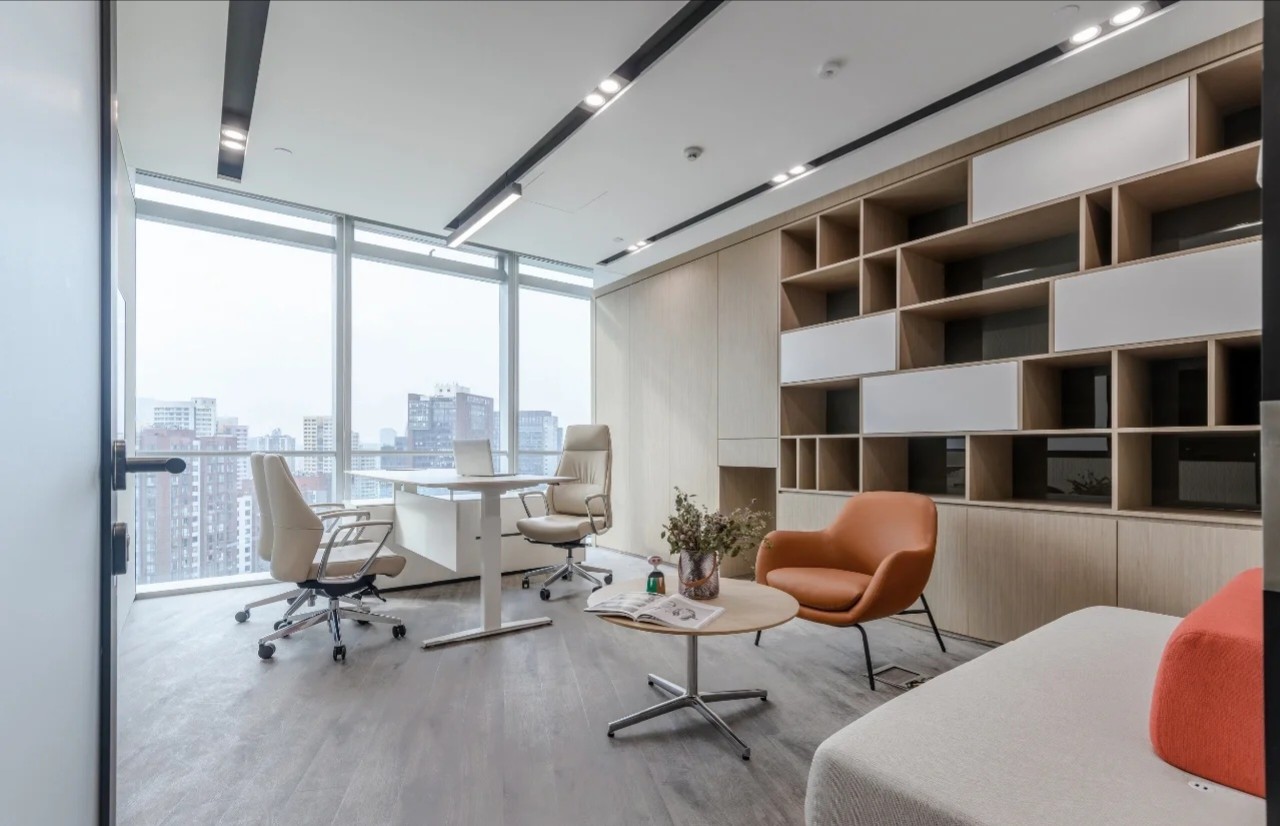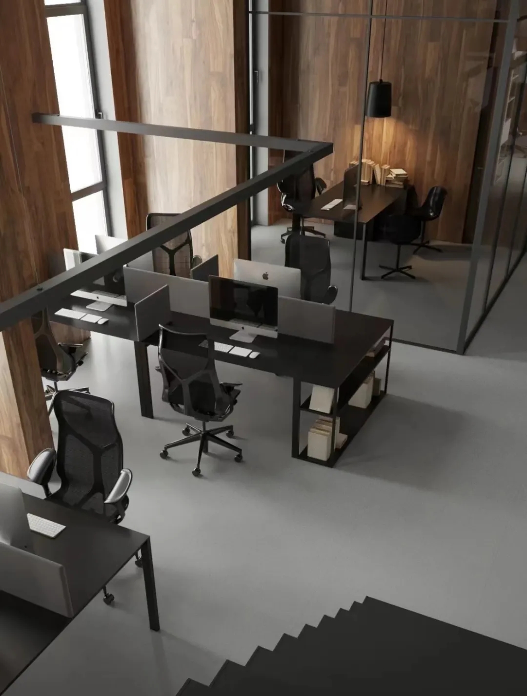 该案例为一个L型500㎡的办公空间,考虑到办公日常需求,设计师在布局方面将部分空间改为双层,将空间利用最大化来满足日常办公的需求在材料方面,地面统一采用了灰色的水磨石,墙面和隔断则采用仿木地板拼装。