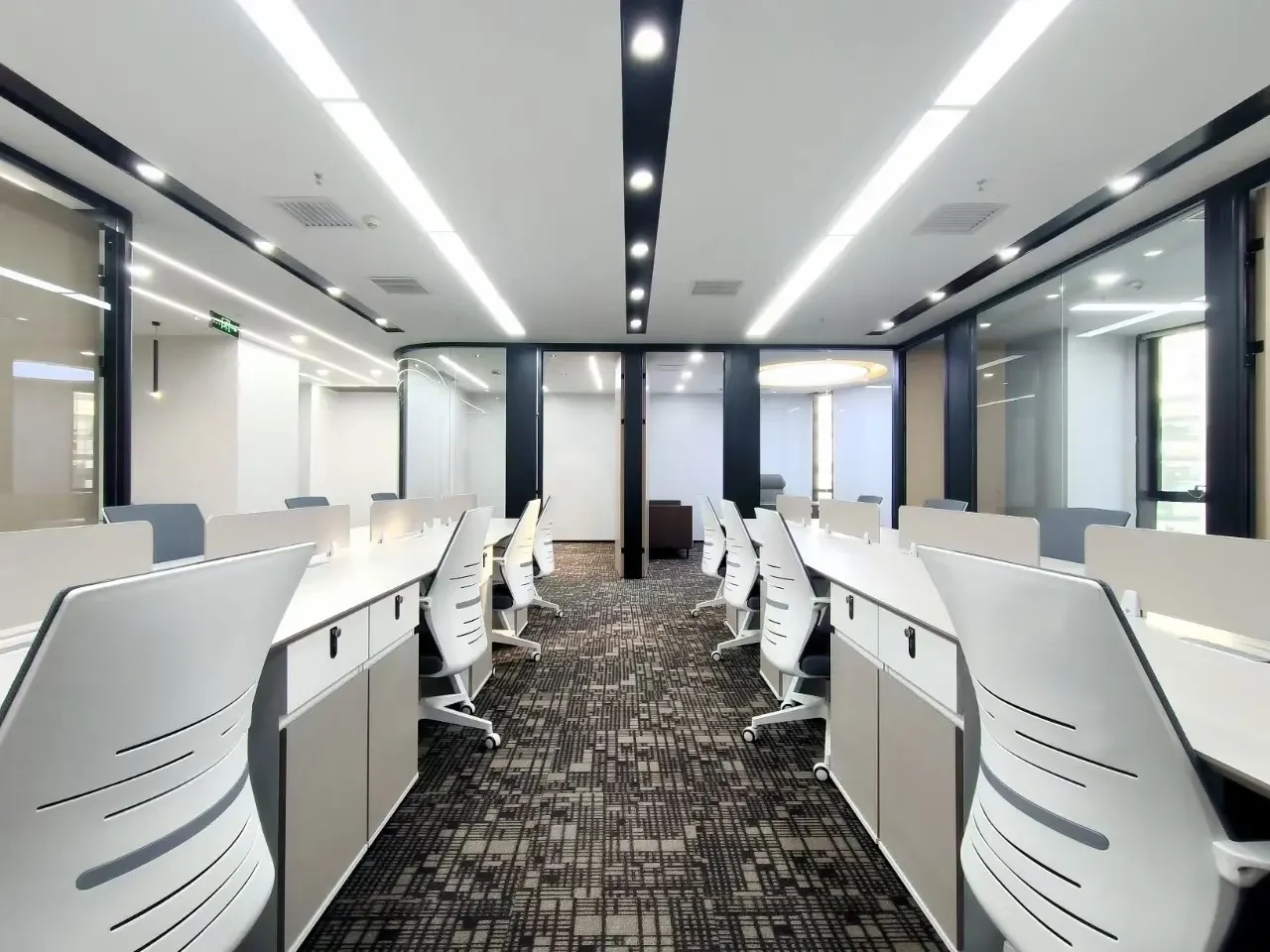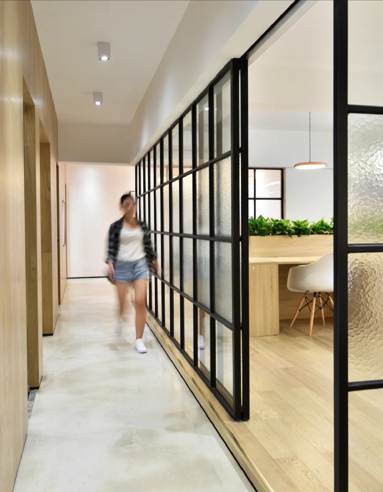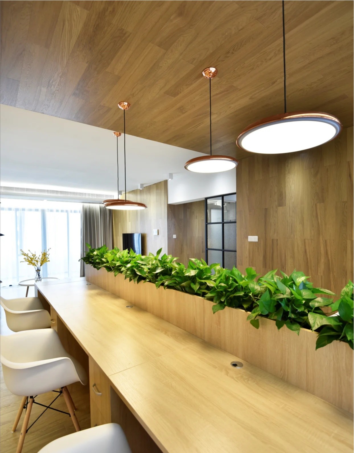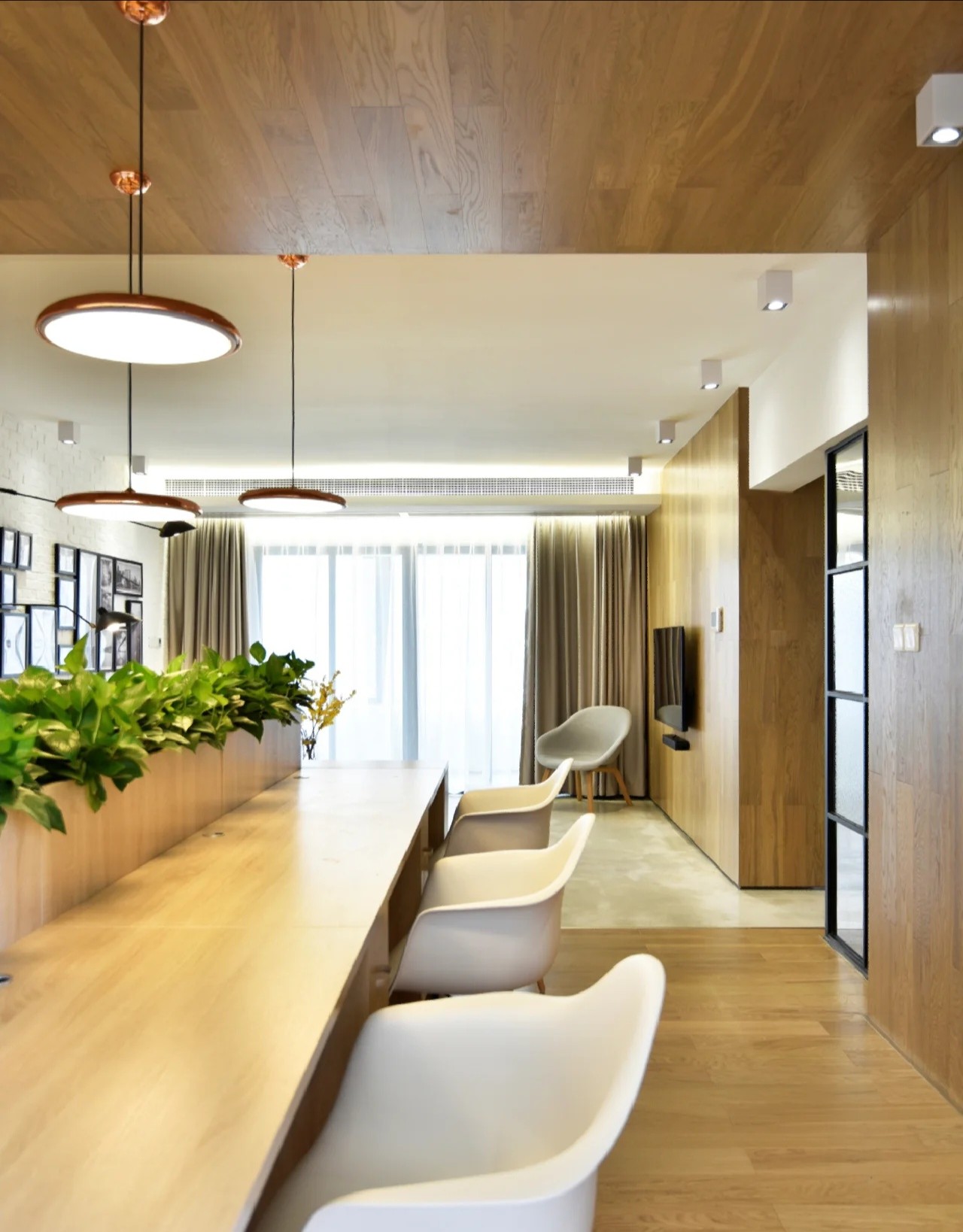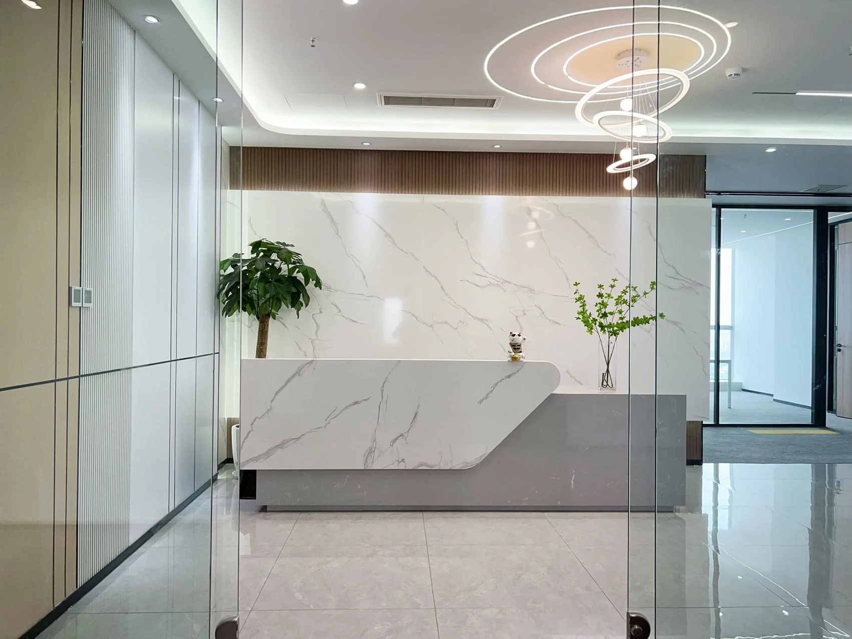 前台设计秉持着内外界限相融的概念,使外部空间向内渗透同时内部空间向外延伸,相互作用形成空间的延续。一缕阳光洒进室内,接收来自大自然满满的能量,使整个空间朝气蓬勃。办公区风格秉承现代时尚简约的设计语言,力求凸显力量与空间质感。开放办公区顺畅流转,让自由感在空间中流动,极大地方便使用者的协作与交流。通过简约的空间设计发挥出极强的表现力,让功能与视觉表达相一致,清爽大方地出现在视线之内,传达出设计的真实。