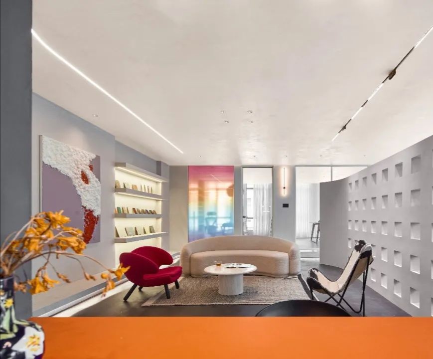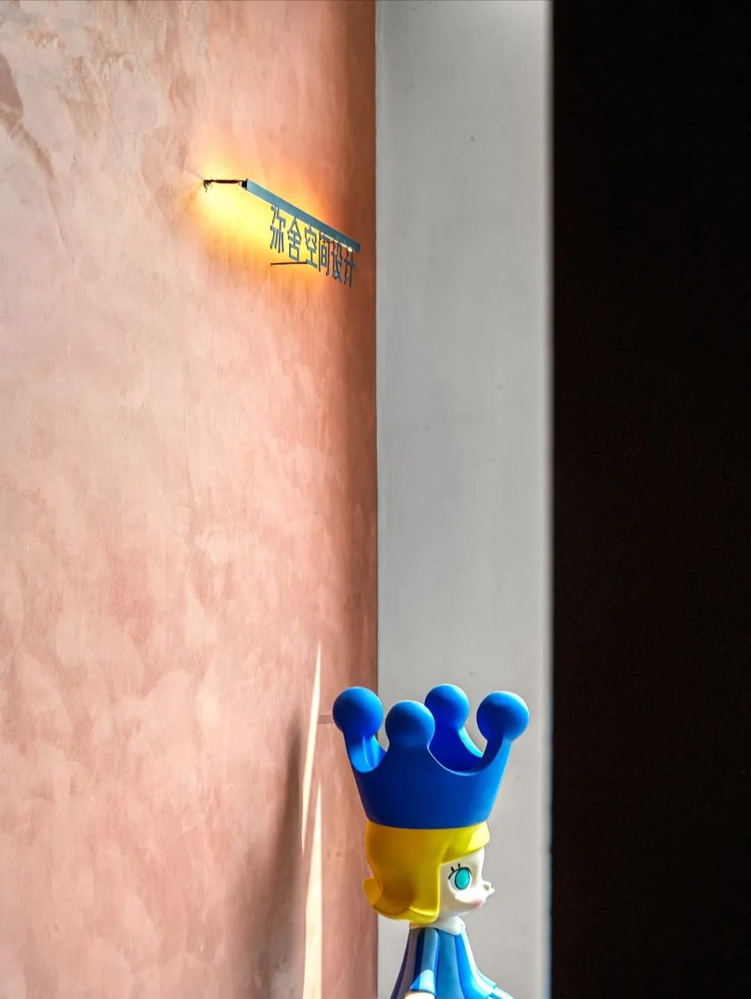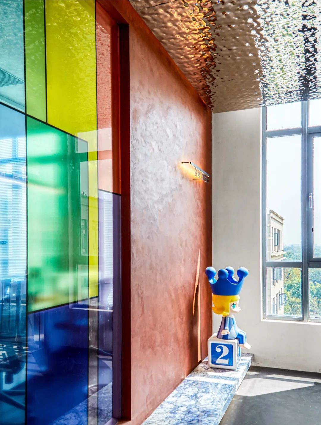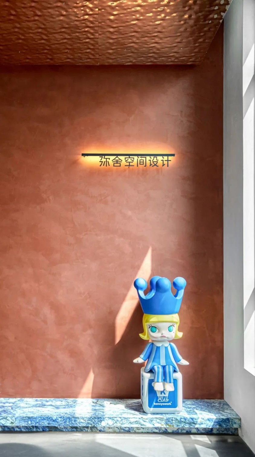 门厅处的手办、加上砖红色微水泥、搭配宝石蓝奢石以及顶面的浪纹板,给人眼前一亮。将趣味和艺术融入办公空间,给人松弛的工作状态,也让来访者感受到轻松的氛围。