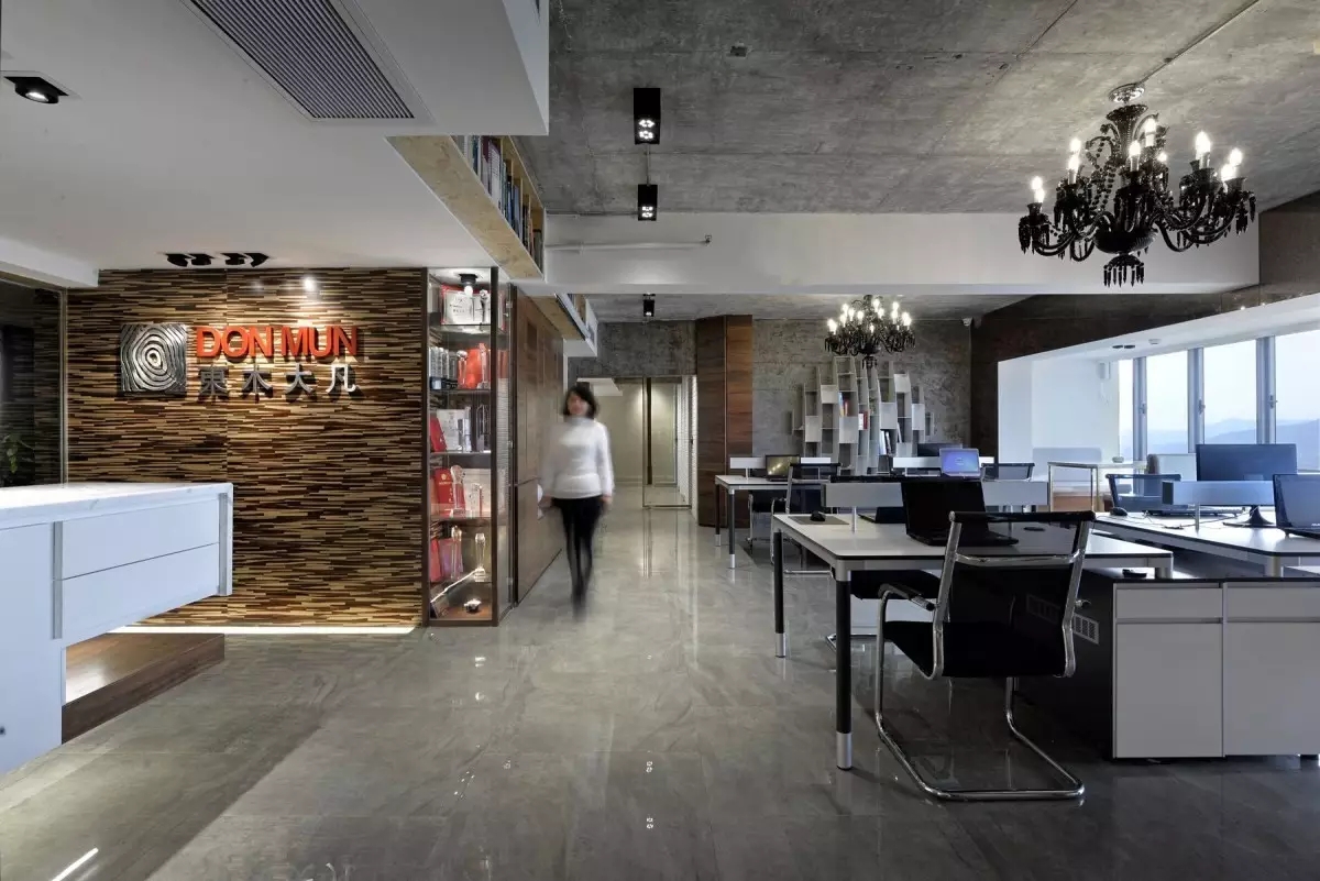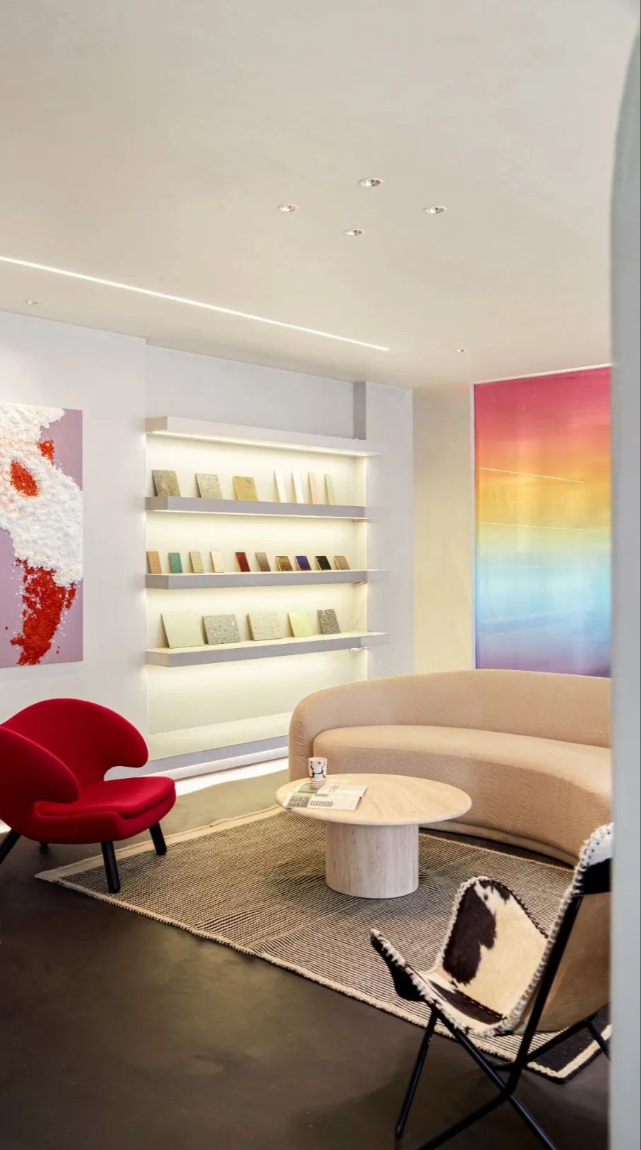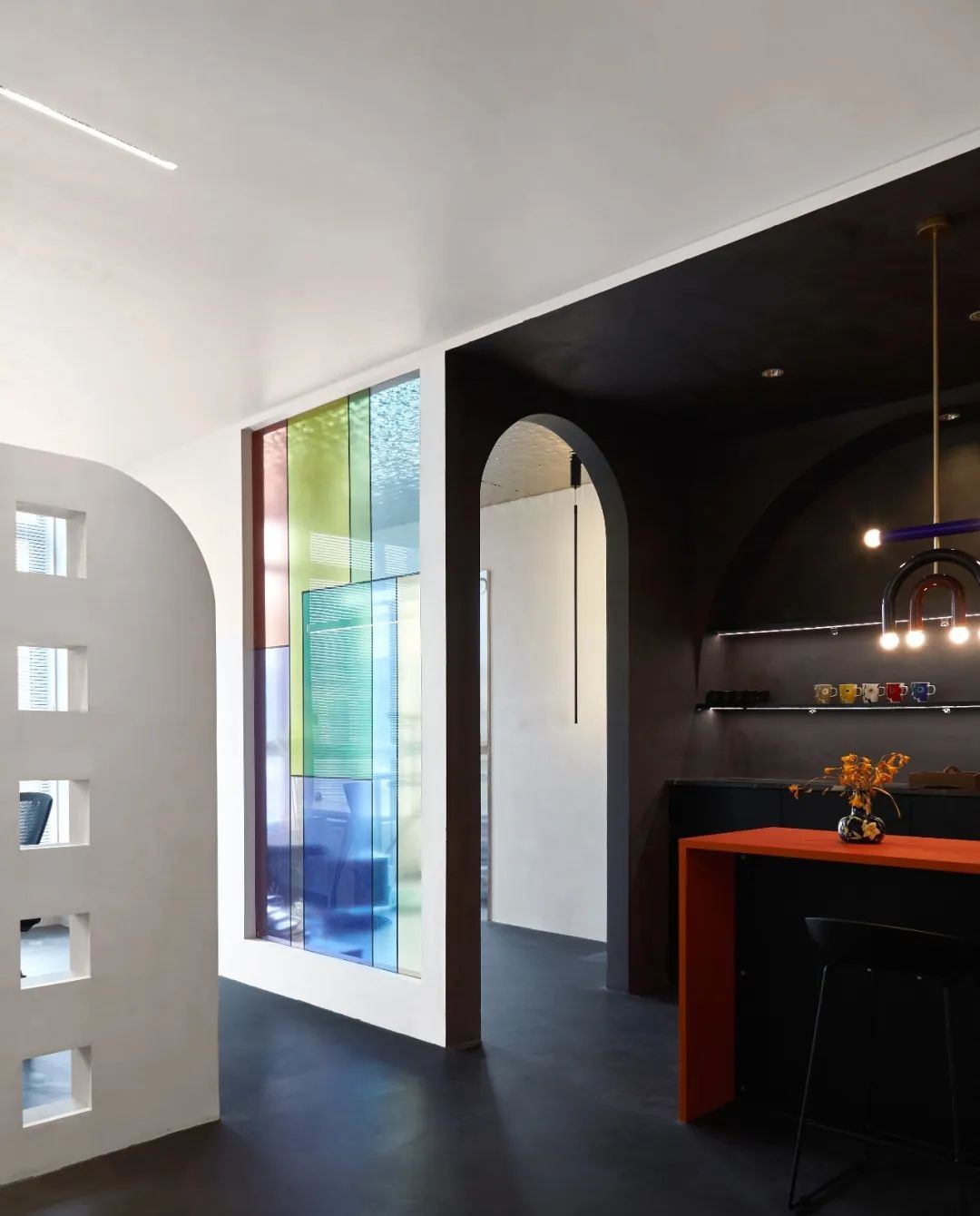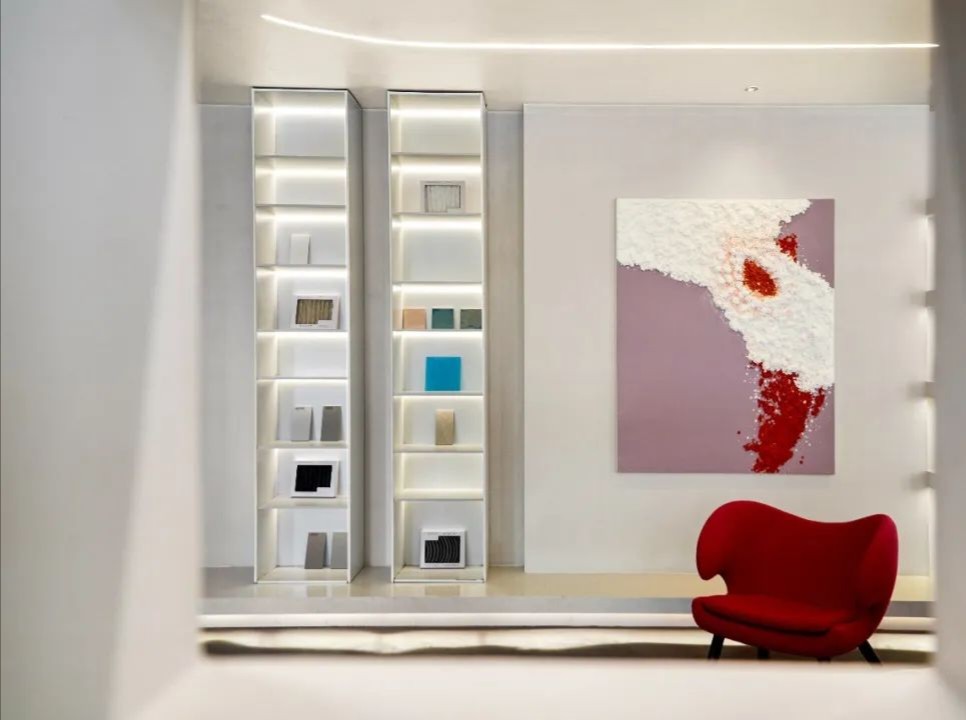 门厅处的手办、加上砖红色微水泥、搭配宝石蓝奢石以及顶面的浪纹板,给人眼前一亮。将趣味和艺术融入办公空间,给人松弛的工作状态,也让来访者感受到轻松的氛围。