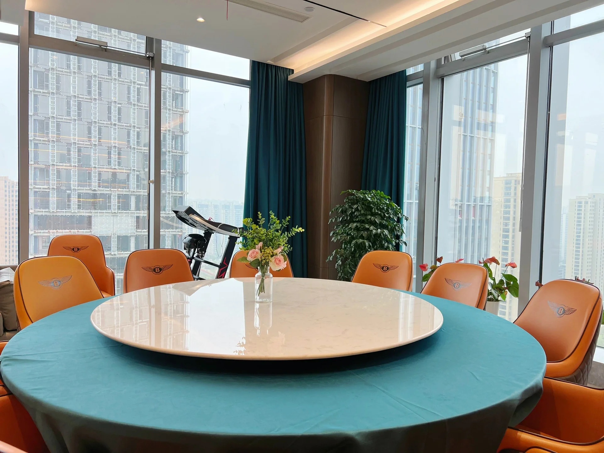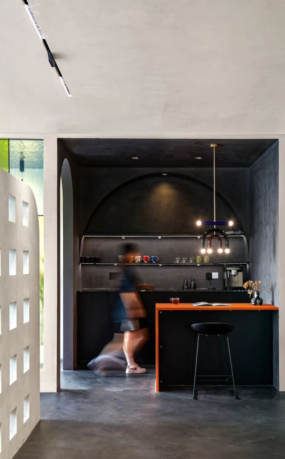 暗色系的水吧区有一抹橙色,让人眼前一亮。增加了吧台桌椅,也可以一桌多用:用餐、洽谈、下午茶等,这也是小伙伴们最喜欢的区域。