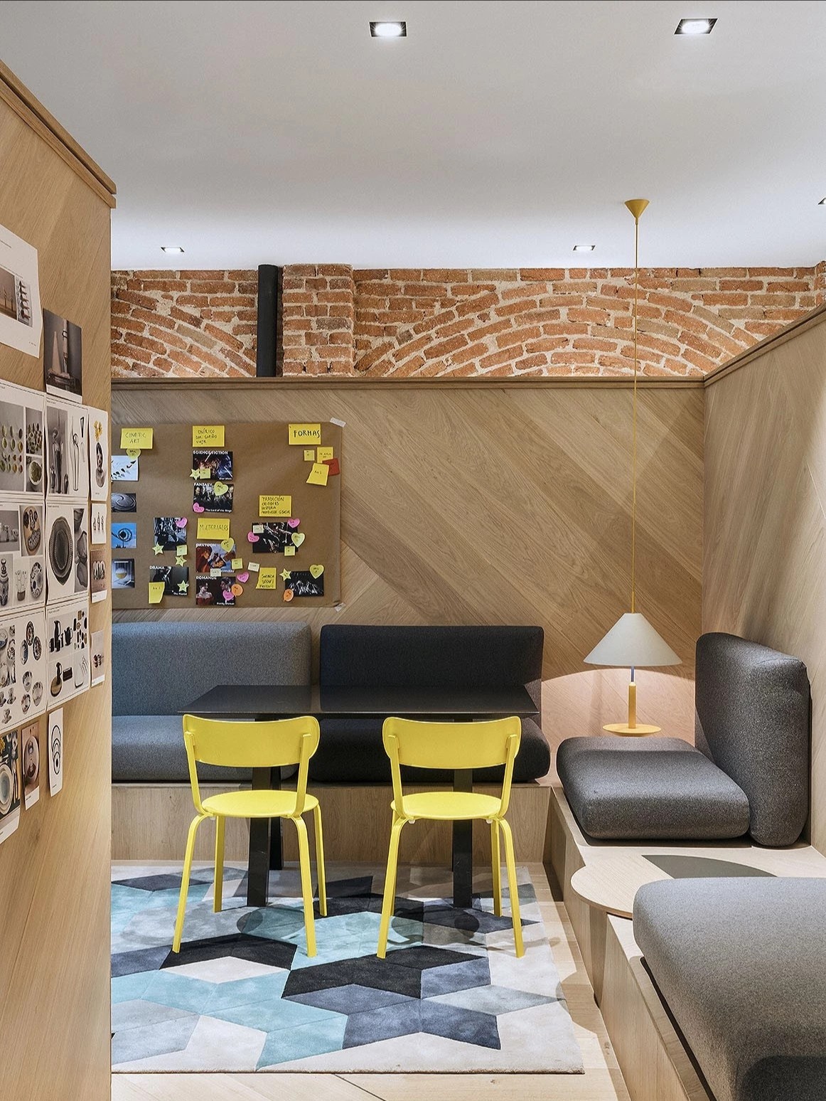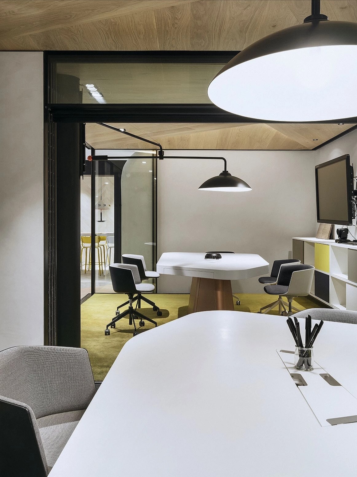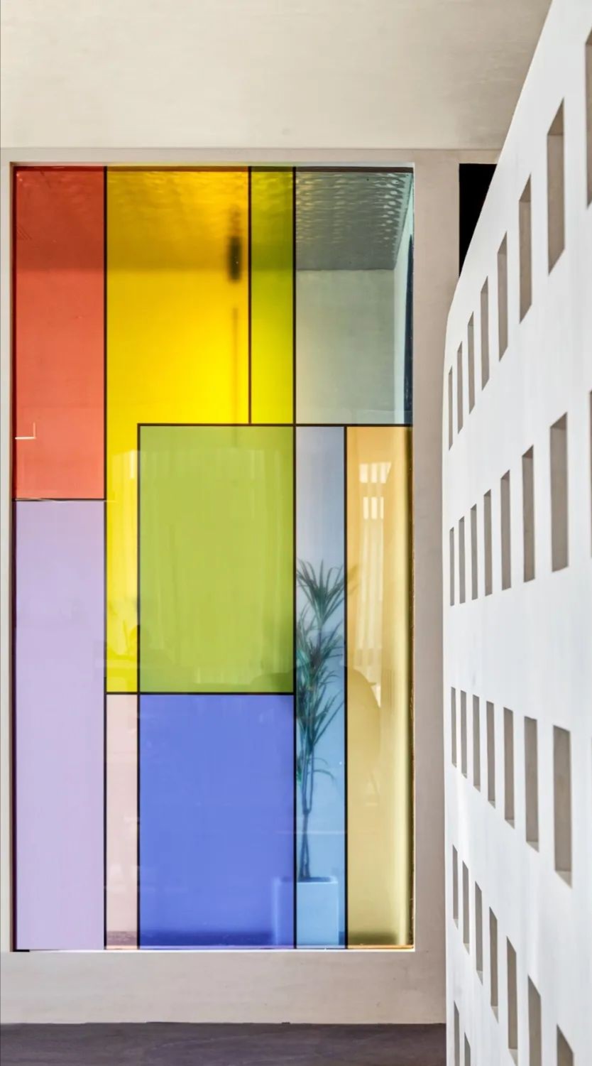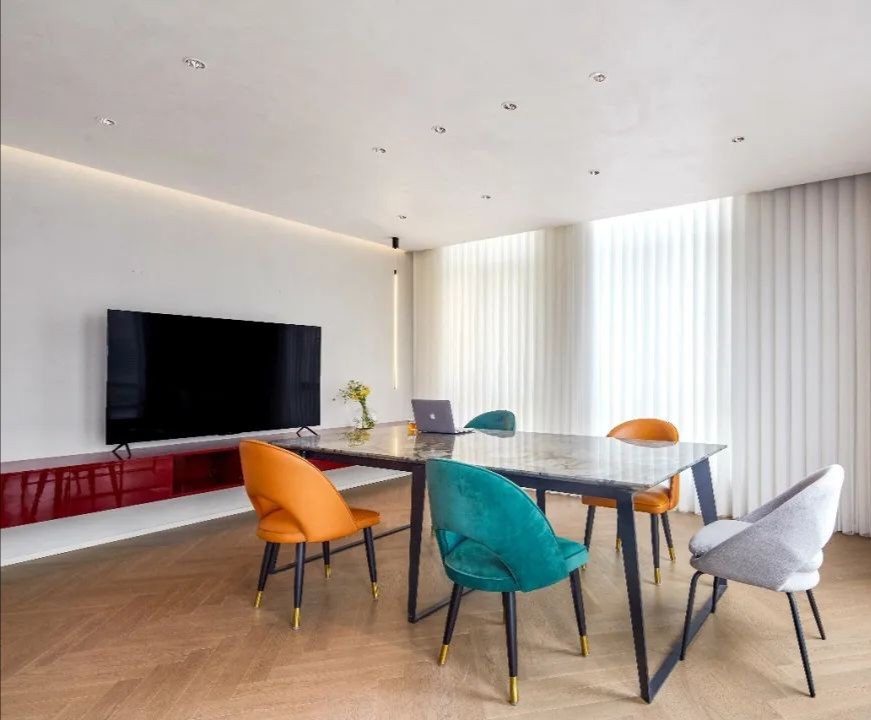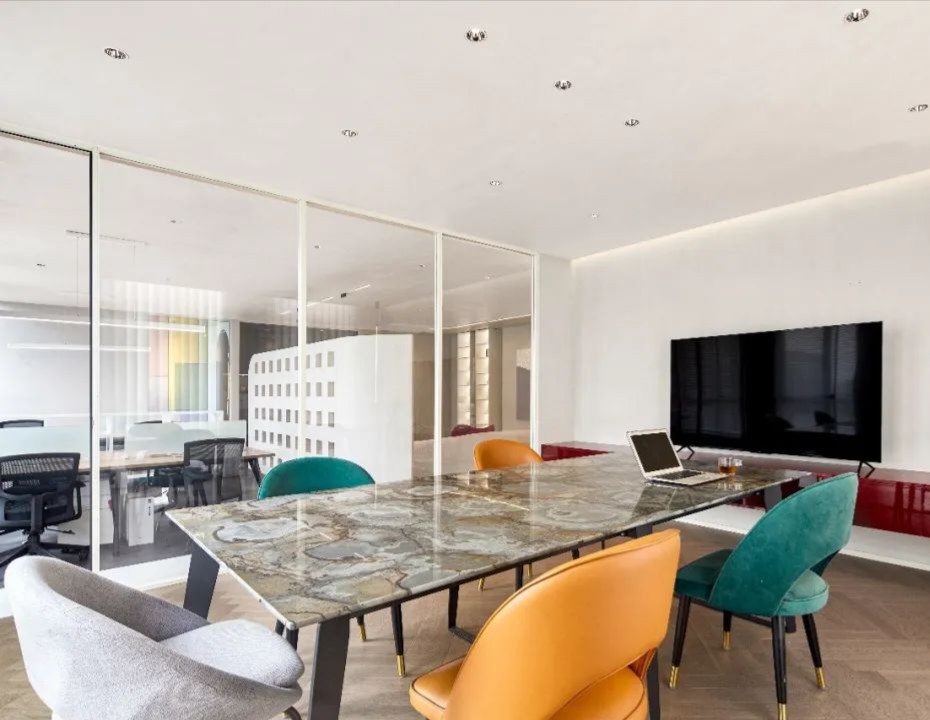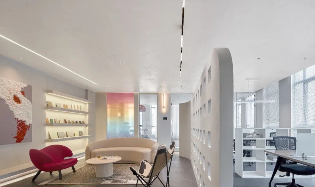 洽谈室是企业进行小范围洽谈、讨论的场所,通常是私密的交流空间。集中的场域,色彩的趣味切割、和畅意书写的玻璃白板,让与会双方能够放松下来,畅所欲言。