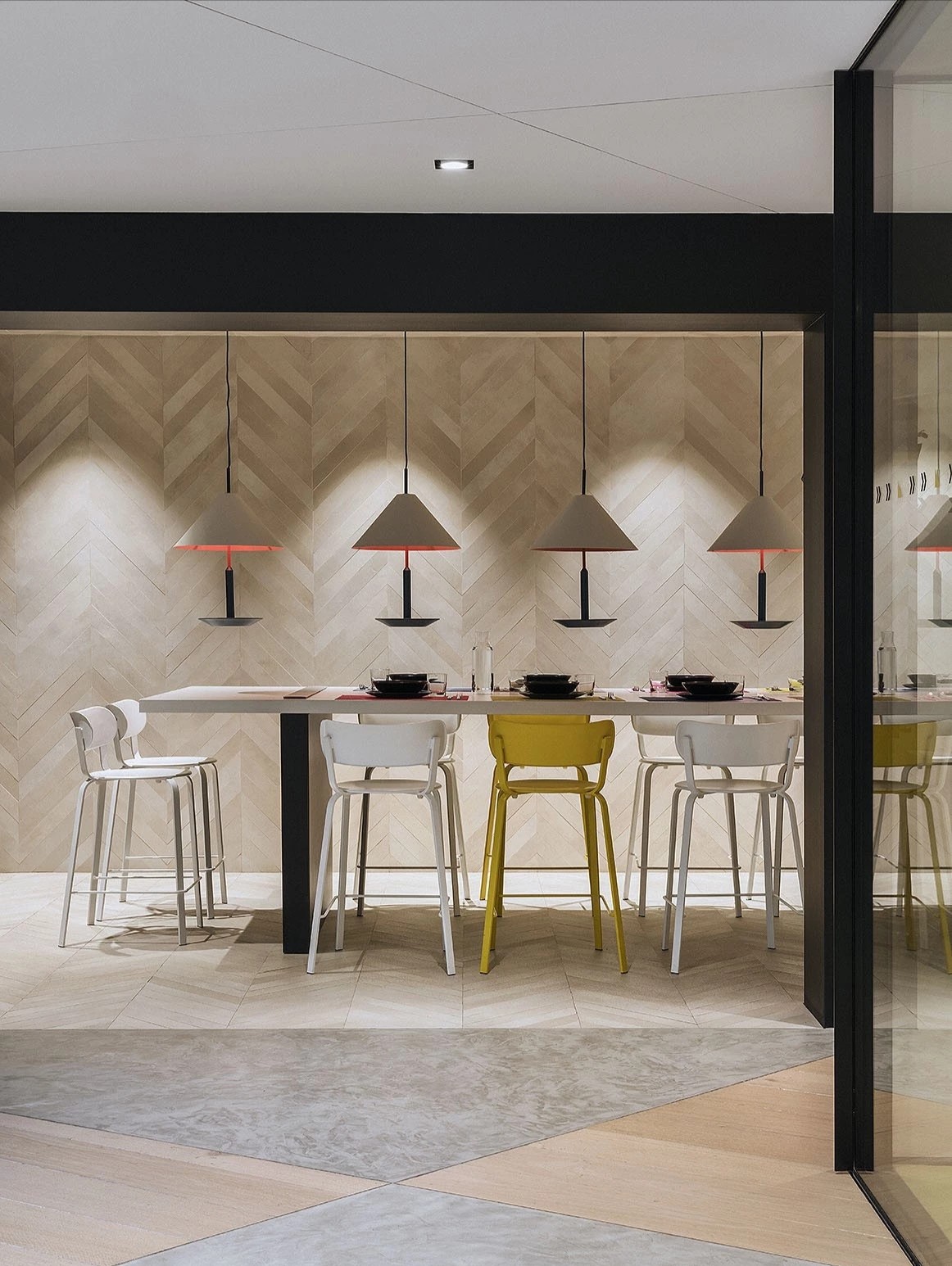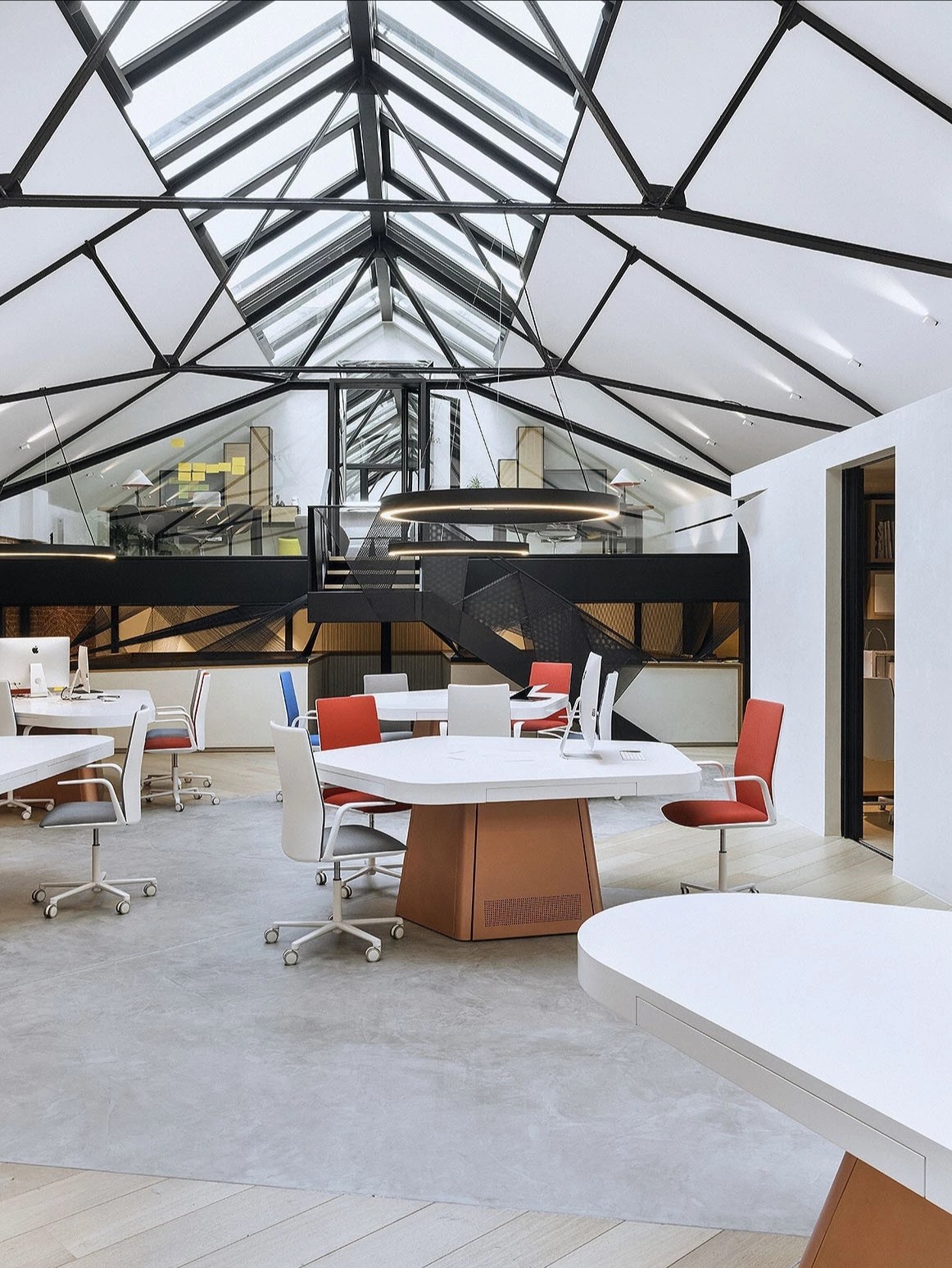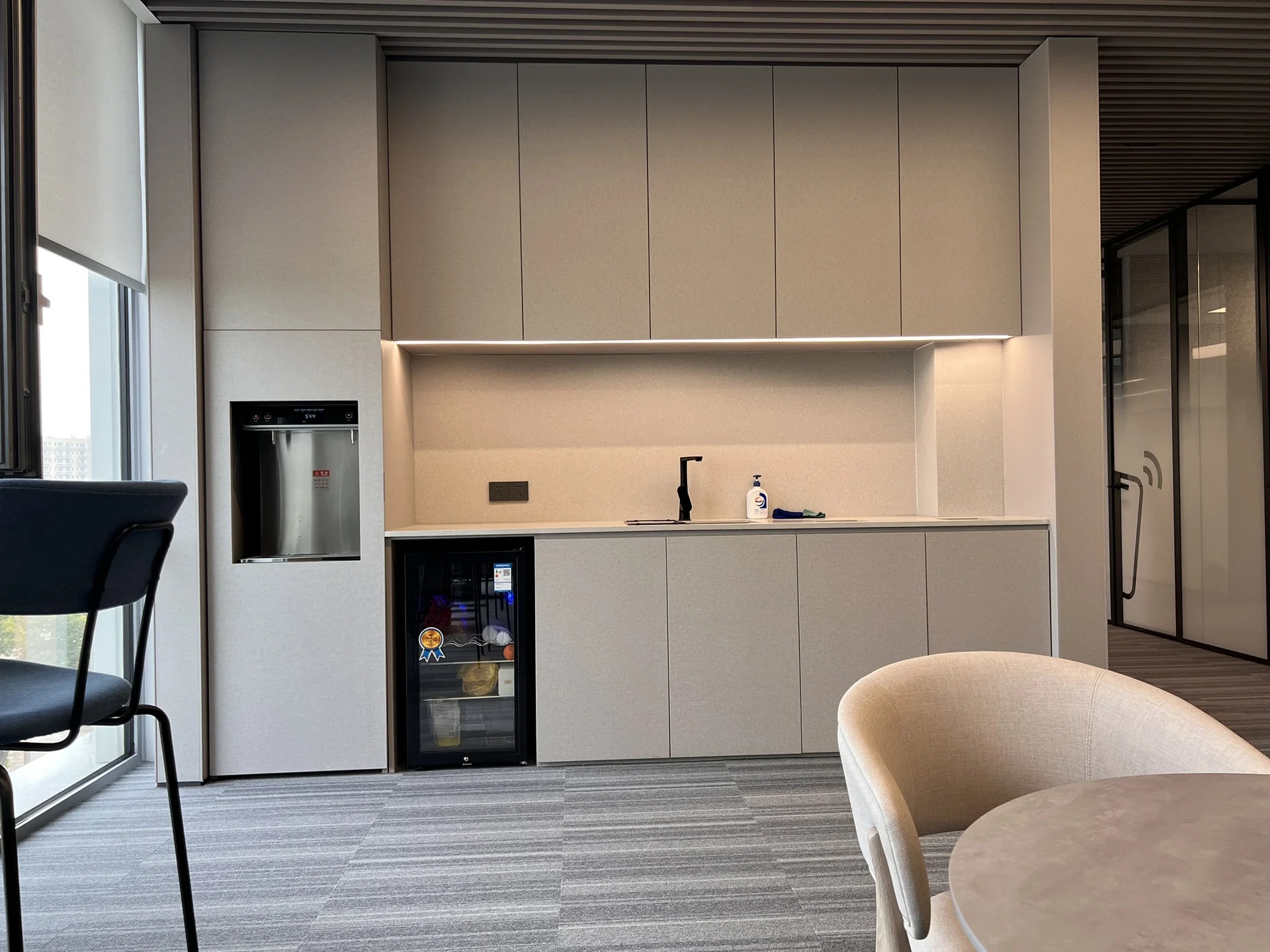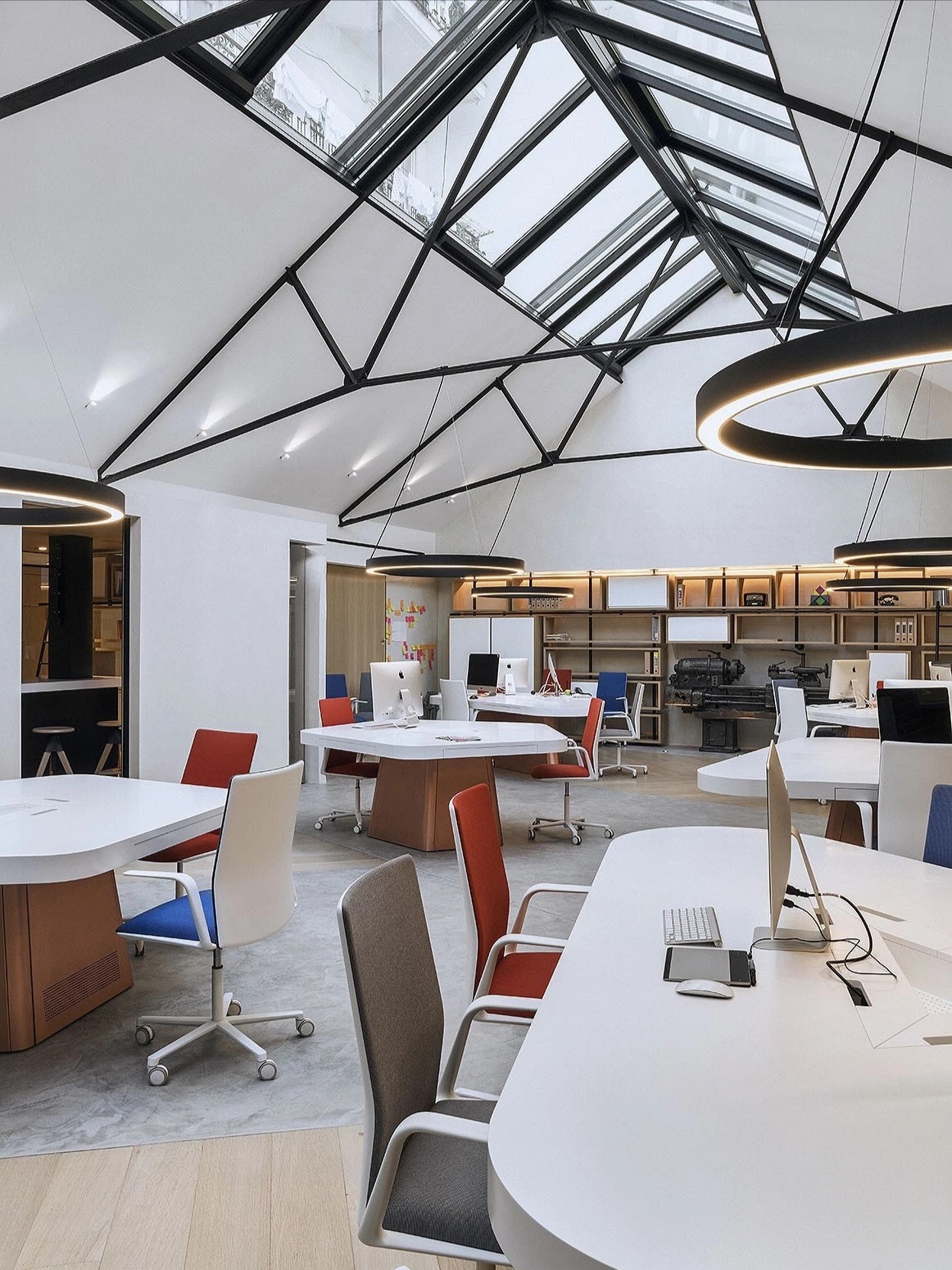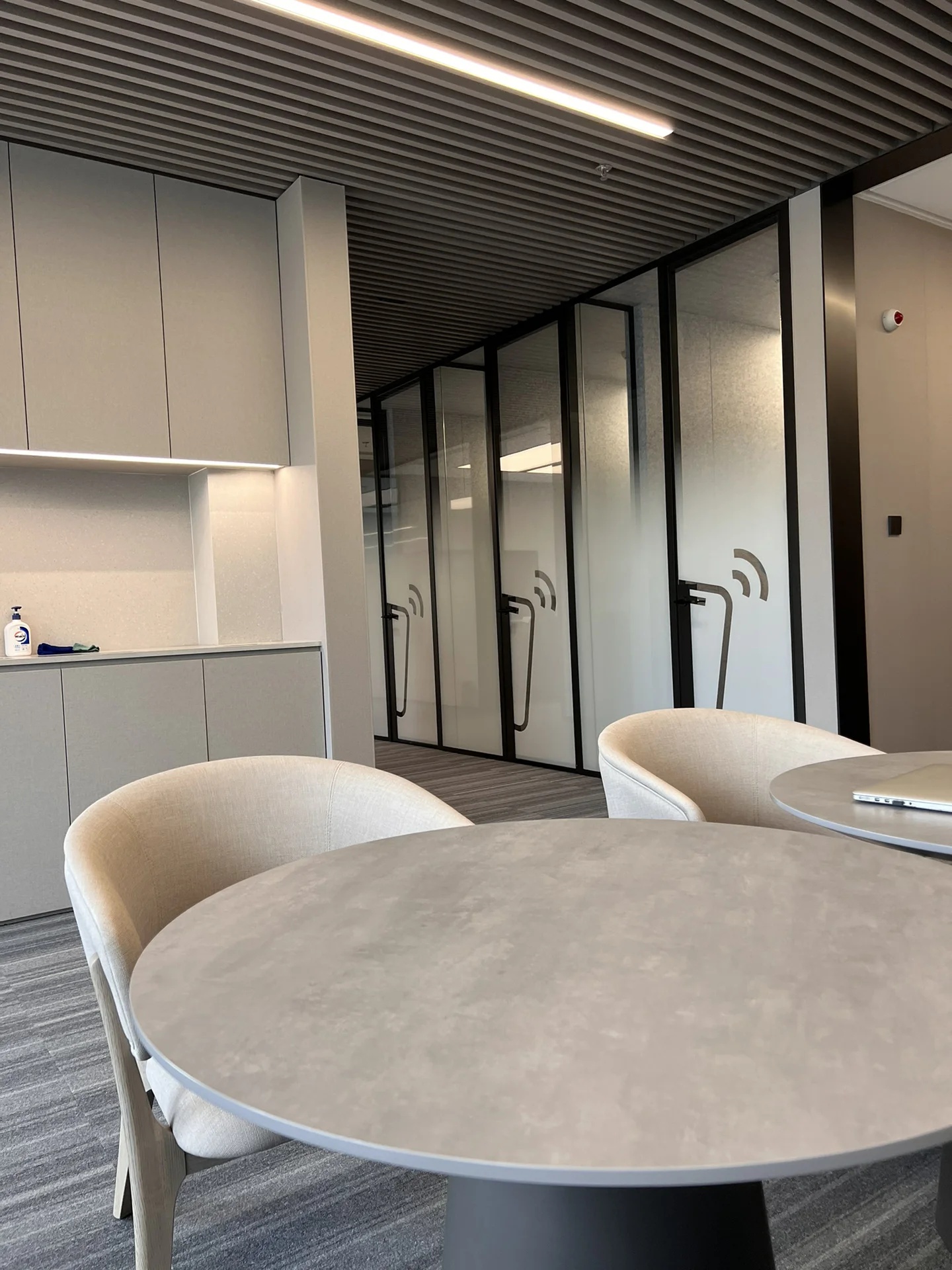 洽谈室是企业进行小范围洽谈、讨论的场所,通常是私密的交流空间。集中的场域,色彩的趣味切割、和畅意书写的玻璃白板,让与会双方能够放松下来,畅所欲言。