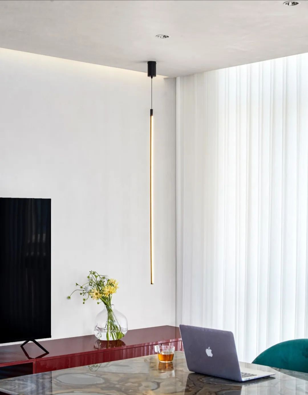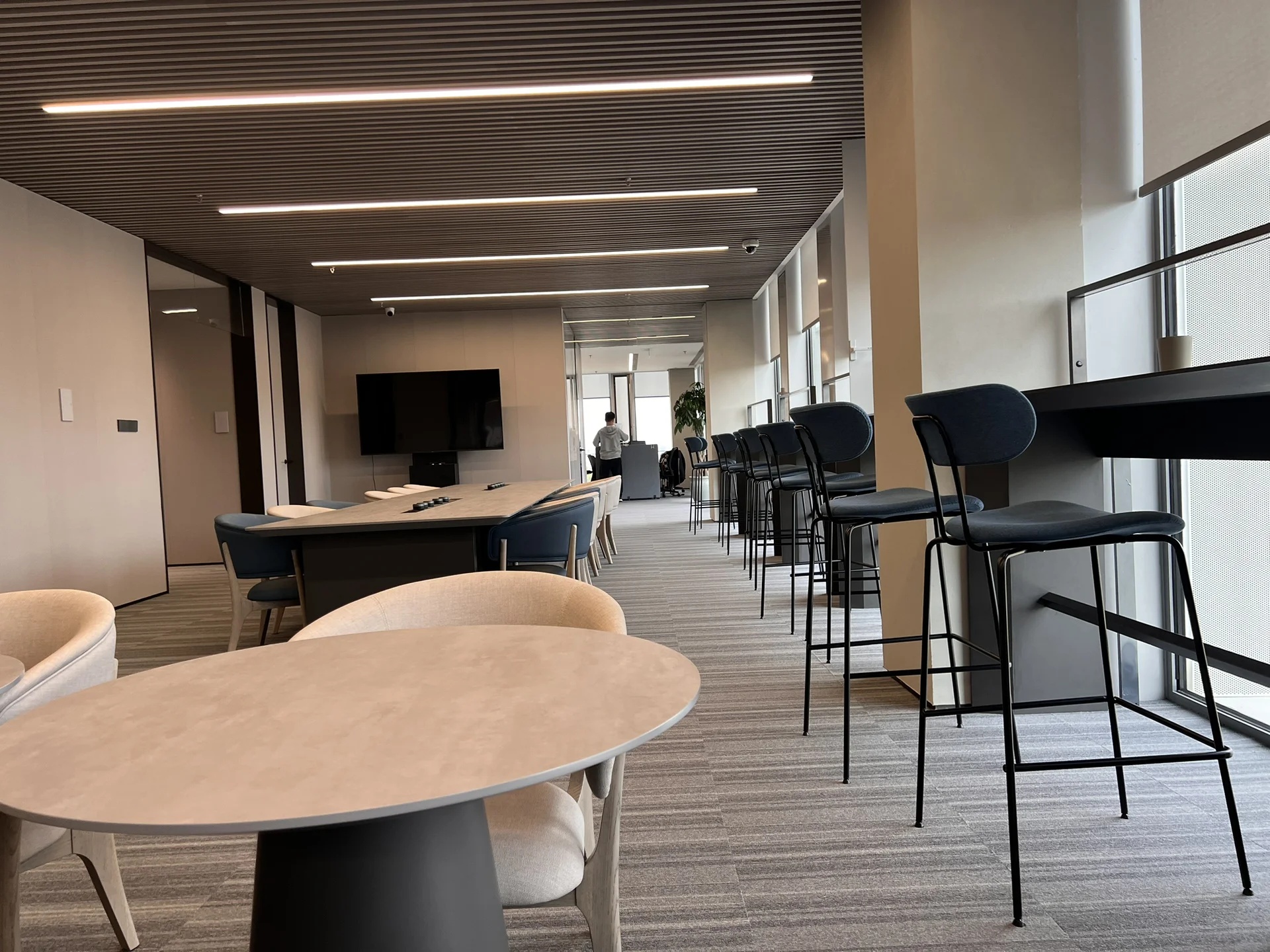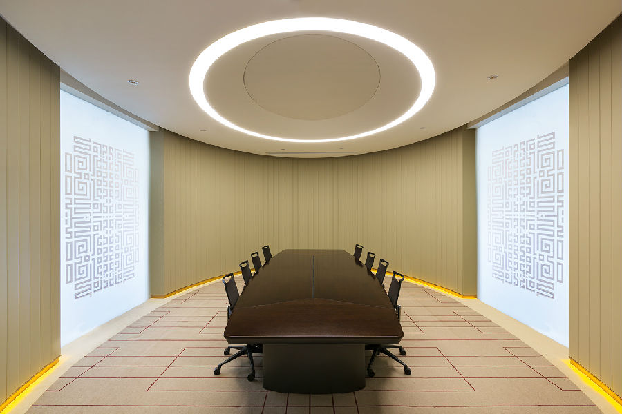 细节上,会议室的灯光设计以会议桌上方的长条形灯柱为主光源,周围加设辅助照明,使人产生中心化和集中感。