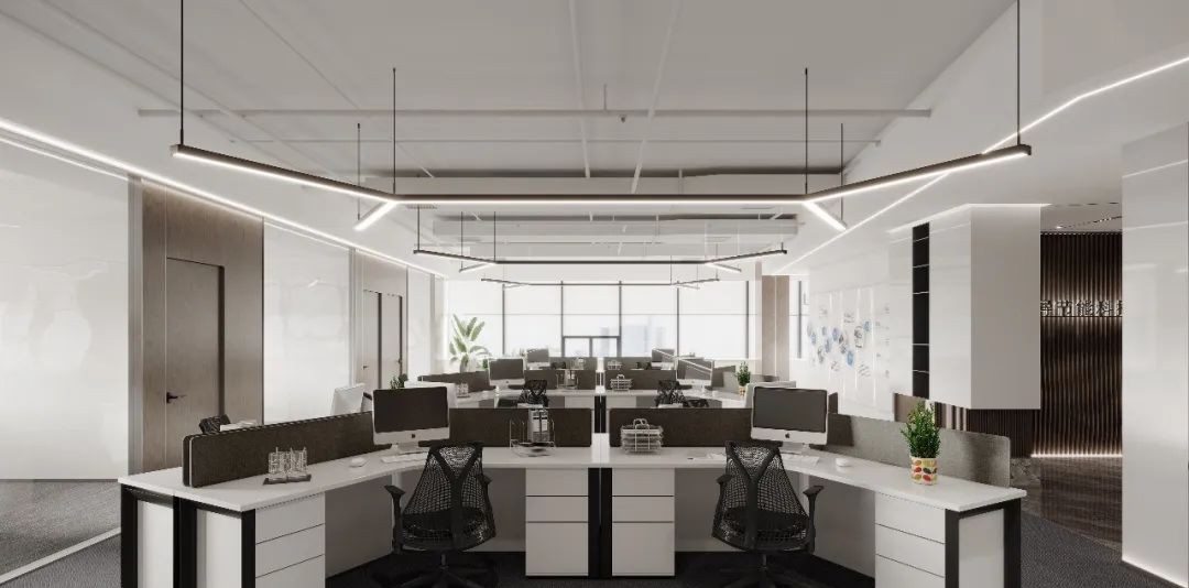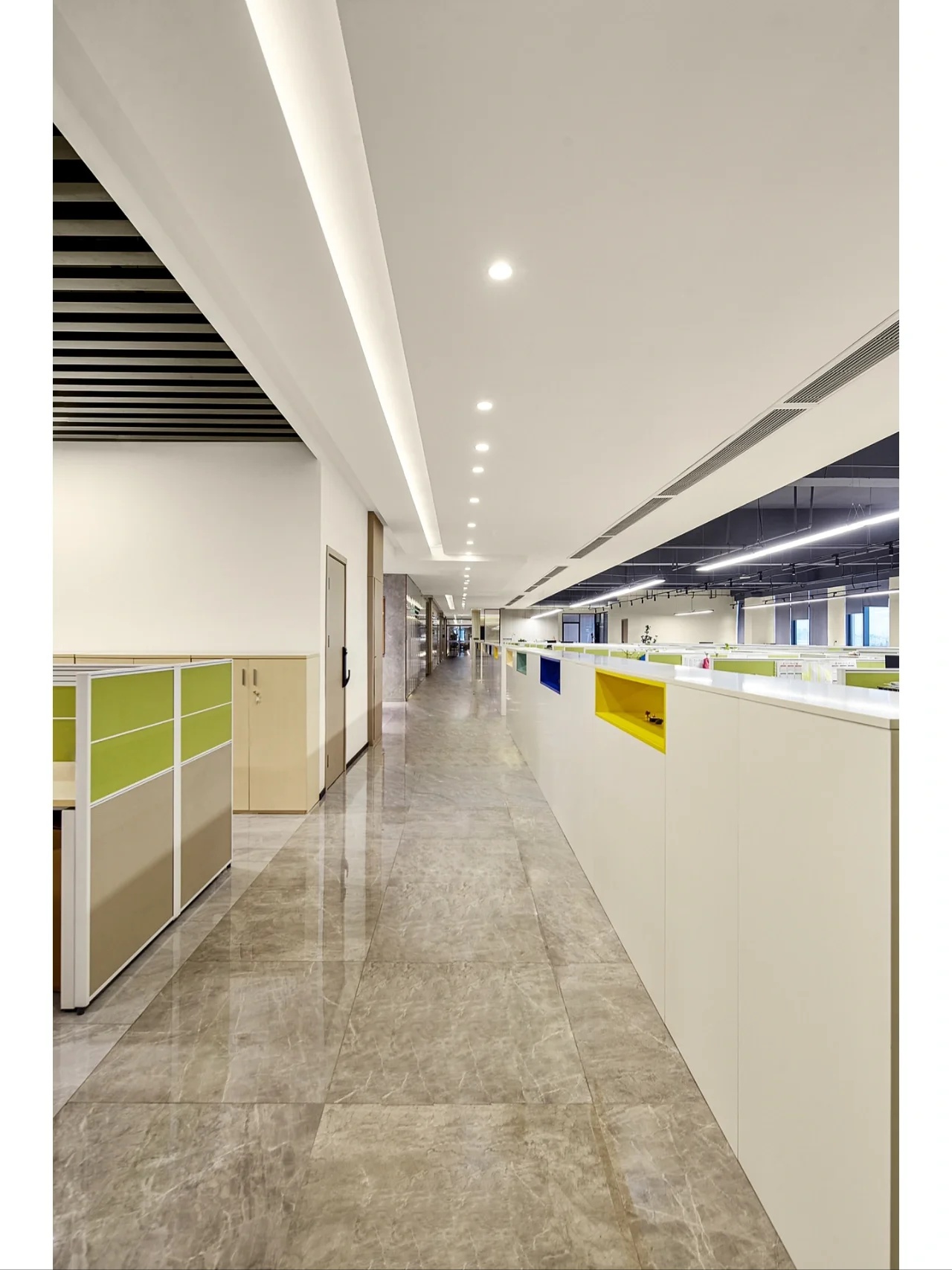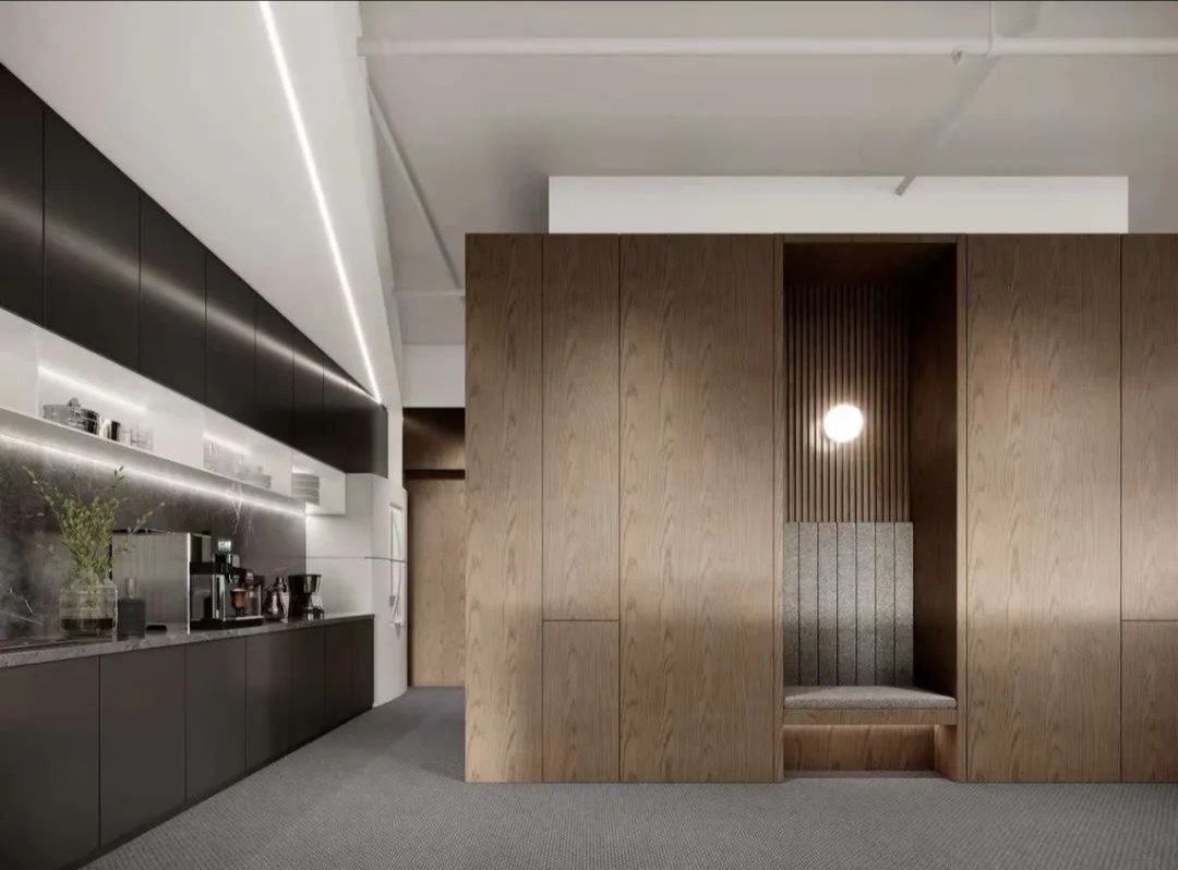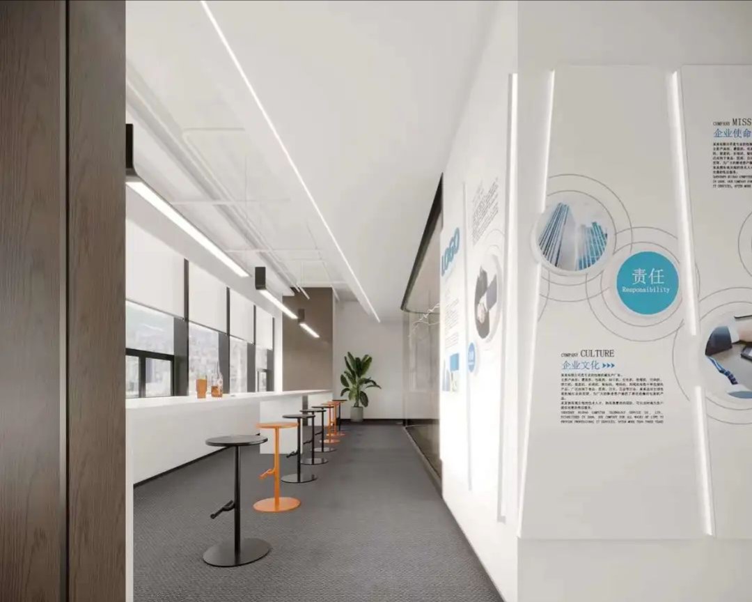 纵深的走廊改为开放式设计,利用顶部的线性灯和点光源,引导着空间的动线走向,给员工和到访者深入探索、沉浸办公的心理感受。