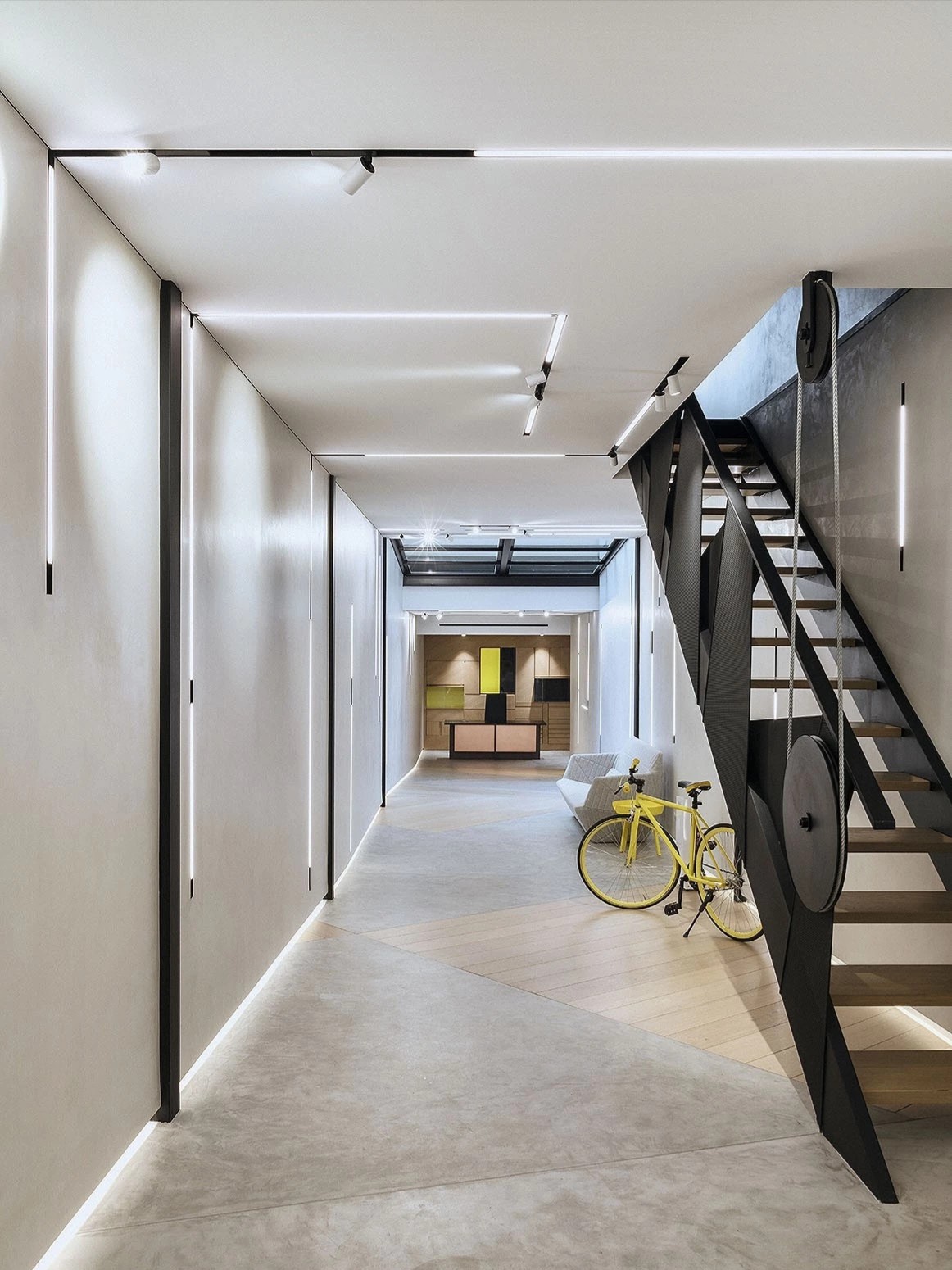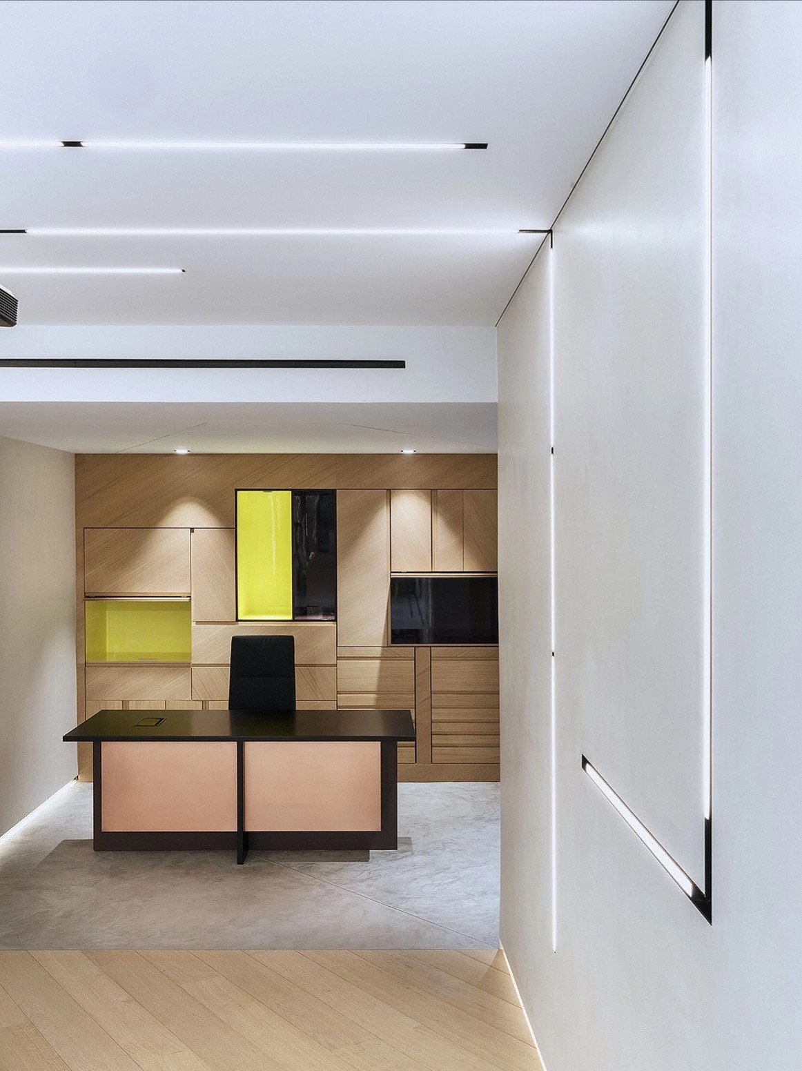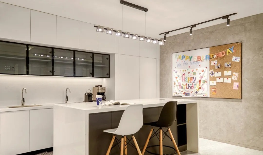 纵深的走廊改为开放式设计,利用顶部的线性灯和点光源,引导着空间的动线走向,给员工和到访者深入探索、沉浸办公的心理感受。