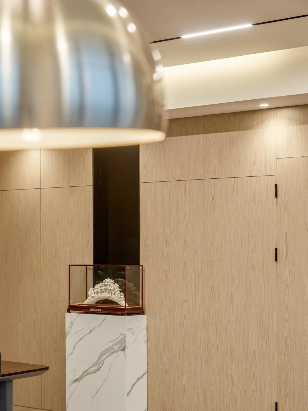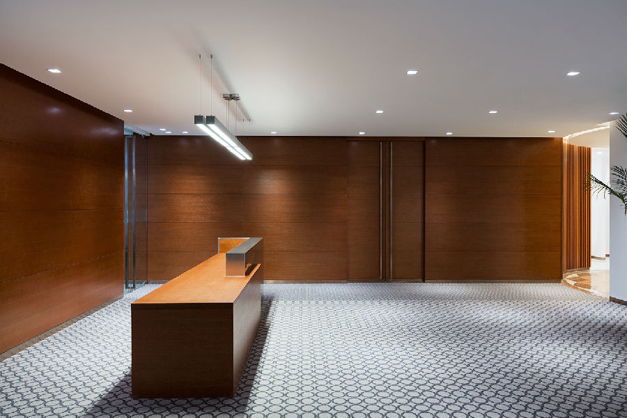 木饰面背景自然方正的形态遵循了理性有序的设计思路,从门厅一直延伸到展示区和办公区,让整个大堂工整之外,又多了延伸的空间感,流畅舒适,收放自如。