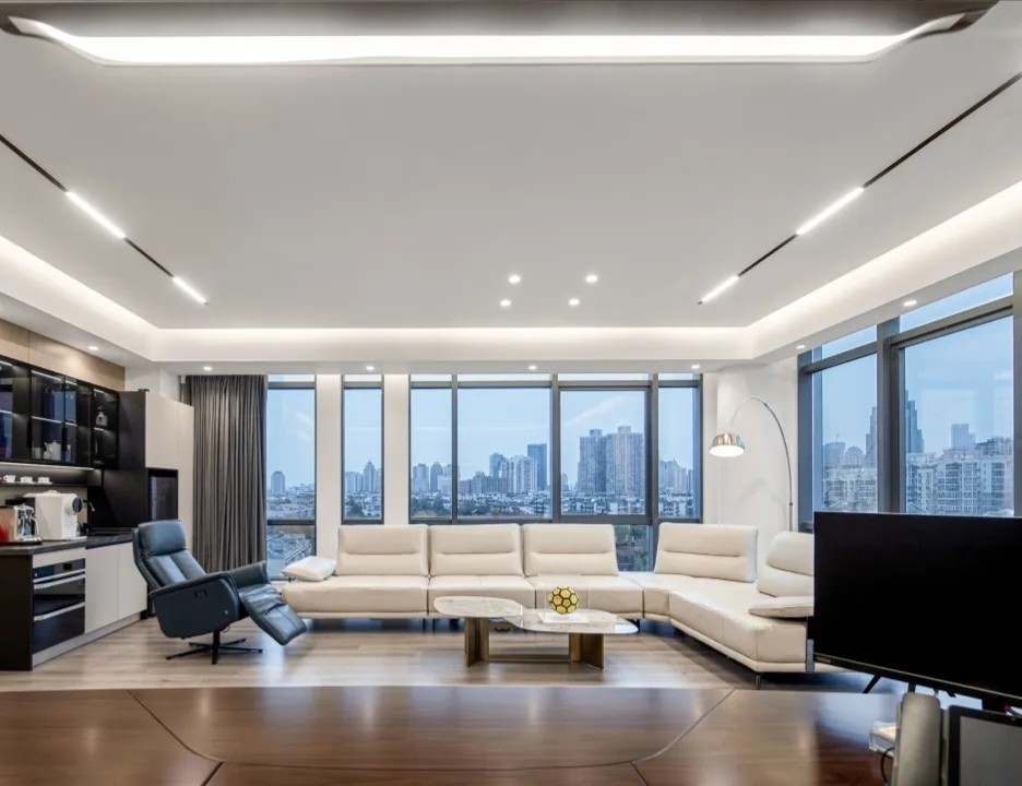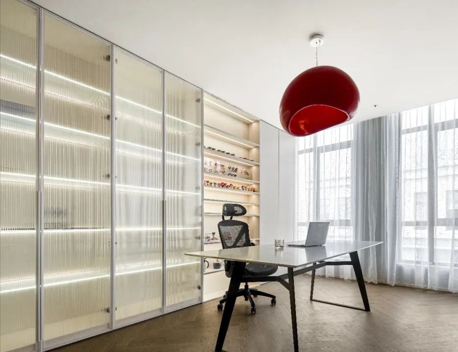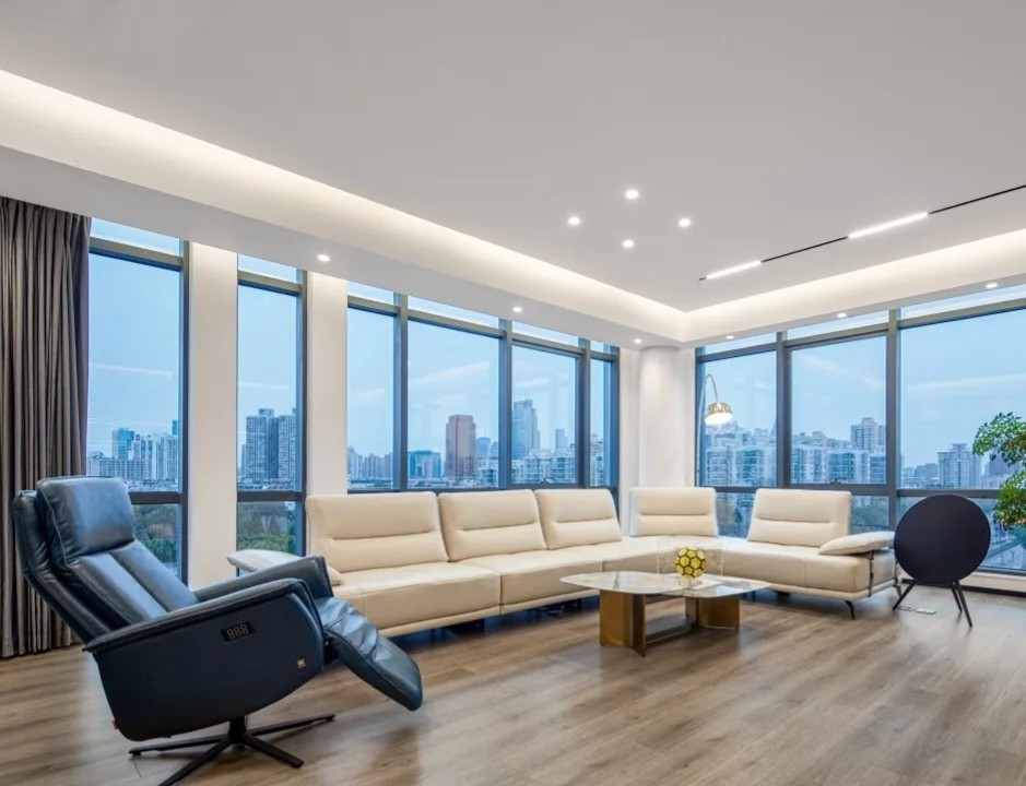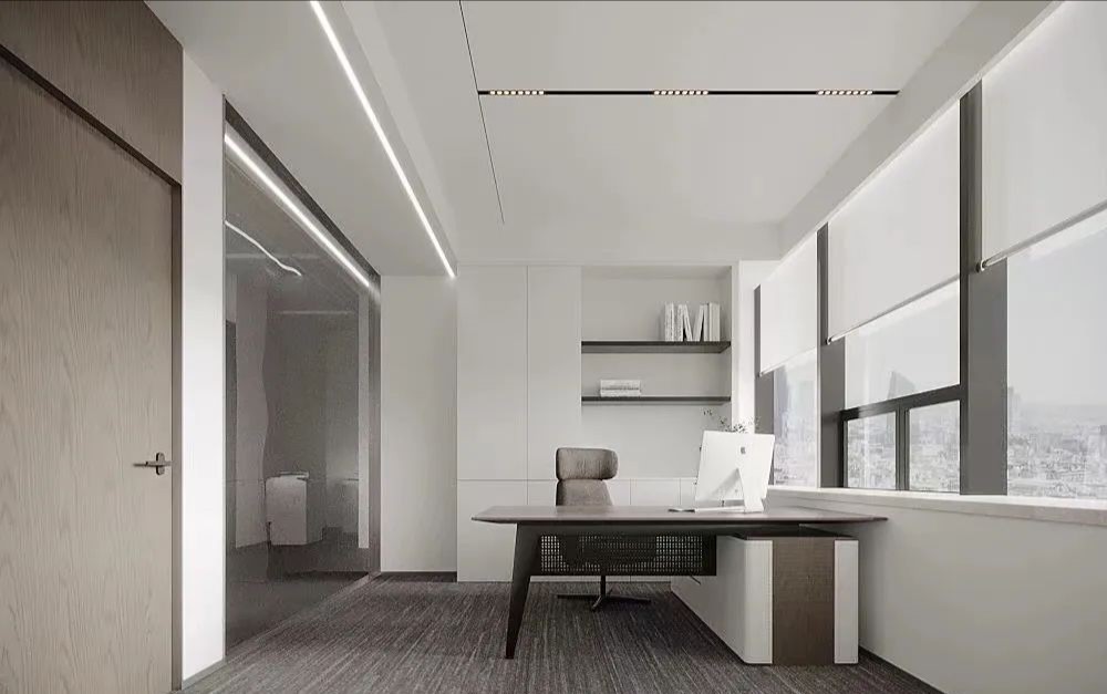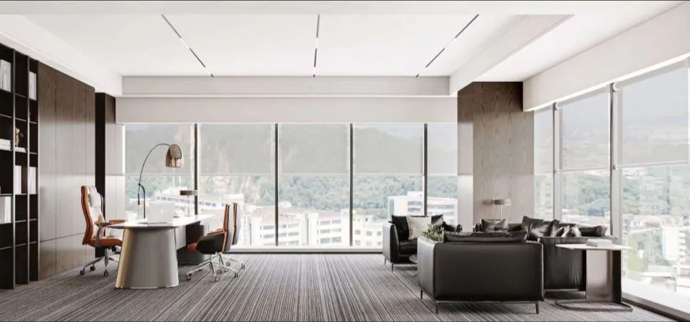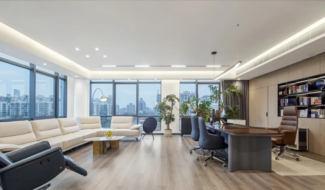 总经理办公室,是企业所有战略决策和战术指令的发出地。无论是窗外俯览之下的城市,还是室内开阔的尺度、严整的布局、艺术的端景,无处不彰显国际贸易企业应有的空间仪制与心境远见。