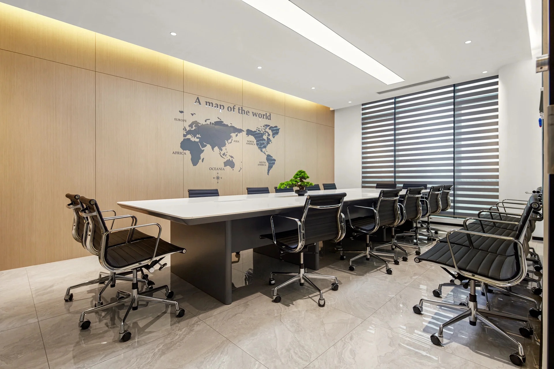 大会议室位于前台背景墙后,空间内部开敞明亮、简洁利落,环绕的长型会议桌、多媒体设备,可以满足不同规模、不同形式的会议内容,背景墙上的世界地图是企业发展的宏图,也是摆在每个员工面前的目标,未来这里必将产生无数次的思想碰撞与讨论,推动企业成长与飞跃。