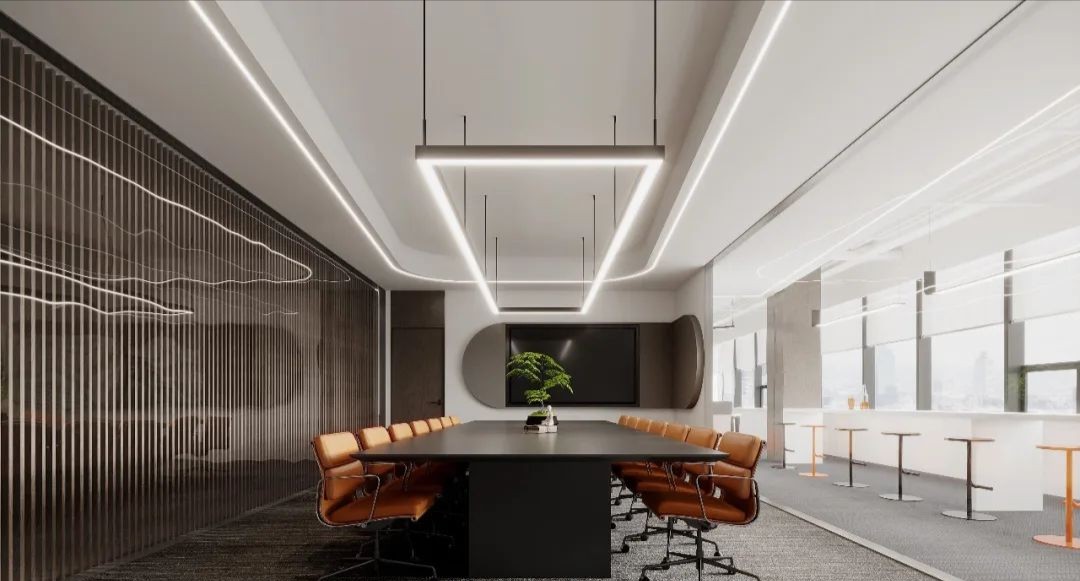 会议室一面采用门厅的格栅,另一面是透明的落地玻璃,使空间更加通透的同时又保证了隐私性。整体采用偏暗色调,尽显质感和轻奢。而橙色办公椅以及会议桌上的绿植又给会议室增添了一丝活力,让整体氛围显得并没有那么严肃。