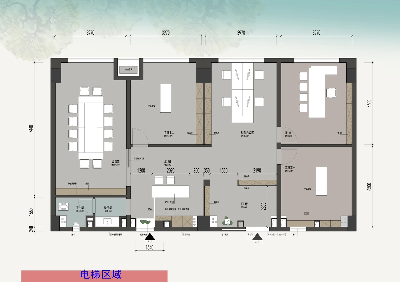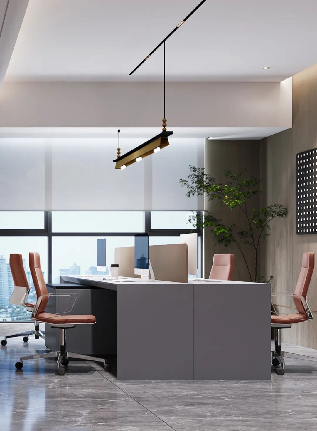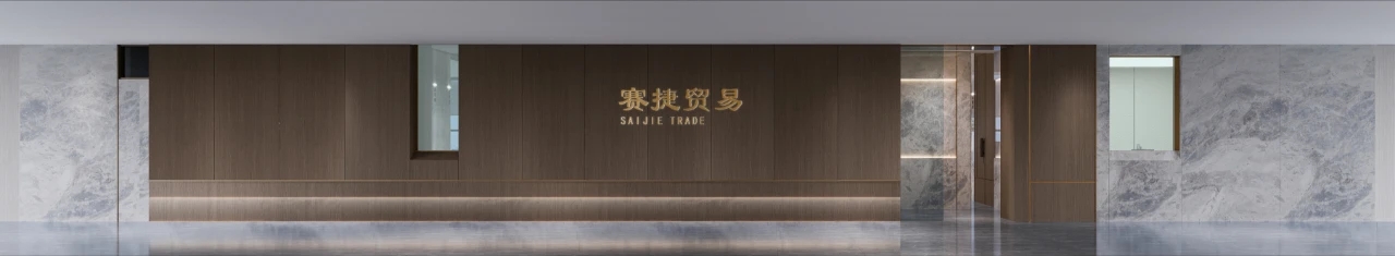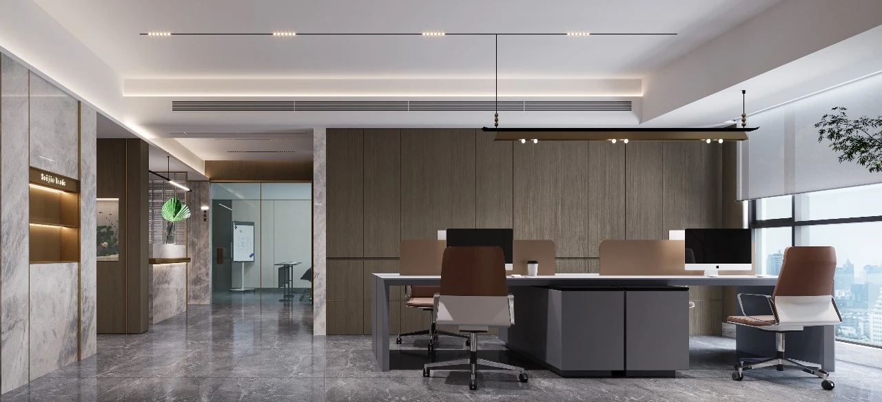 办公室的门头又大面积的原木色木饰面组成,我们在强调品味的同时,也更好地突出了企业LOGO的格调。门厅形象墙上在大理石和深色木面上加上了金色拉丝金属线,体现了空间的高贵感。形象墙选用大理石材料与门头的深色木饰面相互对比,突出形象墙的层次感。水吧区域和办公室入口玄关形成了颜色上的呼应,我们选择了大理石和木饰面的组合,延伸了空间的格调,让空办公室的氛围更具协调性。公共办公区我们用了开放式的设计手法,增加了办公空间的纵深感,高级感,营造明亮的办公氛围,同时突出空间的通透性和采光。