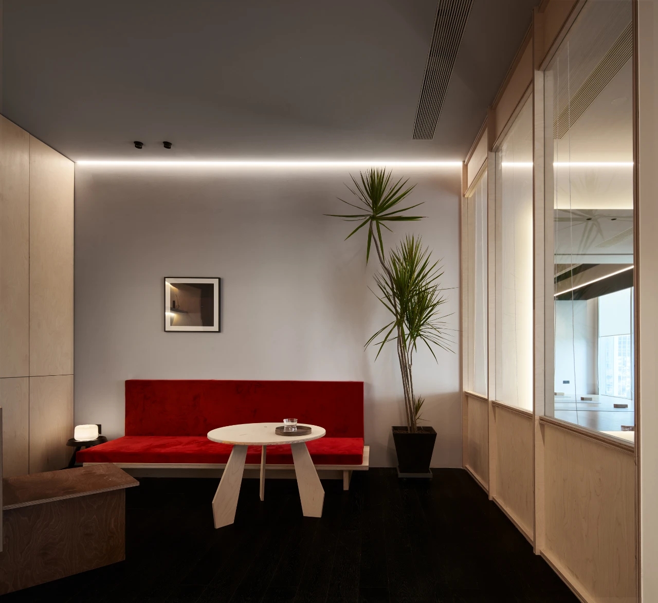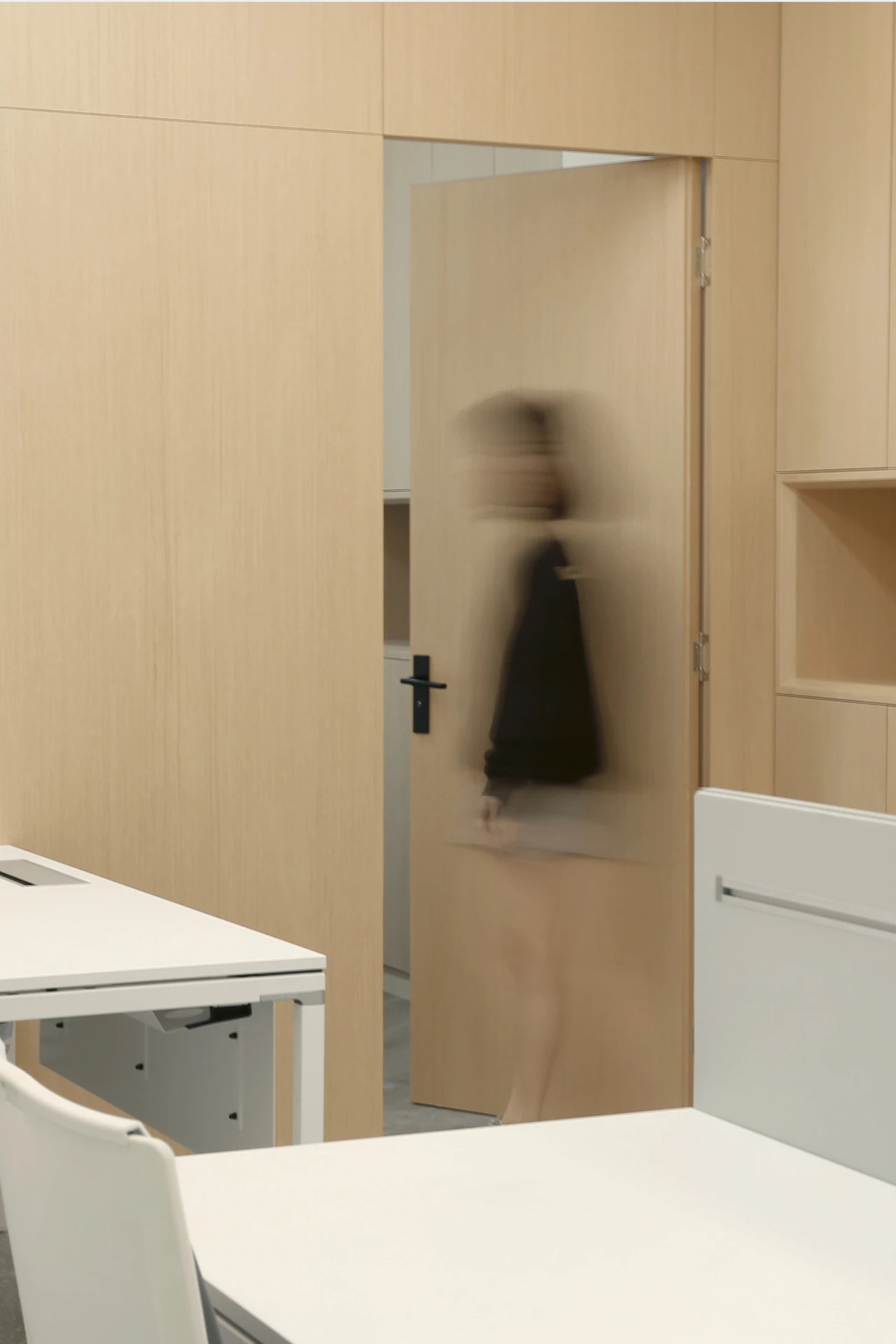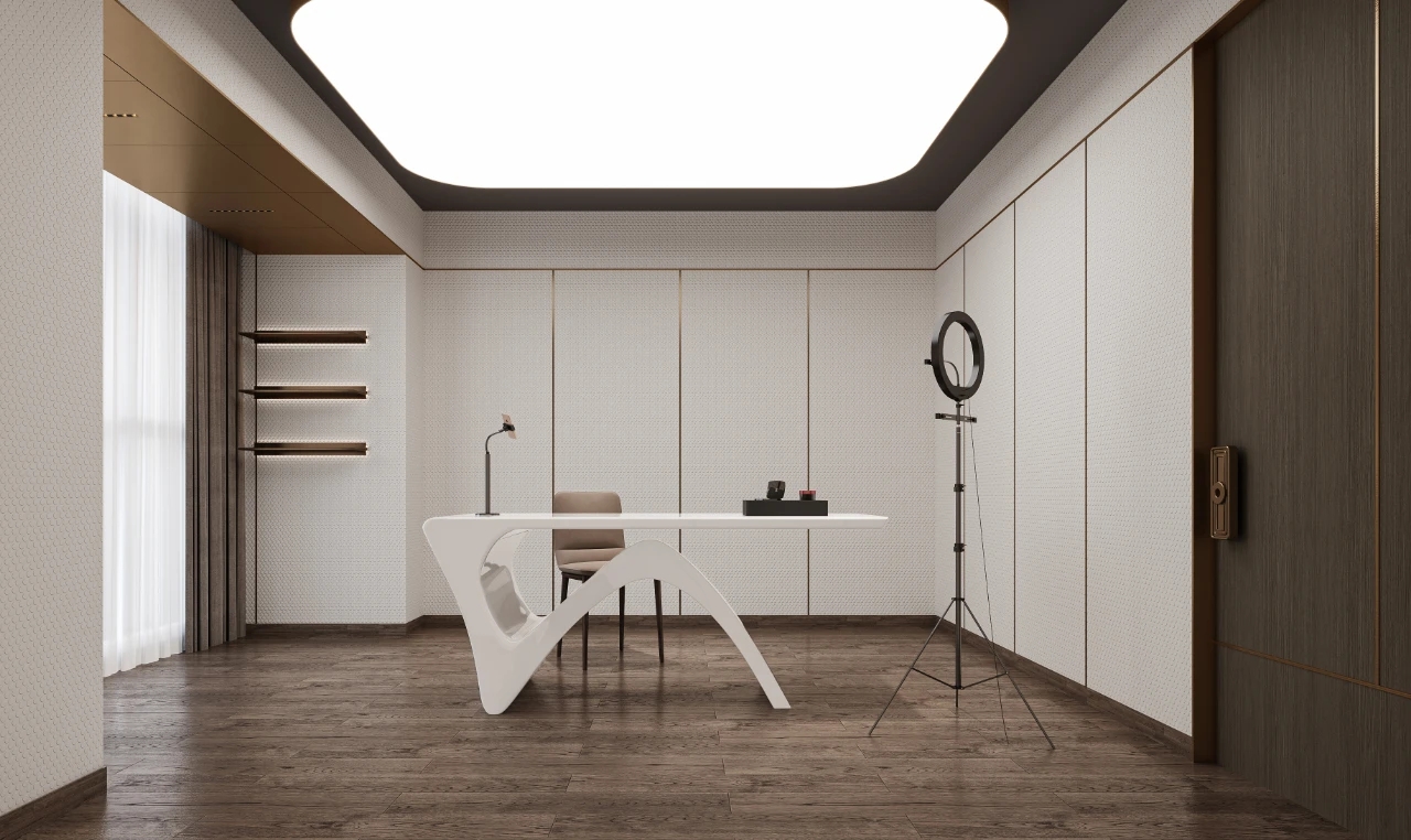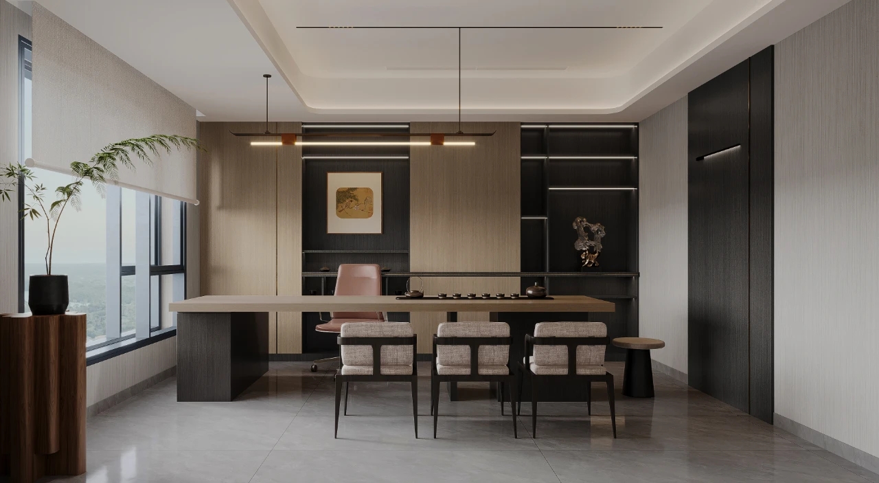 会议室空间主要打造简洁、明亮、干净三种氛围,整个空间呈现灰白色调,屏幕两侧使用深色木饰面,凸显重点区域,引导了视觉中心,开会时集中视线。茶室的材质沿用了空间主要的三种材质,但与其他不同的是,茶室在色彩上,增加了黑色格调的木饰面,呼应了家具的黑色元素,同时也寓意了人生的多姿多彩。