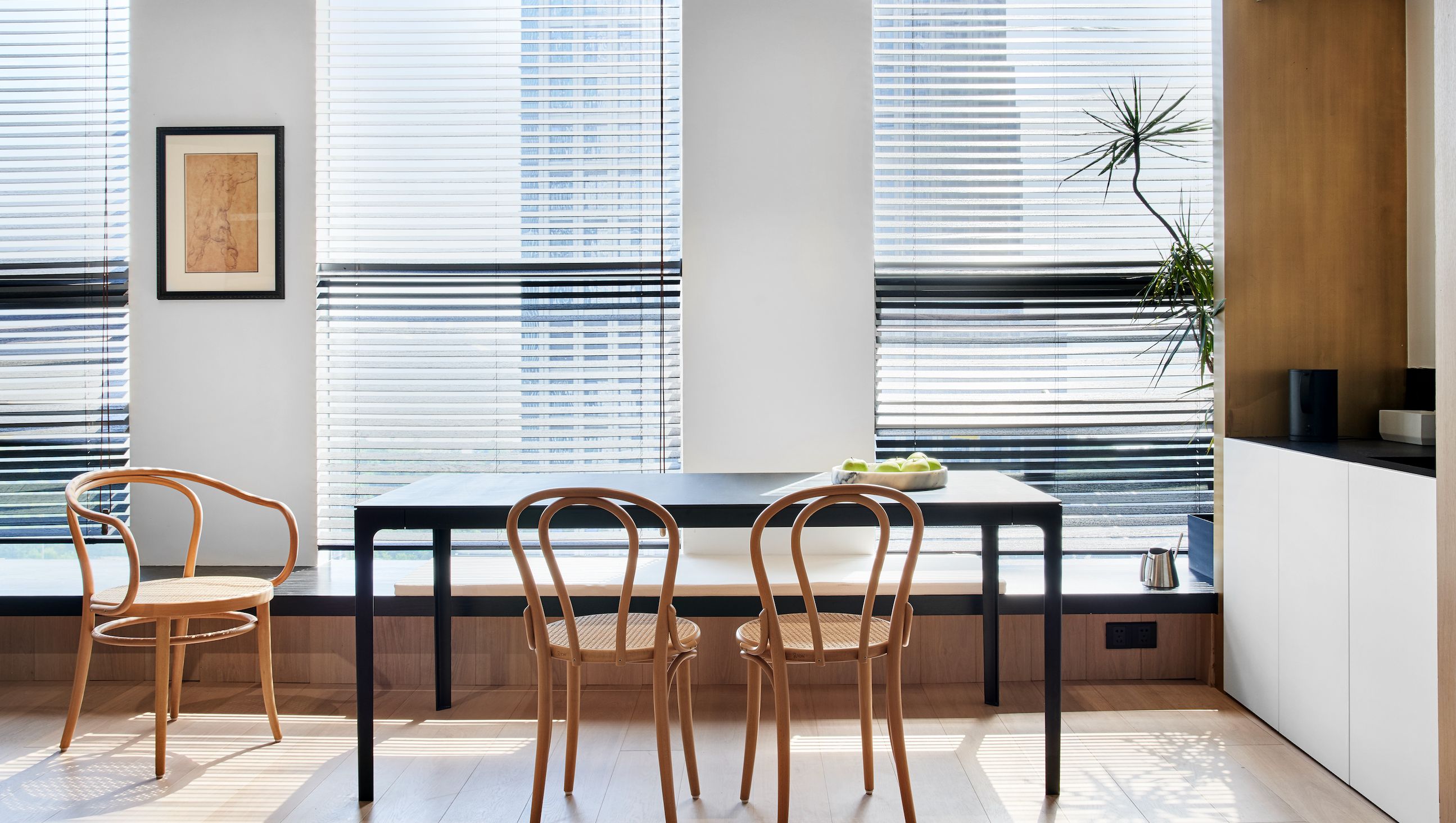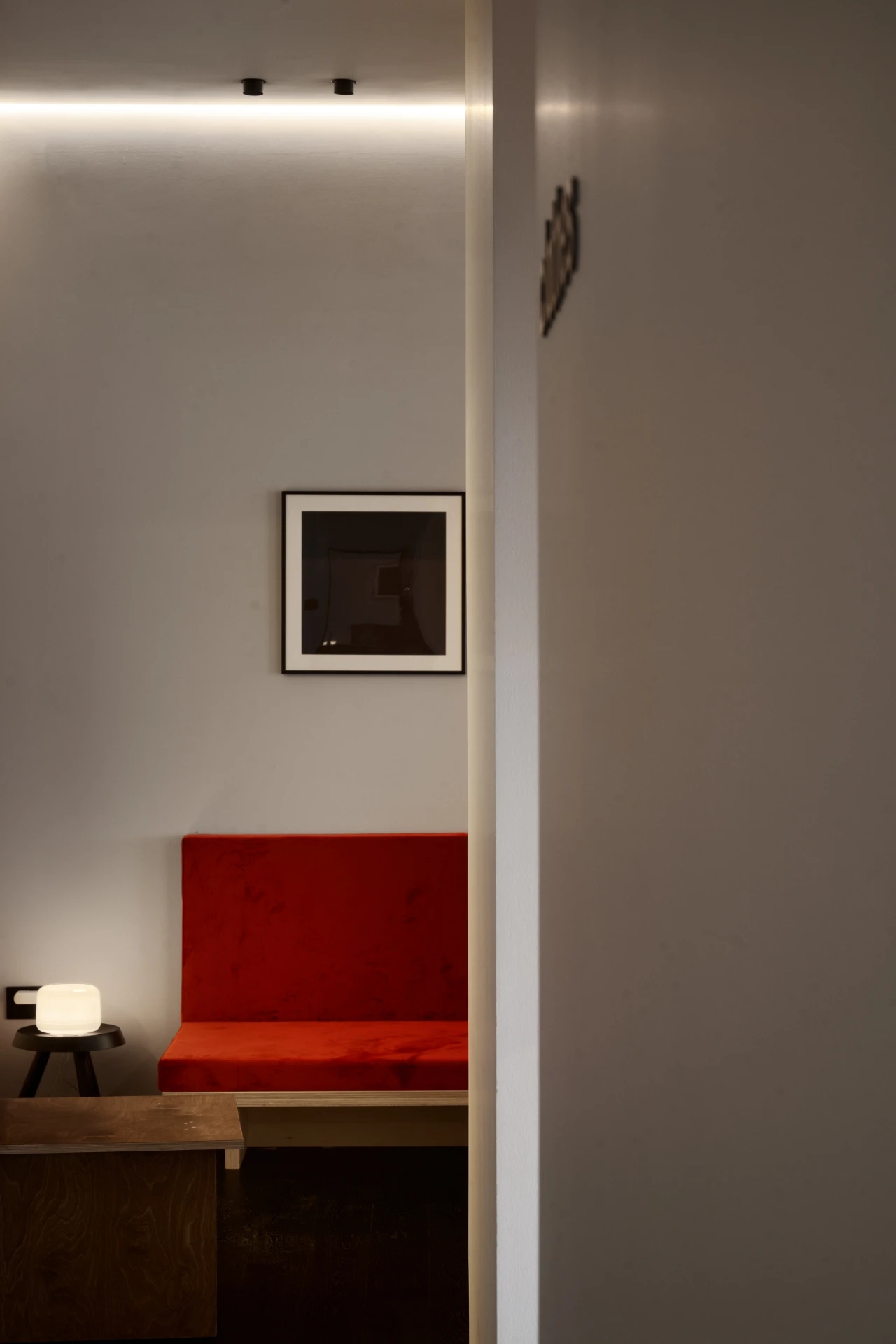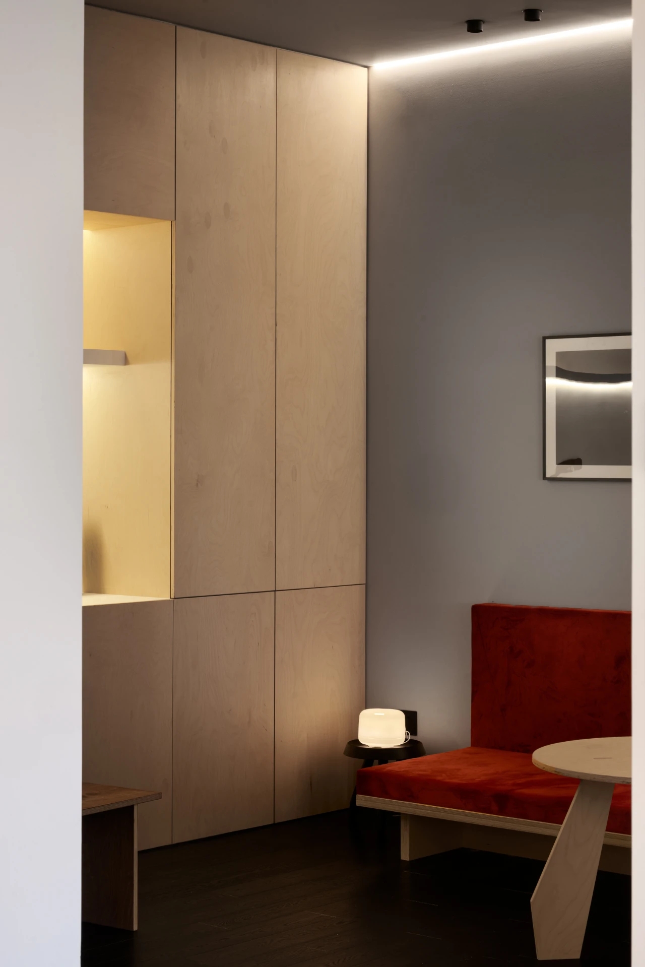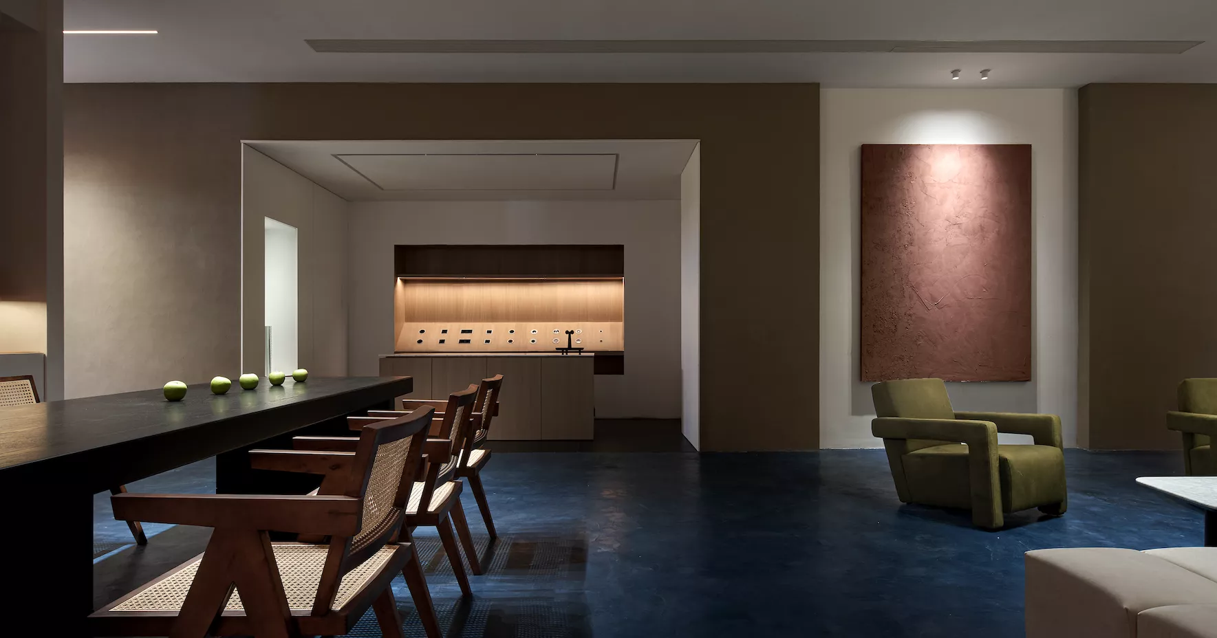 会议室空间主要打造简洁、明亮、干净三种氛围,整个空间呈现灰白色调,屏幕两侧使用深色木饰面,凸显重点区域,引导了视觉中心,开会时集中视线。茶室的材质沿用了空间主要的三种材质,但与其他不同的是,茶室在色彩上,增加了黑色格调的木饰面,呼应了家具的黑色元素,同时也寓意了人生的多姿多彩。