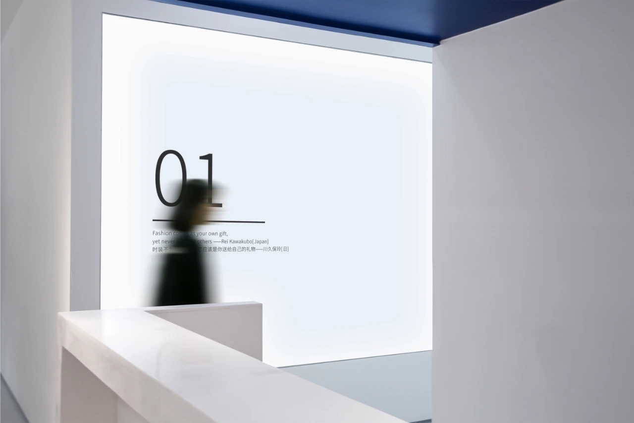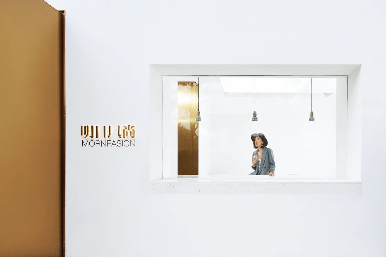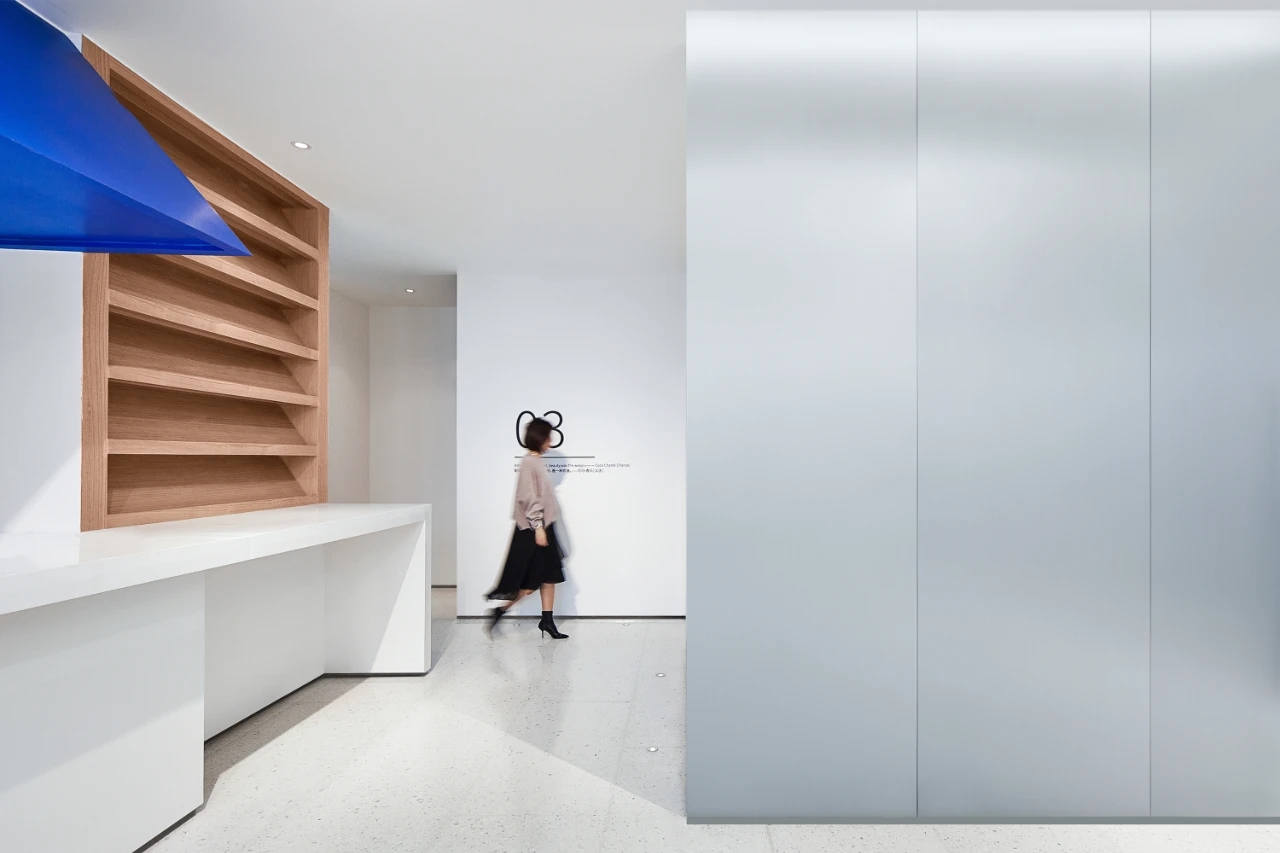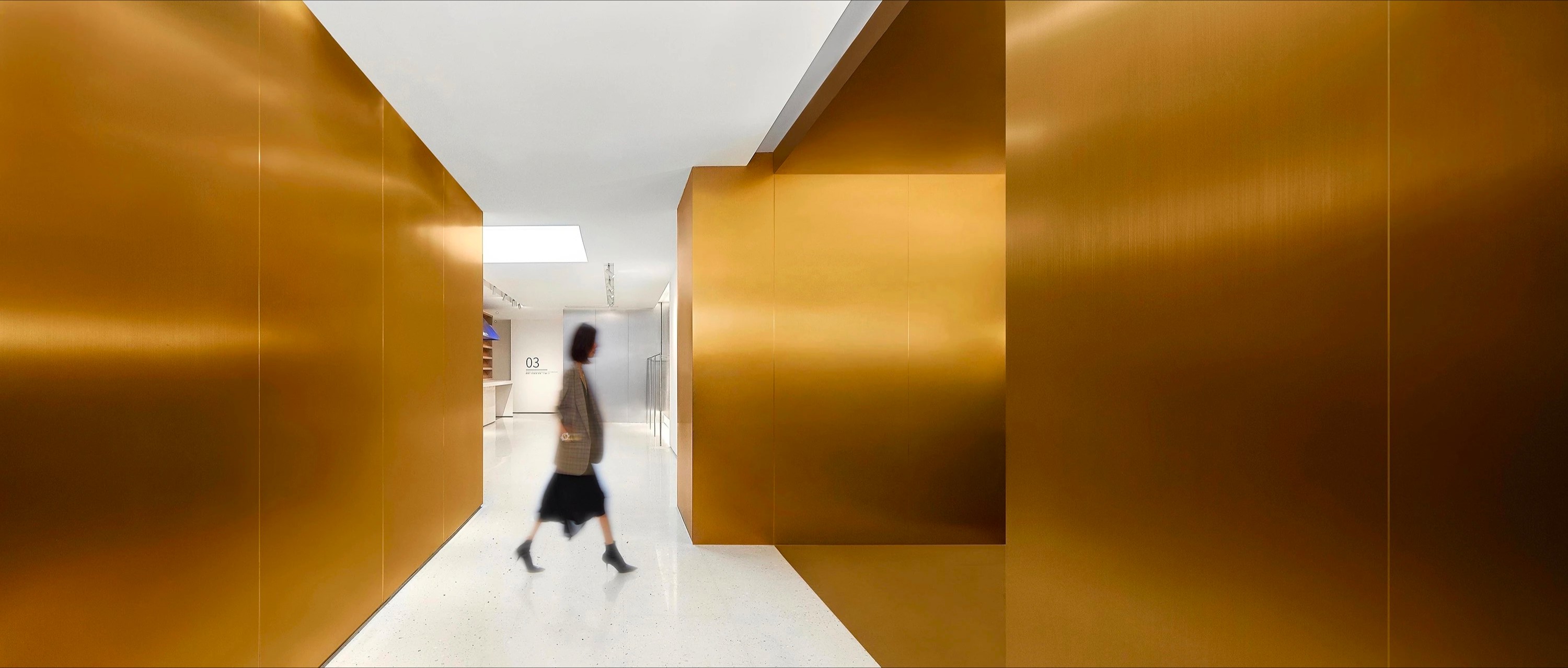金色纯净不锈钢墙面过道与方盒大门连接贯通,俯看为T型。设计简洁、高级。呼应“场景性”,形成了有序地空间动线。