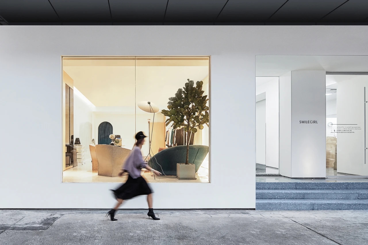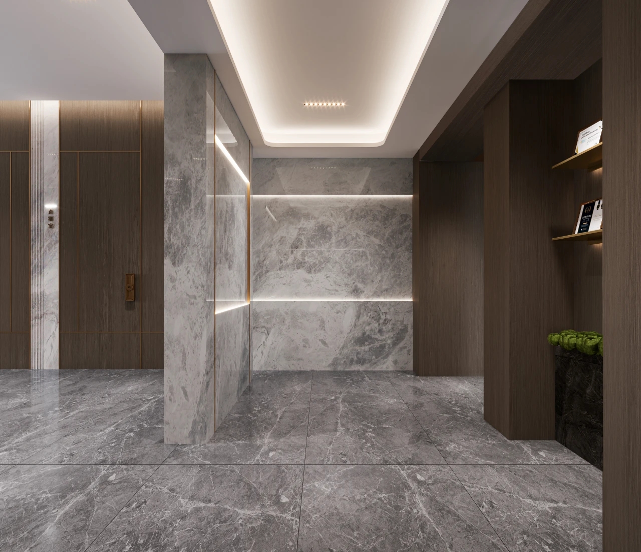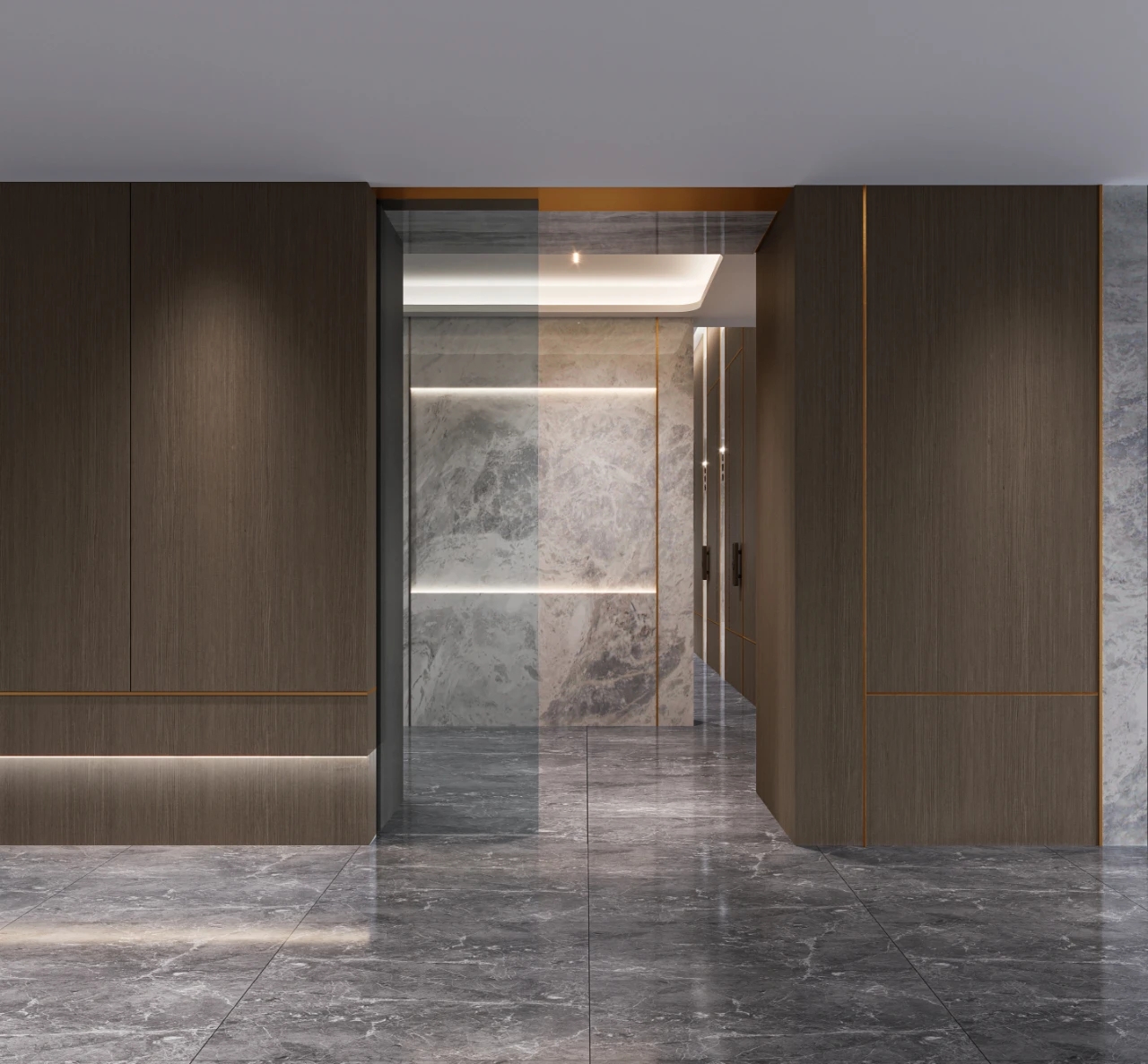 金色纯净不锈钢墙面过道与方盒大门连接贯通,俯看为T型。设计简洁、高级。呼应“场景性”,形成了有序地空间动线。