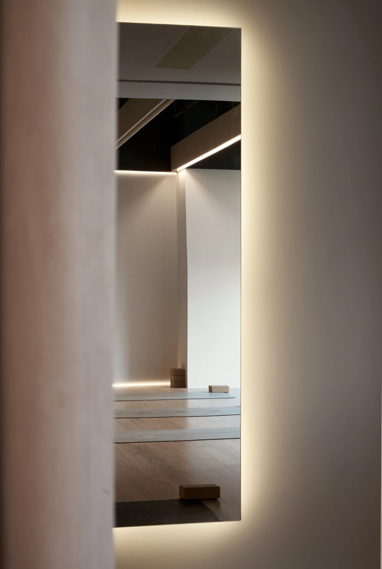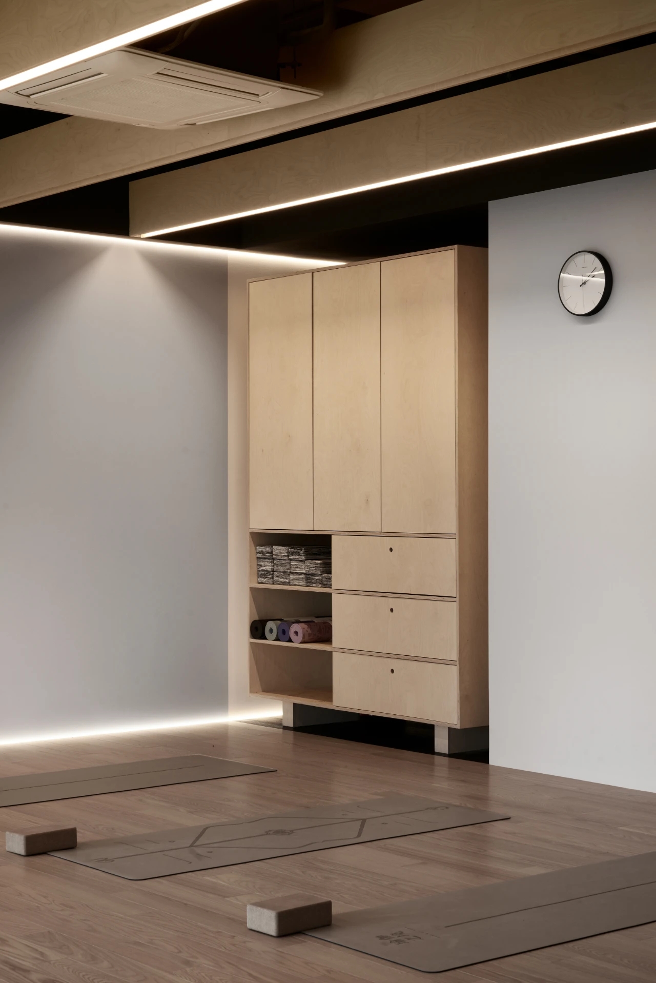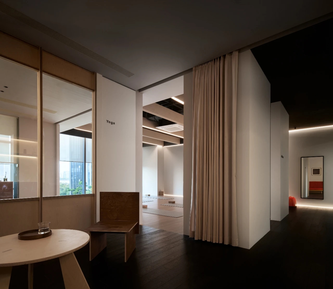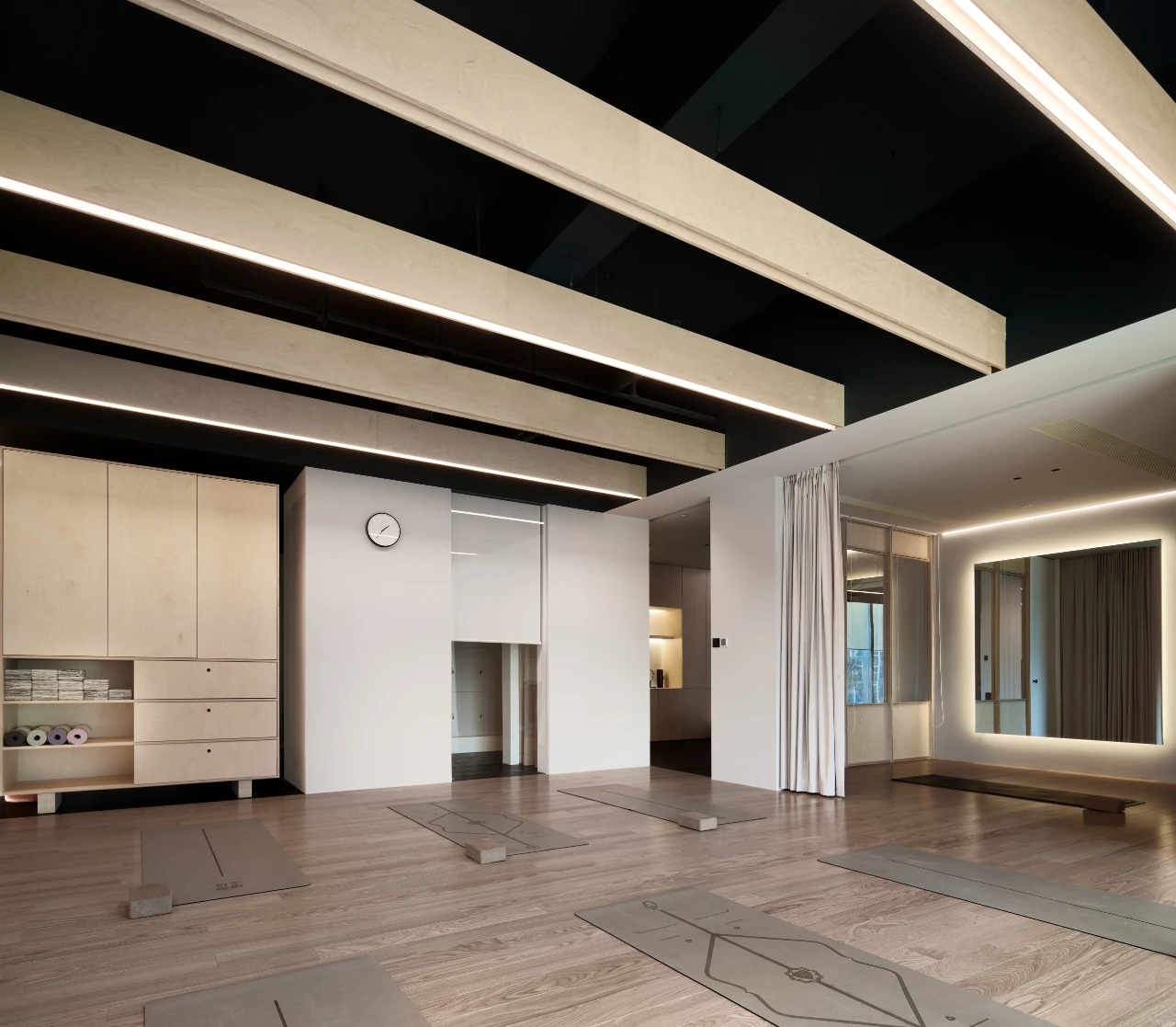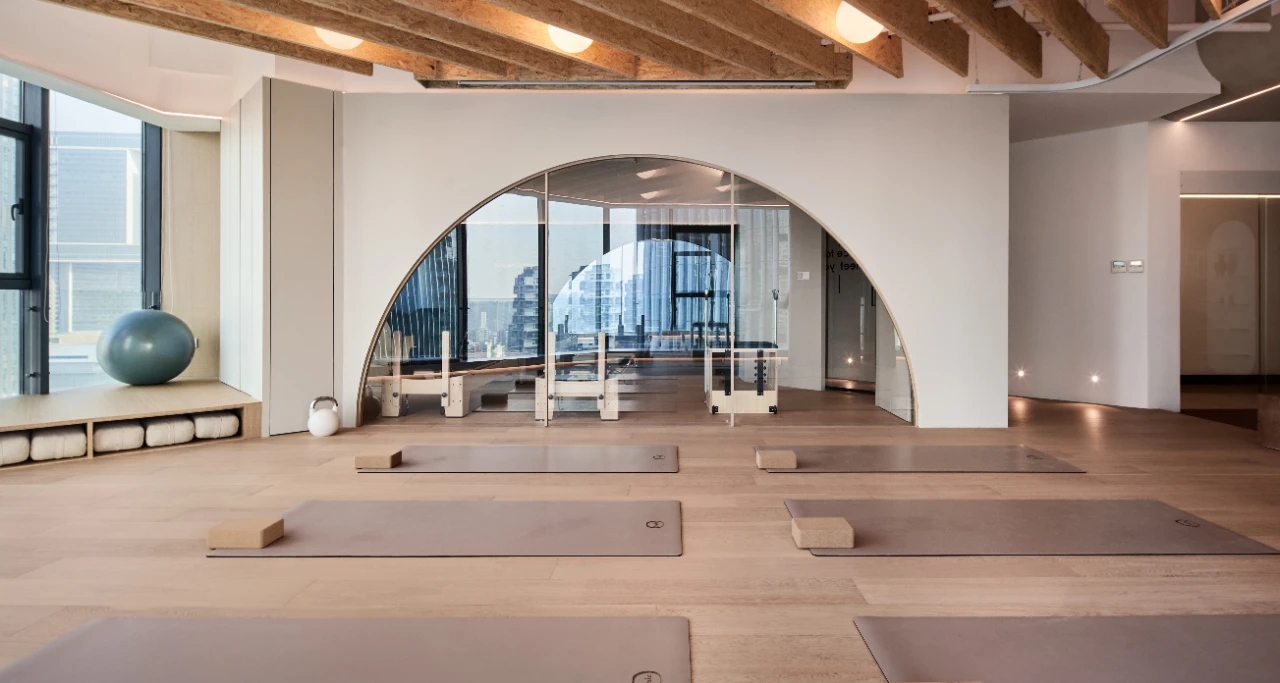 以浅色调为主的瑜伽馆,采用大量原木、墙面镜和隐藏式光线设计,利用极具现代感的元素和利落的线条塑造出一个兼备极简美学、功能性和禅意的运动场所,让空间成为与身体共同呼吸的生态系统。