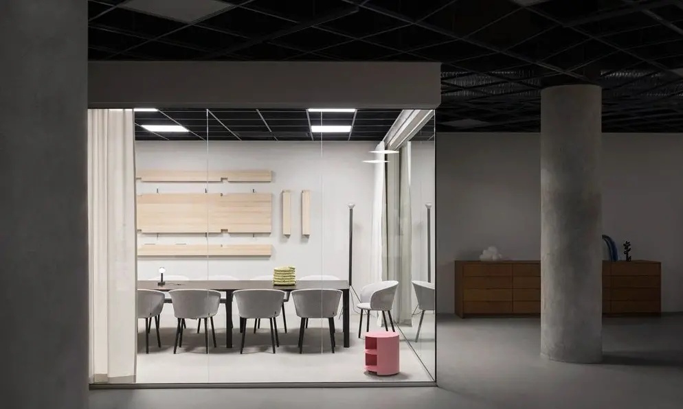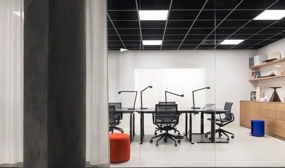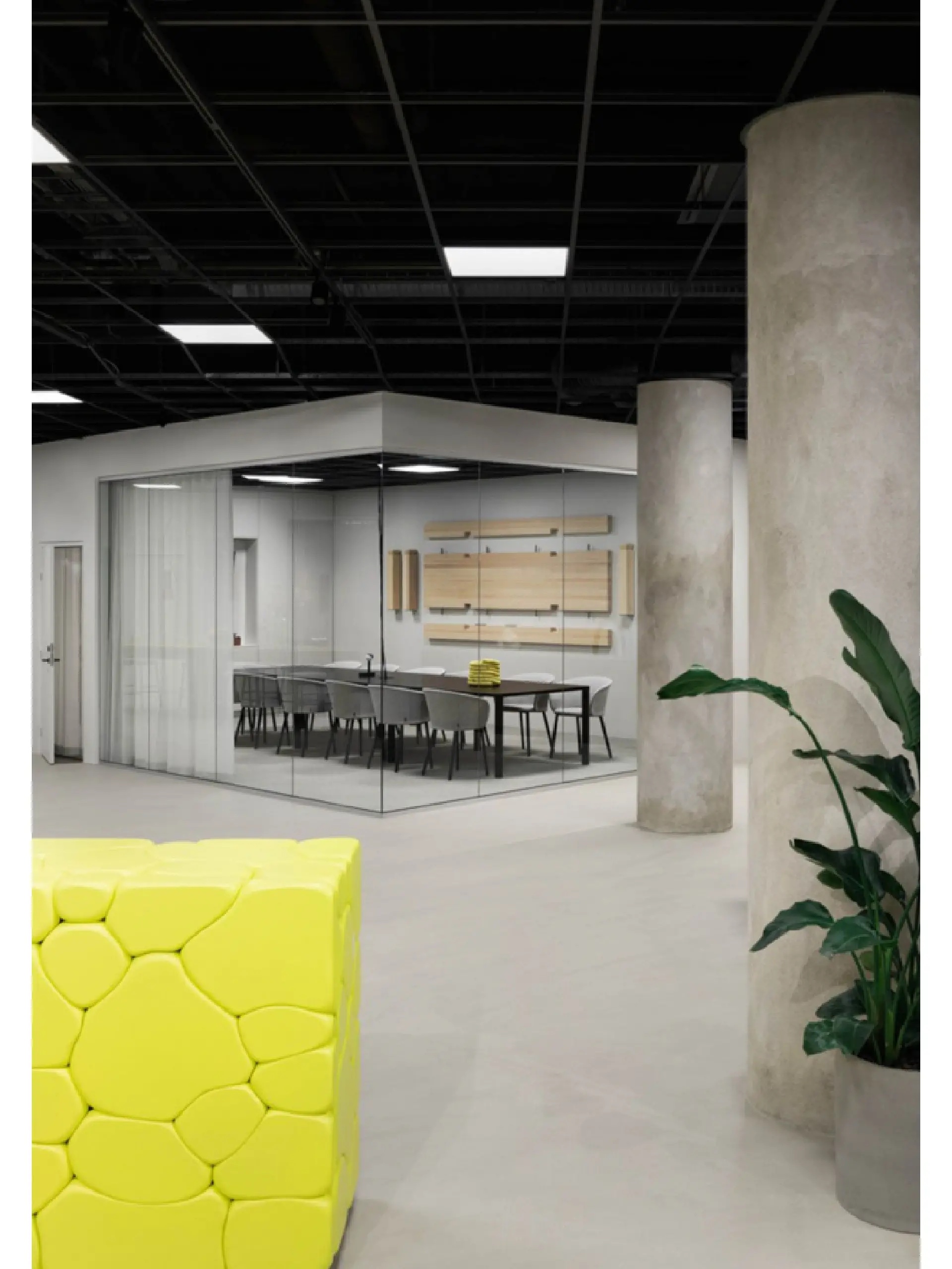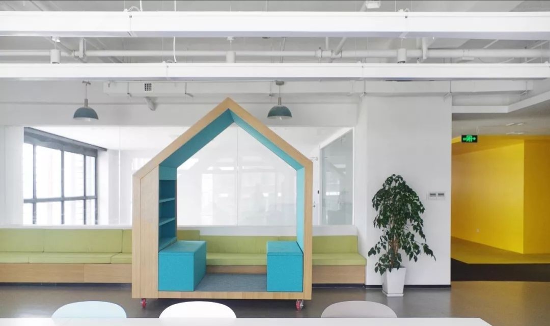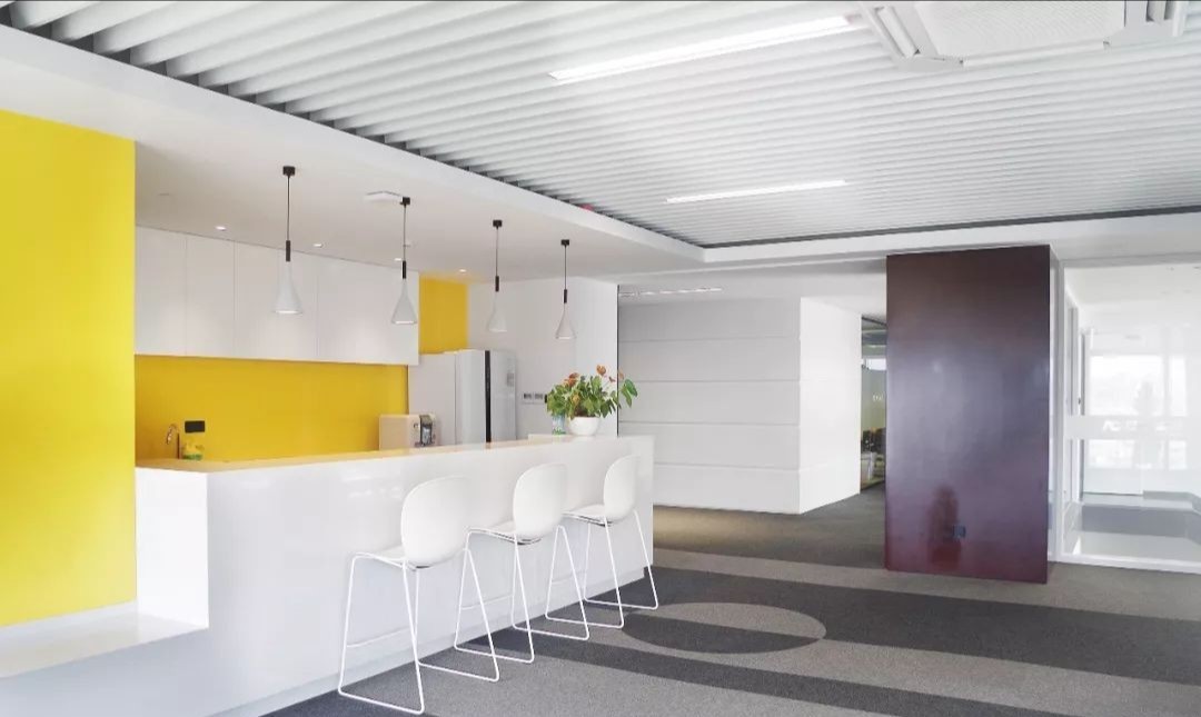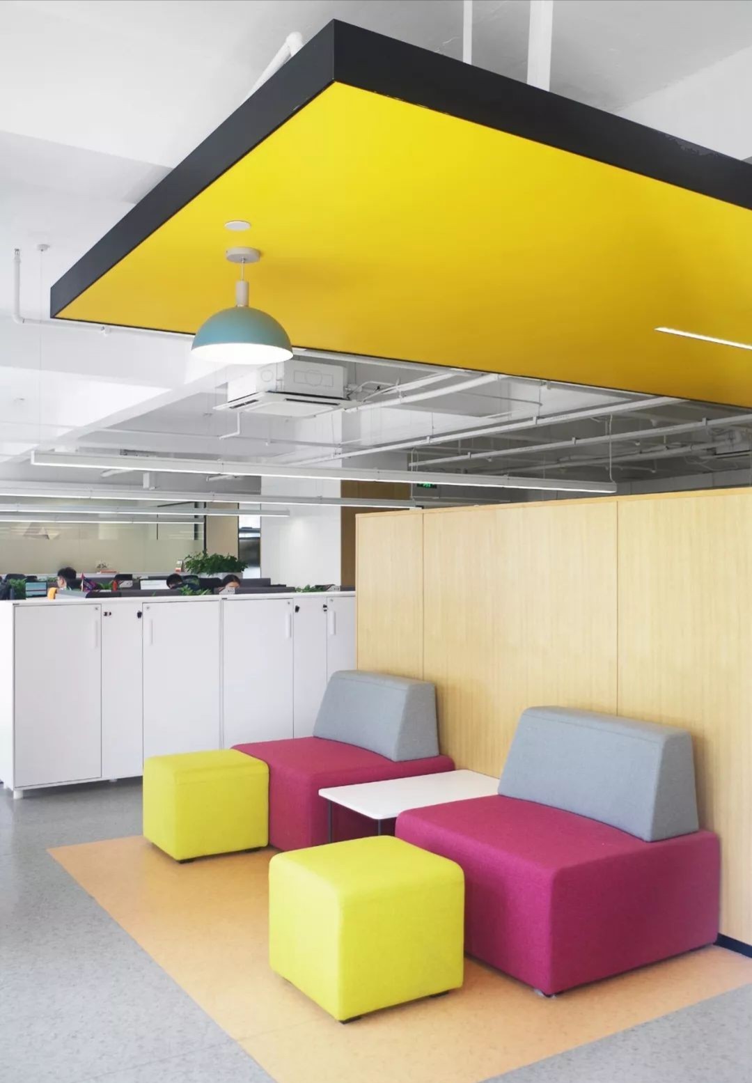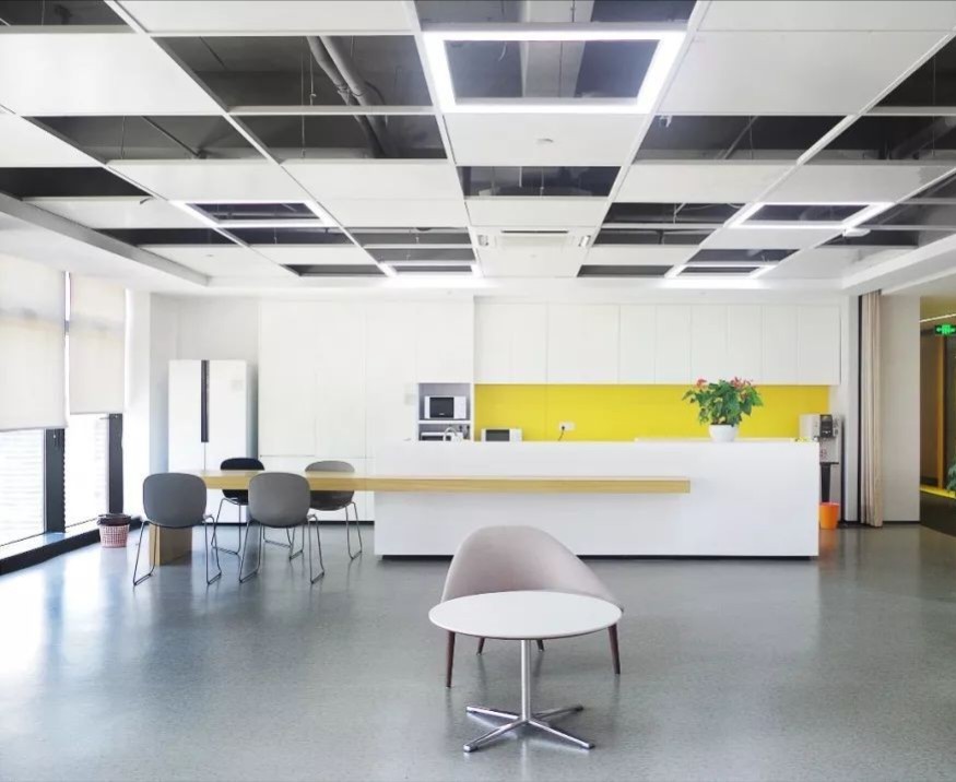茶歇空间把管道隐藏在顶部,并利用现状设置局部通高空间,形成了空间的凝聚力,展现出干净纯粹的环境效果。