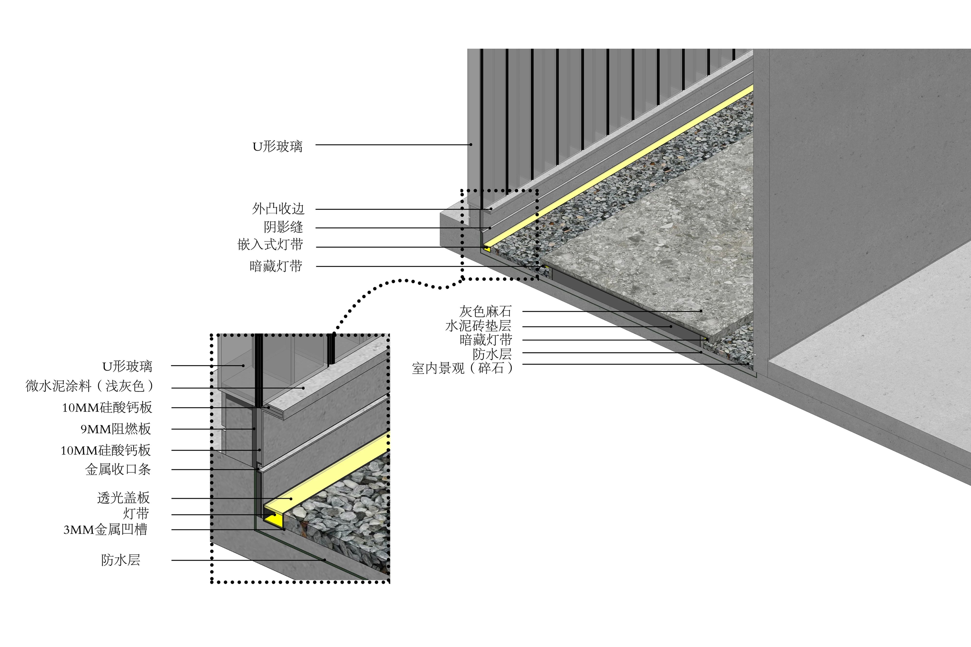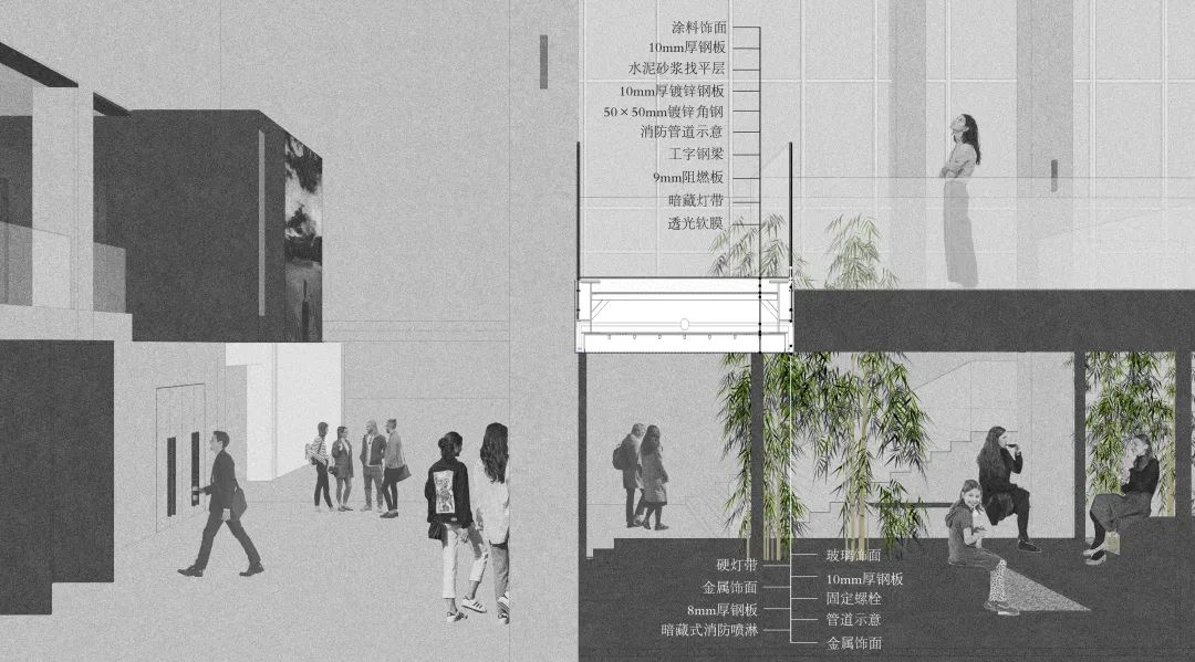 通过设计,将钢结构、消防管线、灯光隐藏在了“悬浮之径”的结构腔体内,使得空间的感受可以保持干净完整,不被机电管线所干扰,实现沉浸式体验。