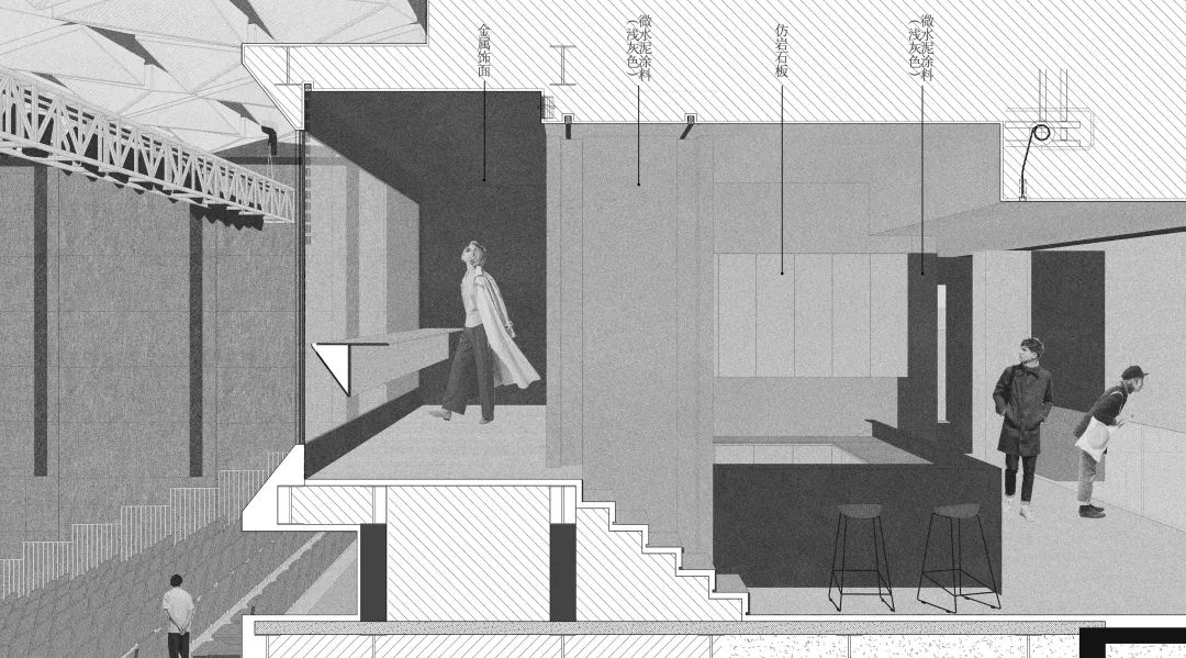 在报告厅的功能规划中,设计师提出利用报告厅部分上空的空间做一个独立的观影区,这个想法得到了业主的支持,空间的想法也给到业主灵感,业主顺势提出将此空间结合茶饮零售作为日常可对外的新型消费业态空间:当报告厅未做会议使用时,屏幕可以播放园区活动信息广告、以及固定时段的电影放映,让日常在茶饮空间的人也能感受到报告厅的各种可能。
