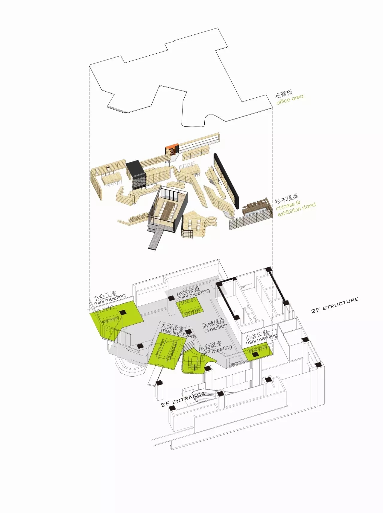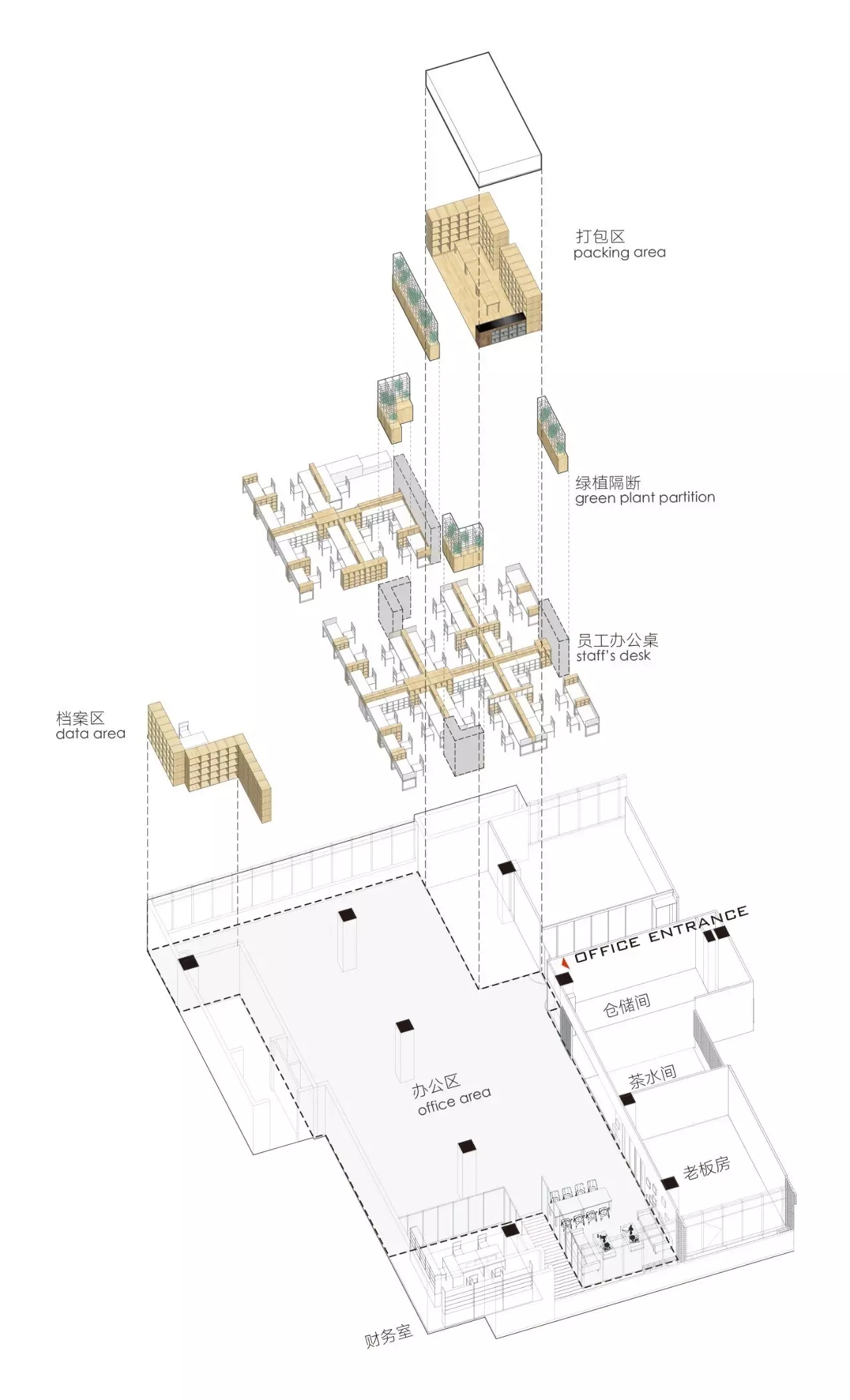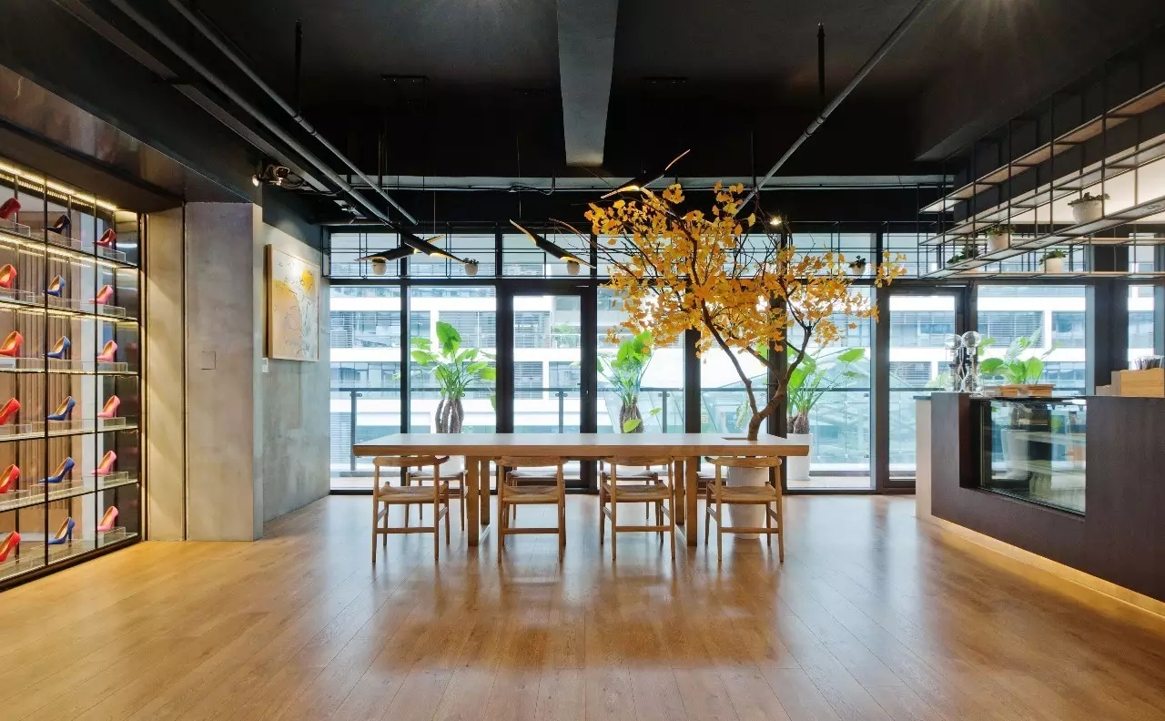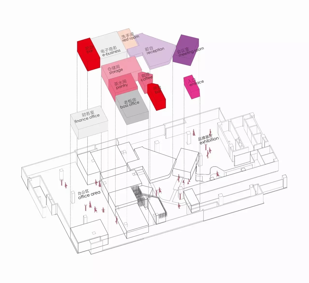 我们希望这些不同的功能并置在一起,能散发出强大的气场——形成专属于女王的潮鞋王国!一切都源于鞋子,一切又都不只是鞋子而已。方案是按照“装满鞋的盒子”的概念来展开的。我们将一个个小的功能空间都以盒子的形式放置在这个大空间里面,剩余的便是功能的主体——品牌展厅和办公!