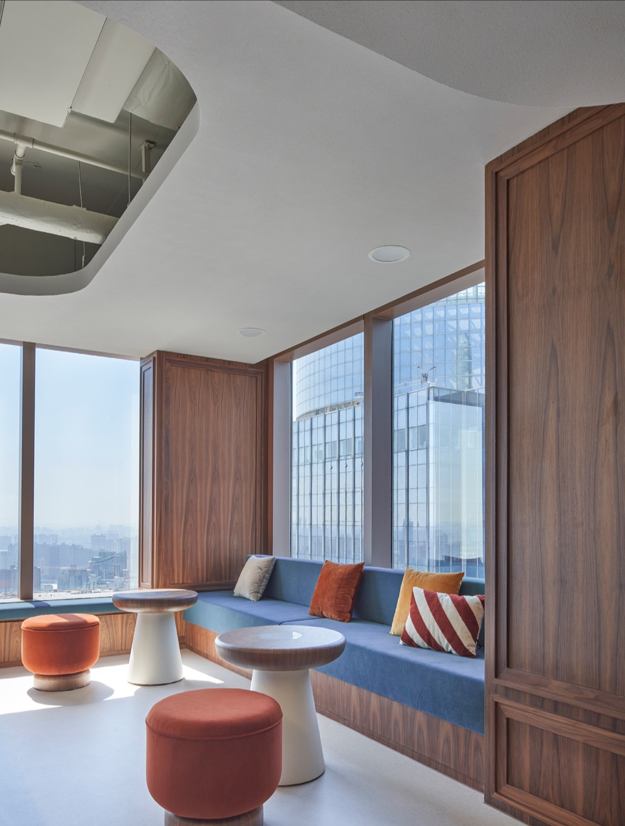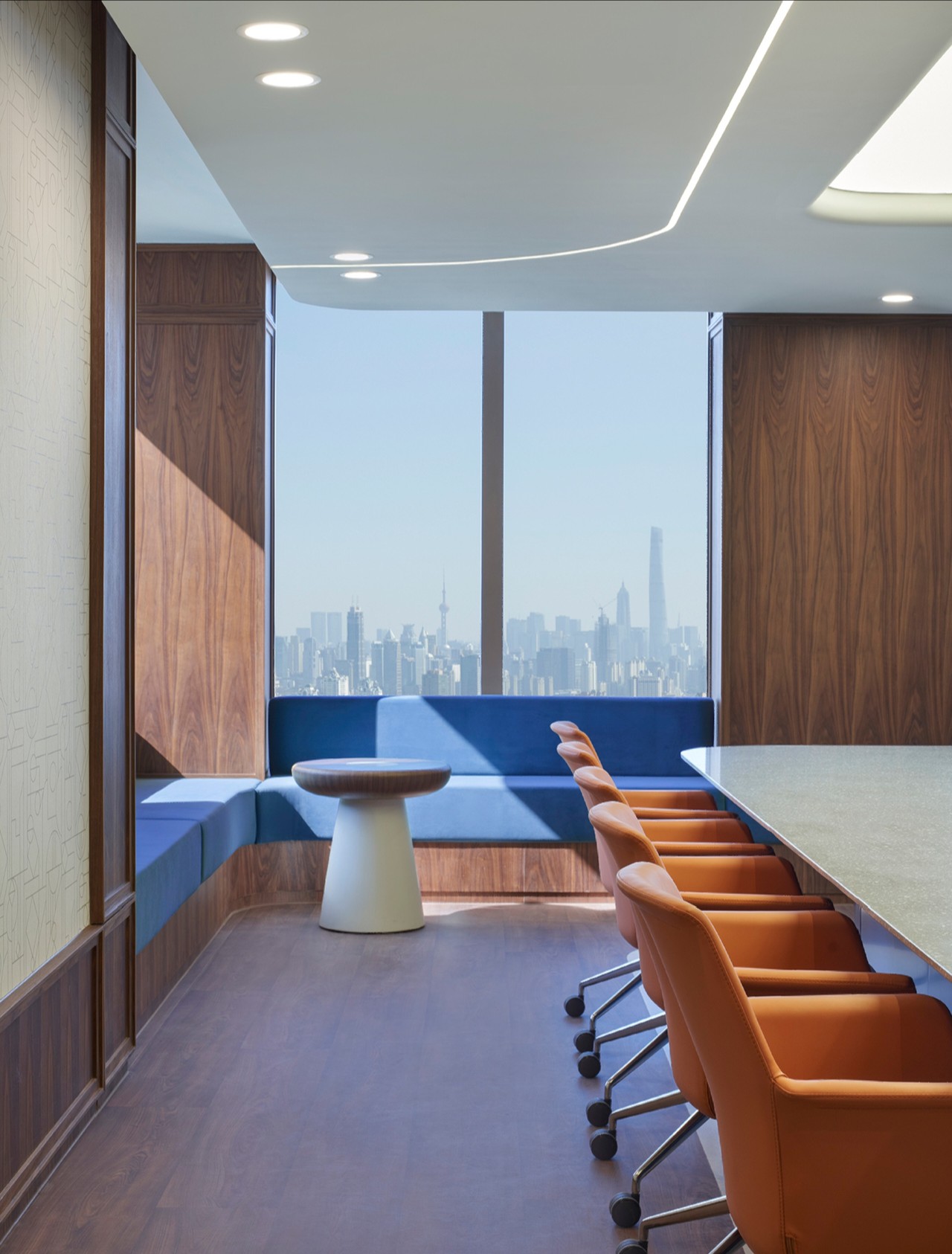 Meeting Room的艺术装置是收集了上海的旧窗格重新用激光雕刻而成,这件历久弥新的艺术品,是上海繁荣兴旺的不朽象征。顺沿进入Rest Room,应眼所及,线条的唯美、皮的肌理、光影的温暖。