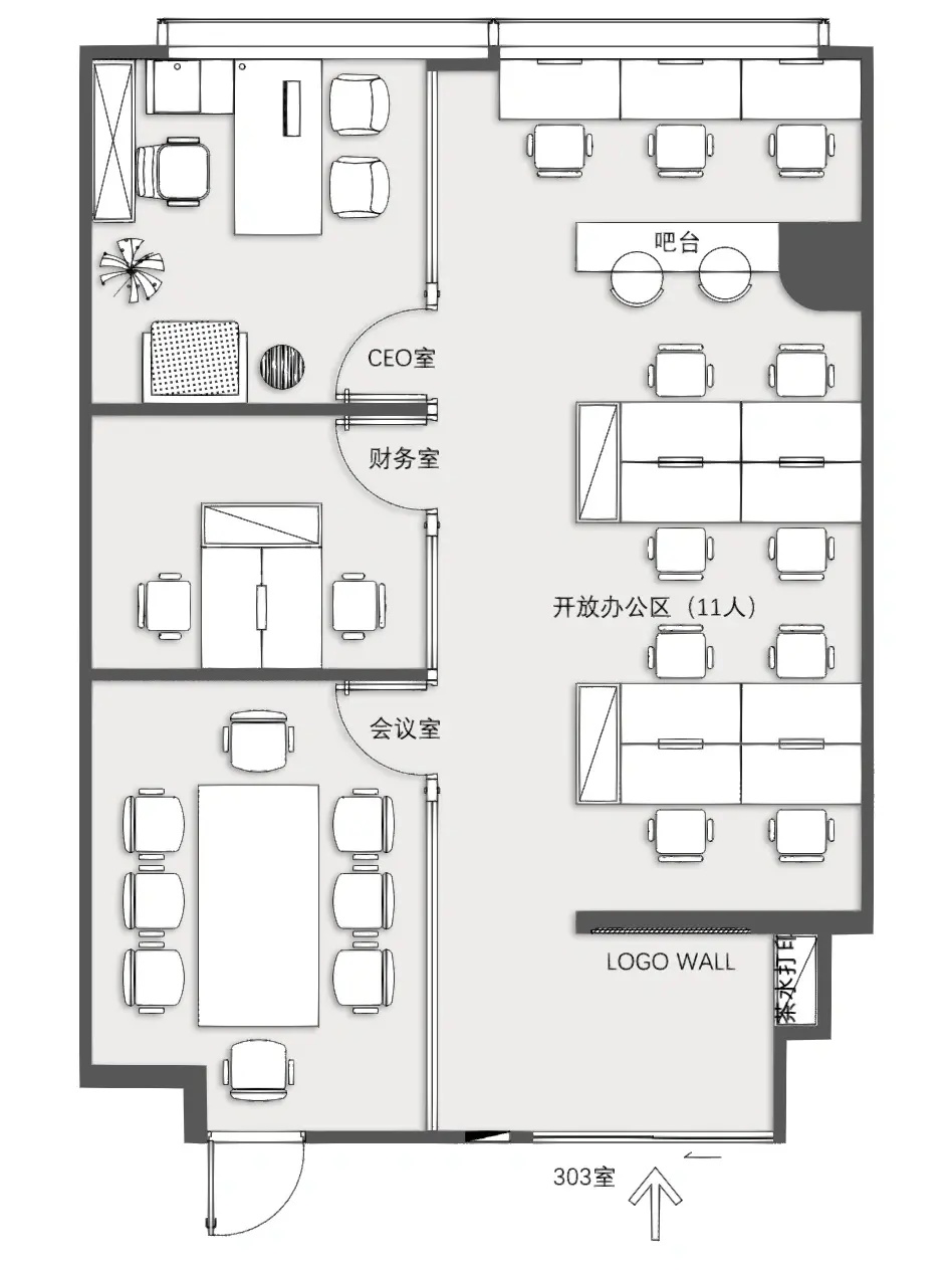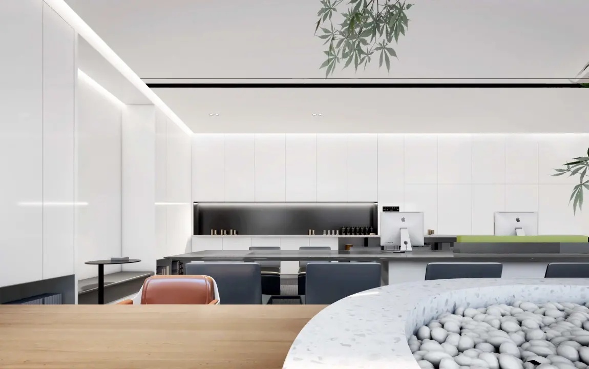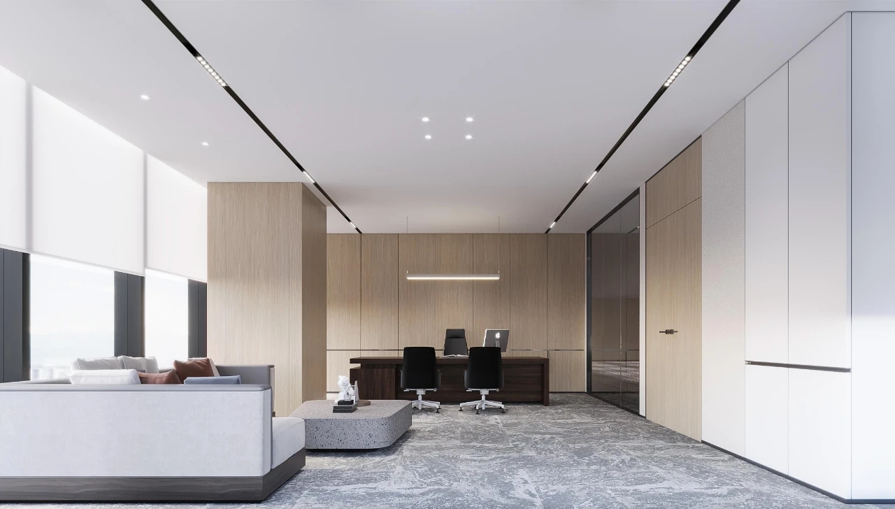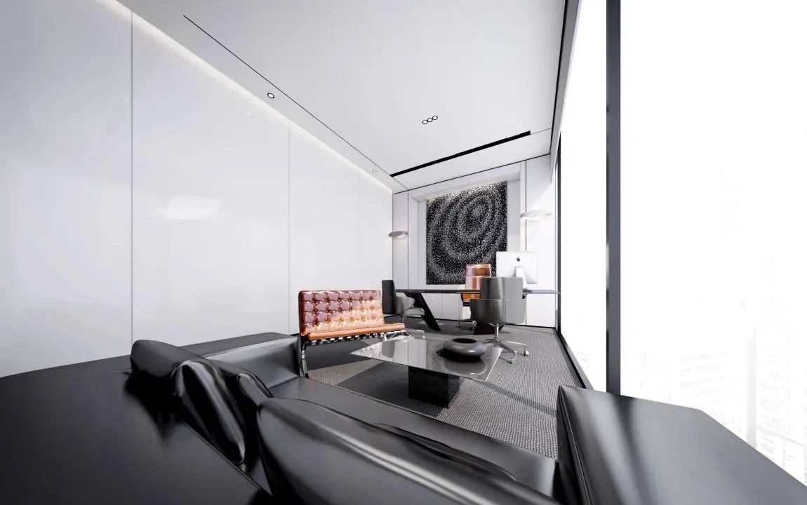 经理室以黑白灰主导,摒弃其他鲜艳颜色,空间以纯粹的材质体现品味,以利落的线条丰富视觉,让空间更加自然、放松。