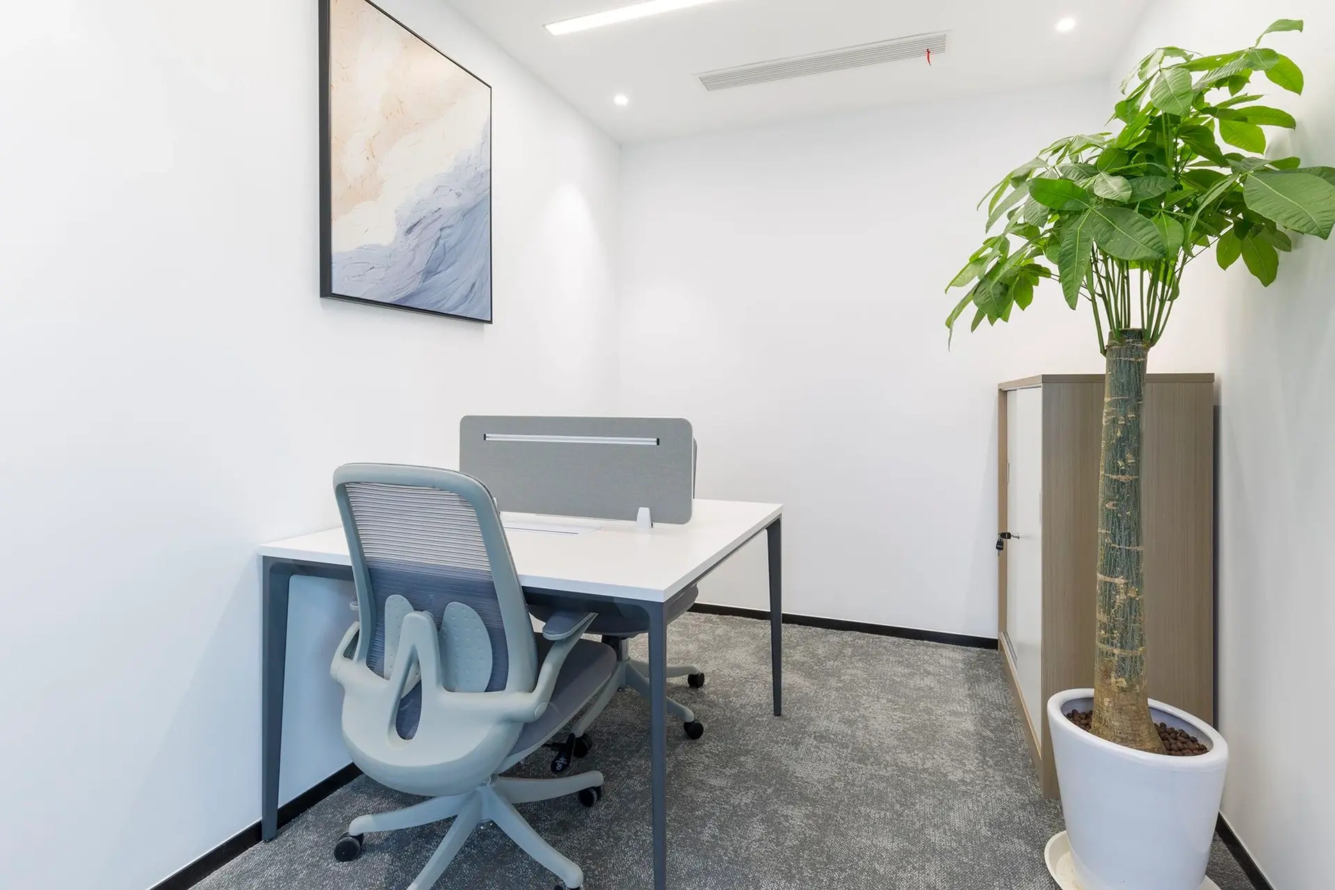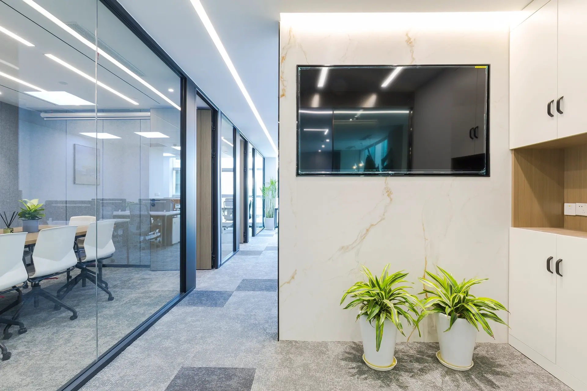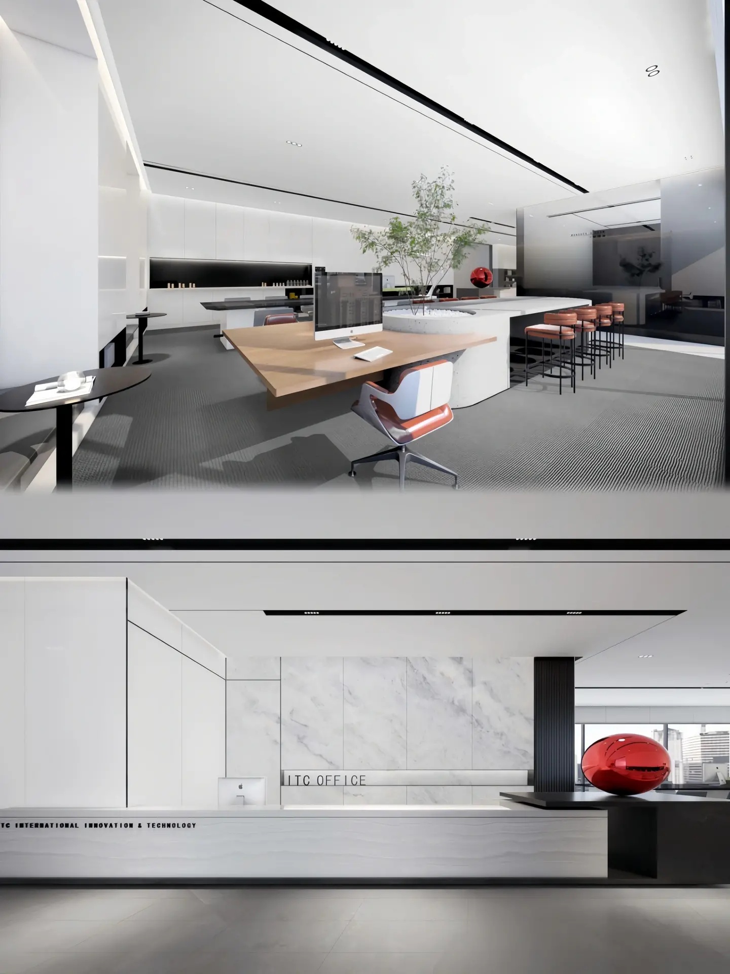 经理室以黑白灰主导,摒弃其他鲜艳颜色,空间以纯粹的材质体现品味,以利落的线条丰富视觉,让空间更加自然、放松。
