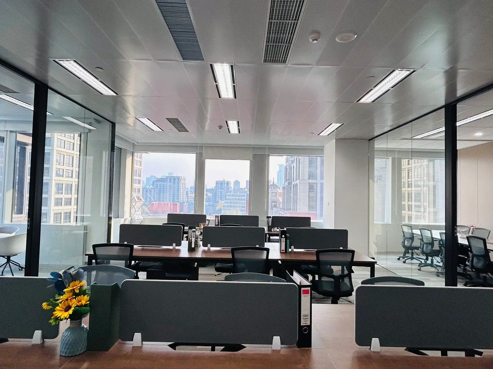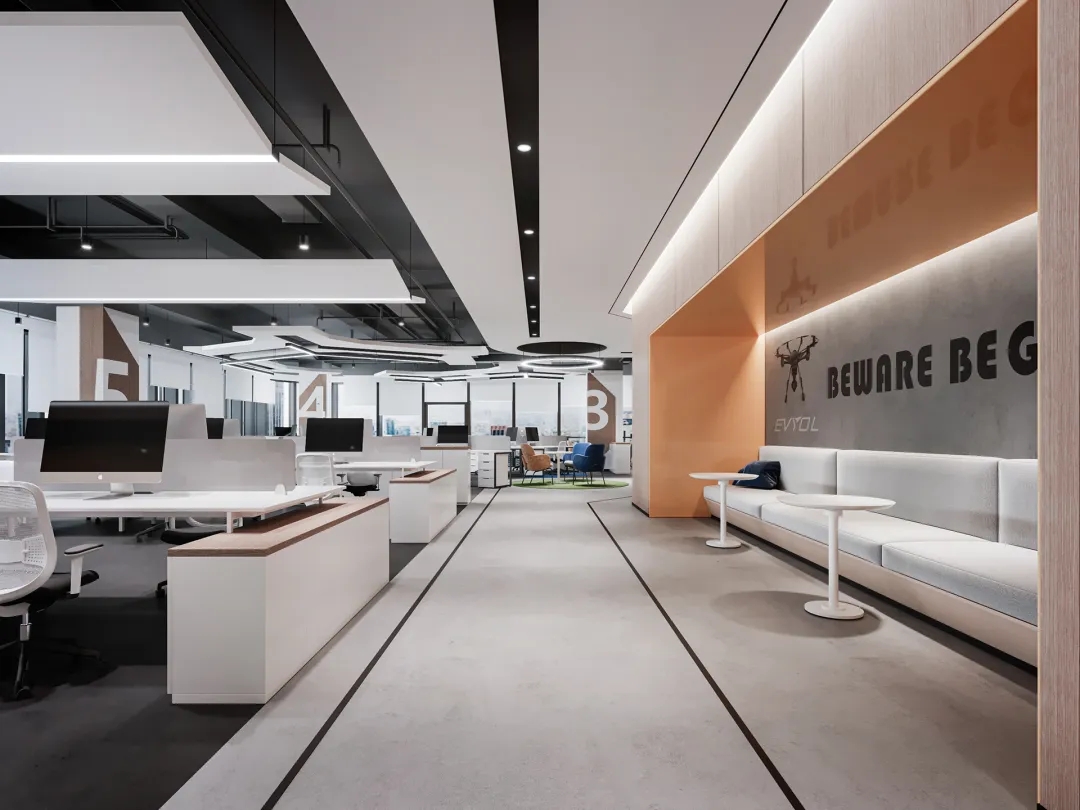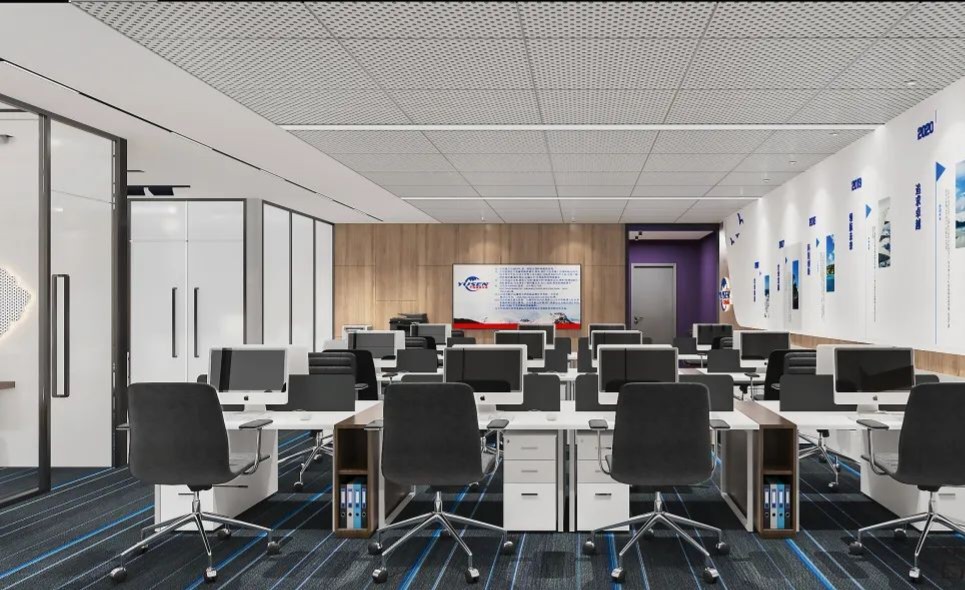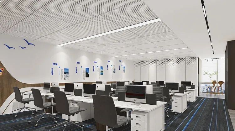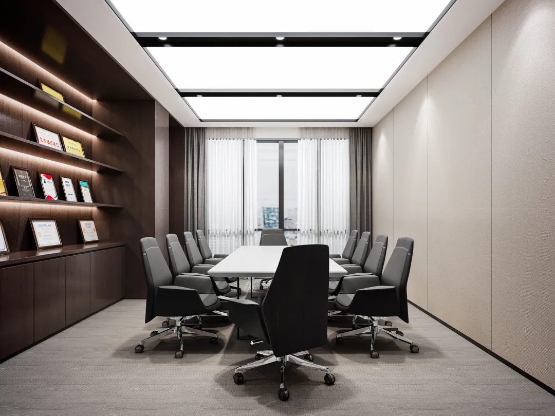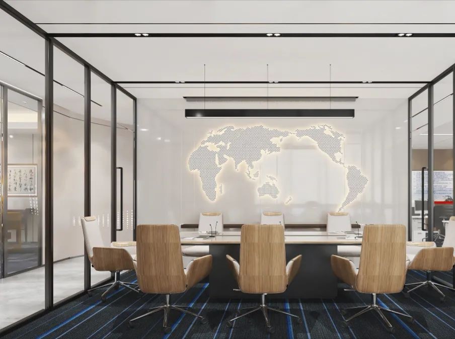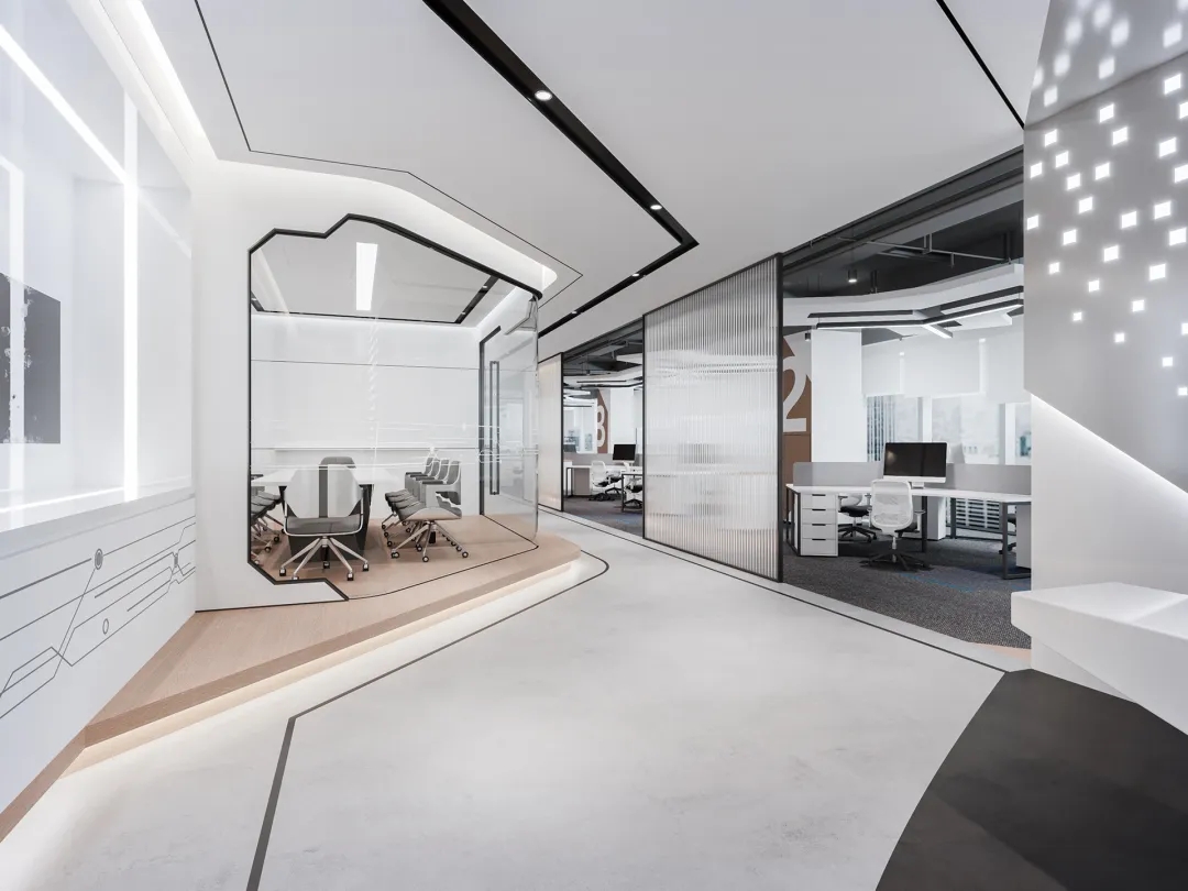 会议室和开放办公区,它们既是独立的,又和空间相互交融。通过长虹玻璃的连通着空间的节奏,顶面与地面的线条相互呼应,传递出空间的层次与未来感。