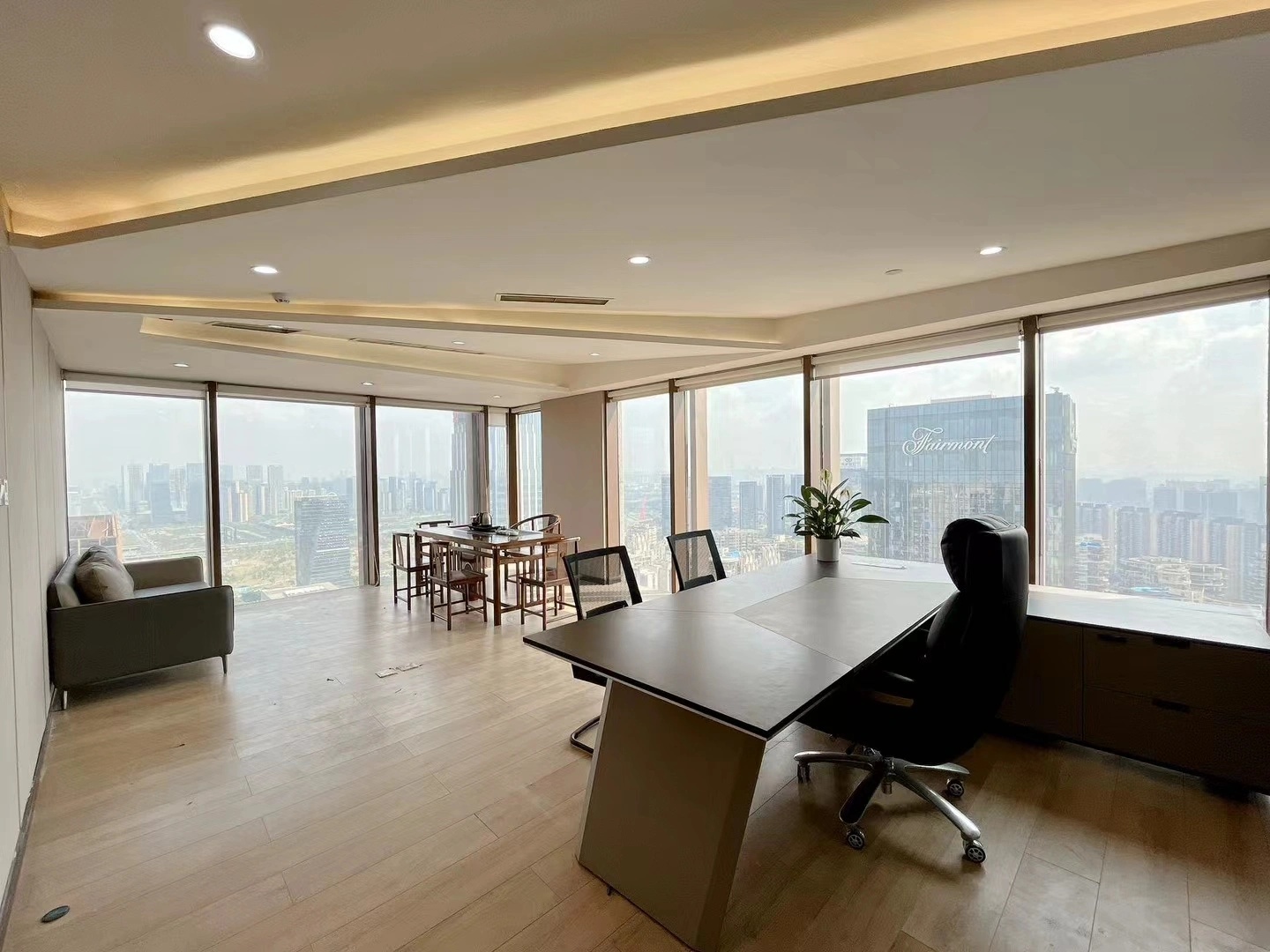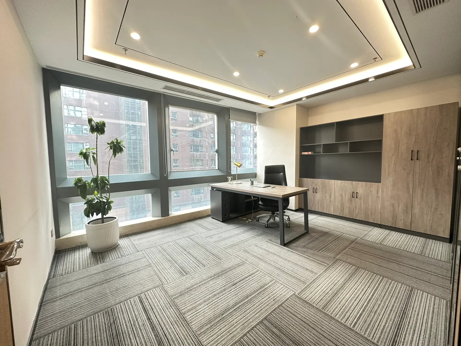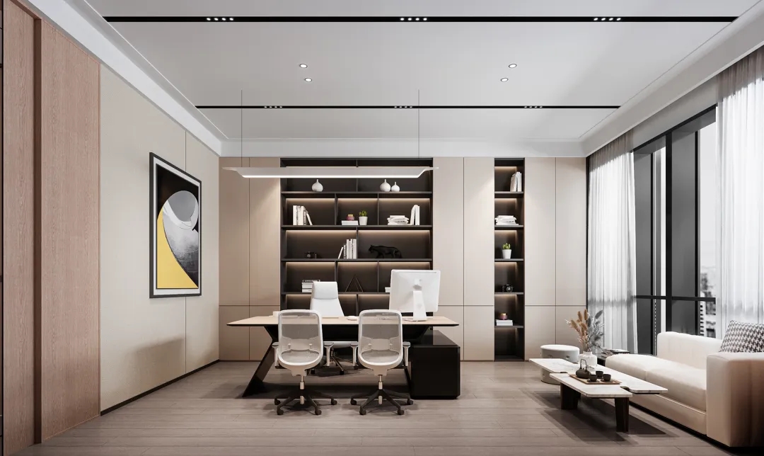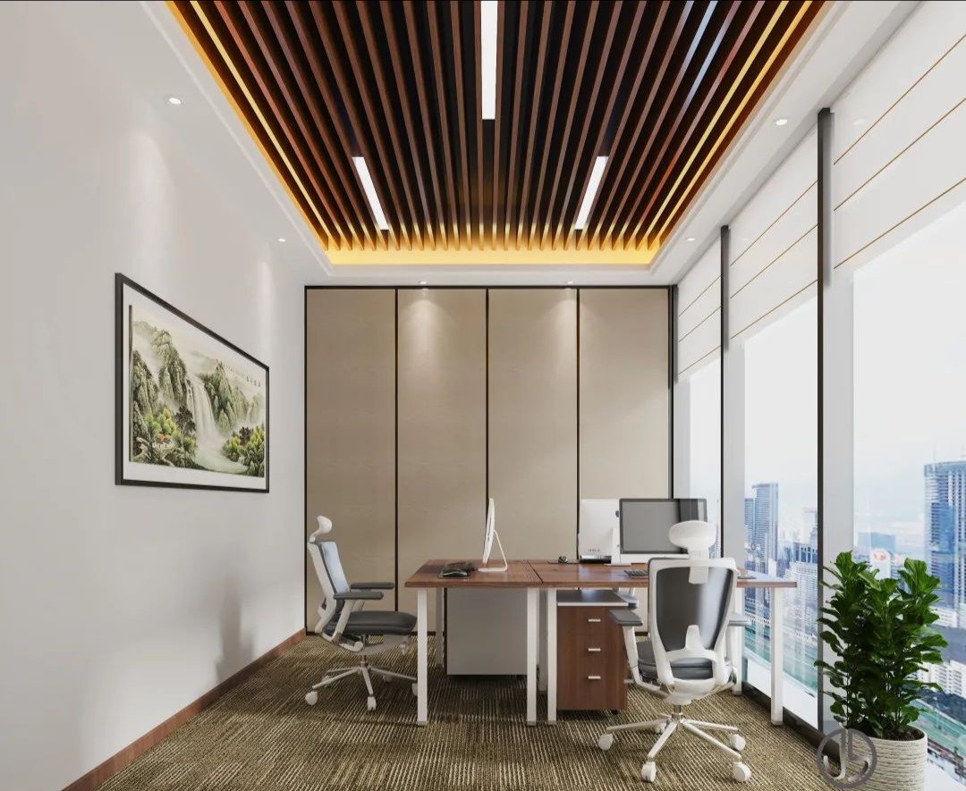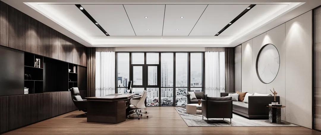 总经办增设茶艺区,采用新的现代手法,于室内造雅致之境。木质茶台送古韵,葱绿盘景点诗意。茶香飘于室内,慰藉日常的疲劳。
