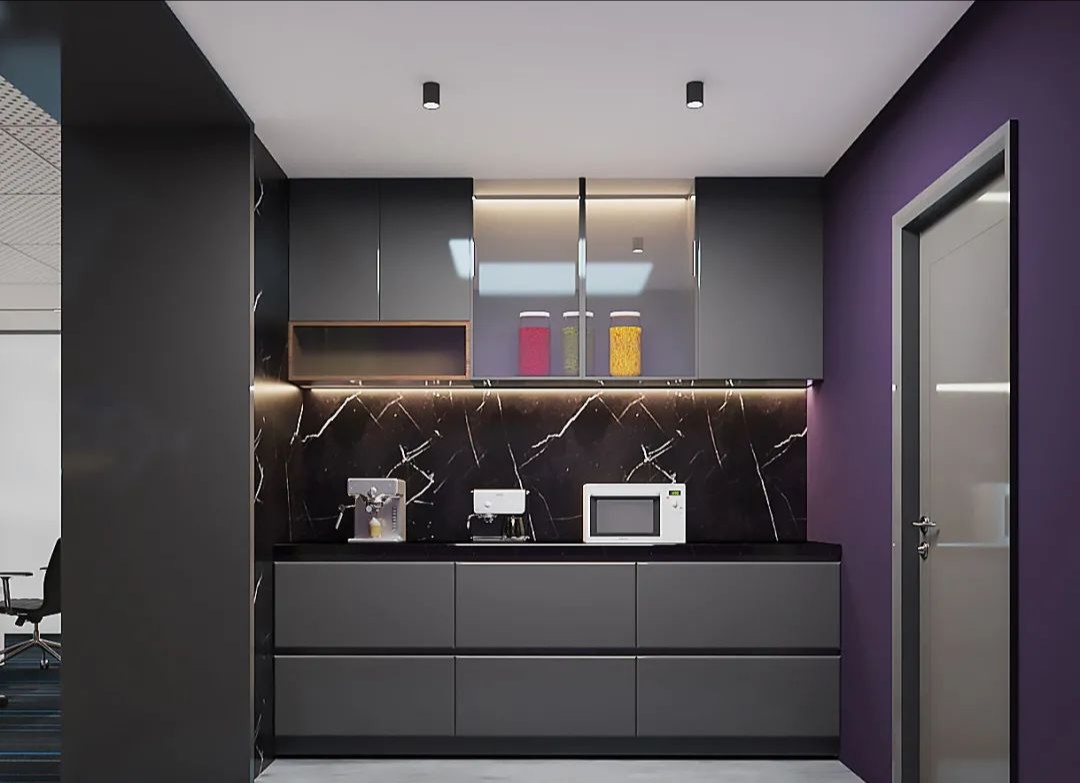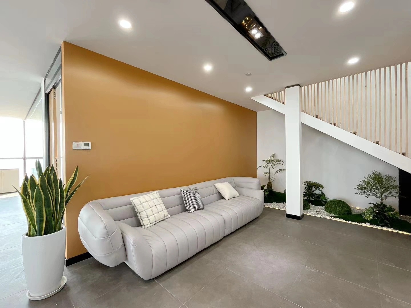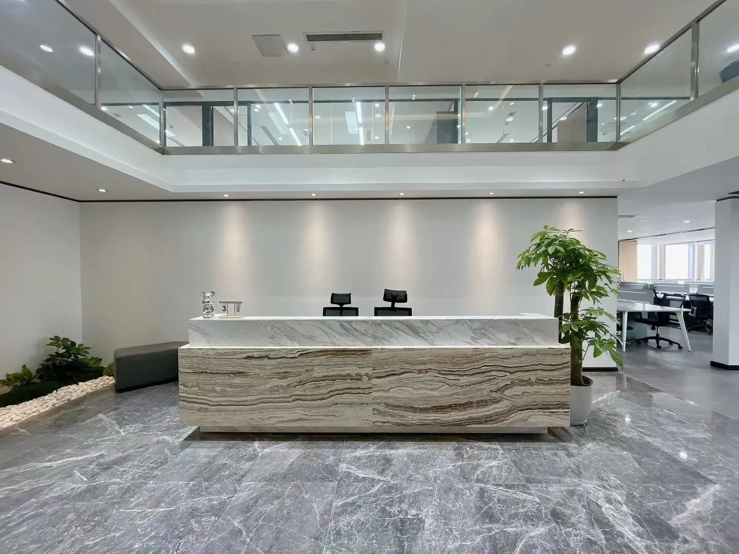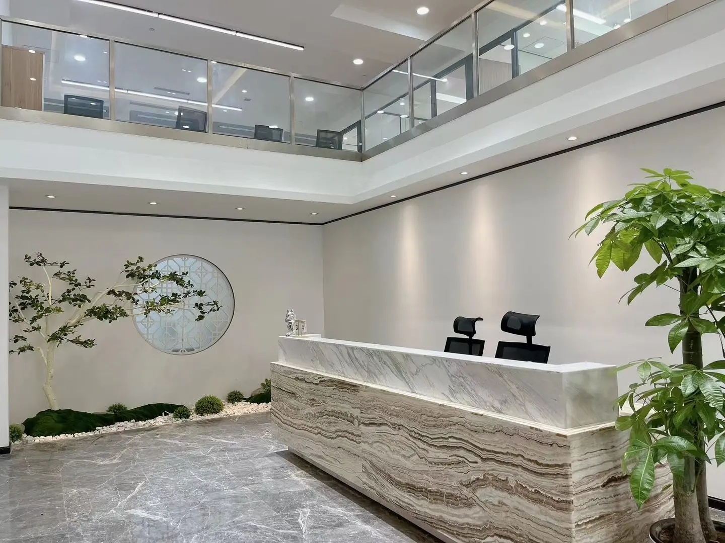 将本案空间当成一个整体的艺术品去打造,将办公空间变成艺术空间,同时加入现代人文,塑造办公室独特的气质。前台区域作为办公室的初步印象,投射艺术科技感。曲面造型勾勒出冷冽的线条,面与面之间相互交汇、重叠、融合,与一侧的金属艺术品进行趣味对话。