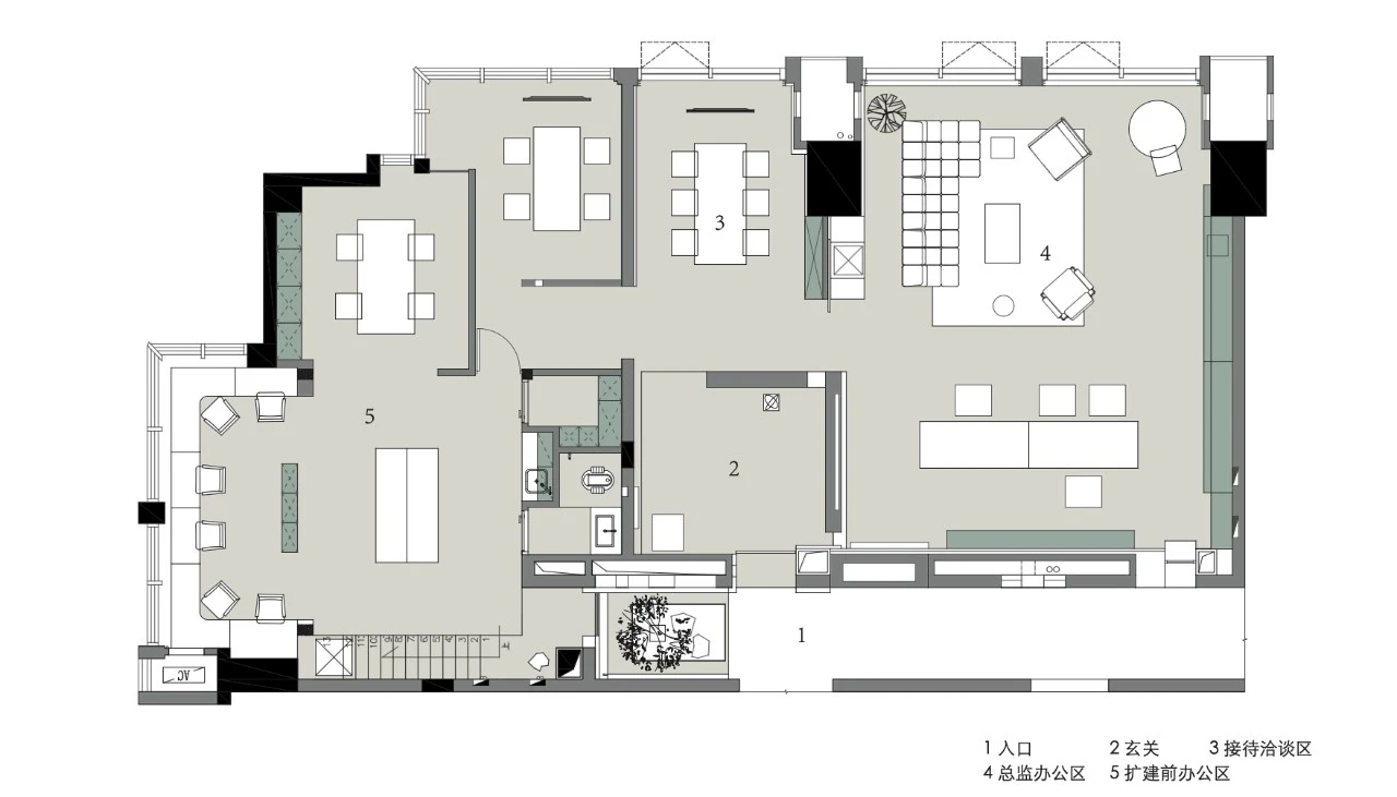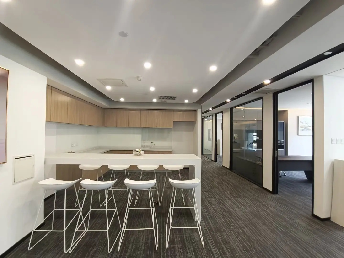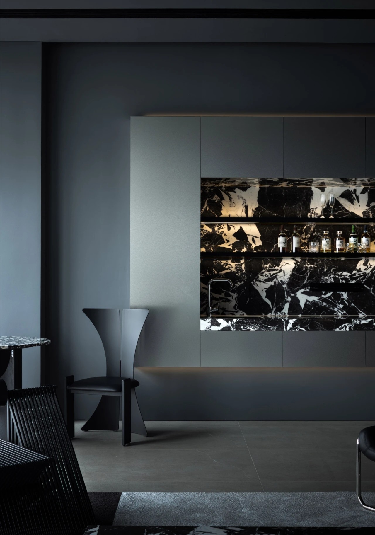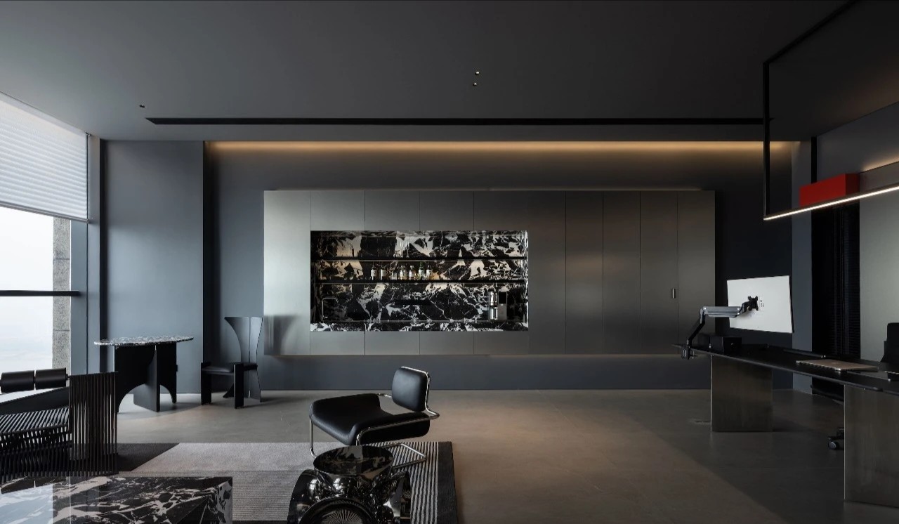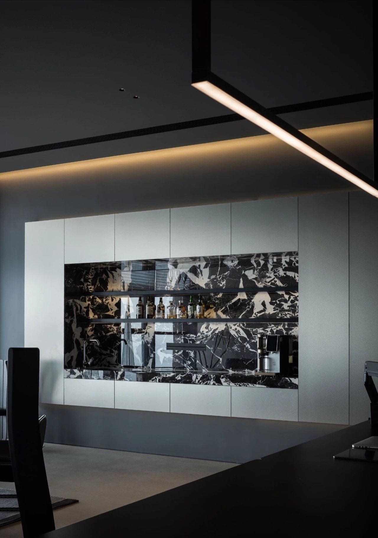 水吧台是办公室空间的另外一重标准体块,在中间背景里表达态度。穿插咬合的关系,在体块尺度中碰撞出平衡,这里既模拟了西厨吧台,也为日常活动及招待客人提供服务。宝格丽岩板的装饰面带来灵动性,不同高度的层板展示酒杯及酒水收藏。