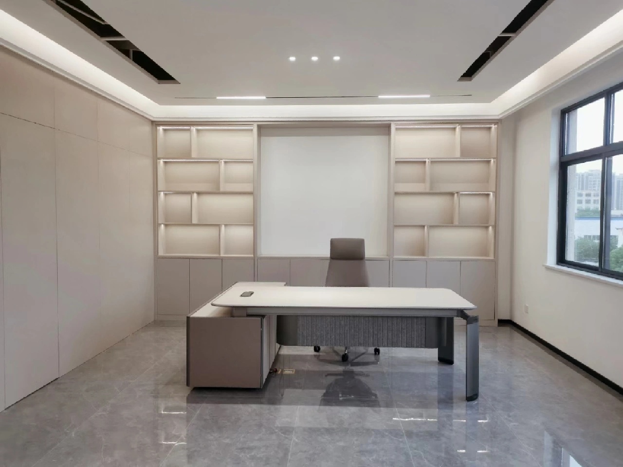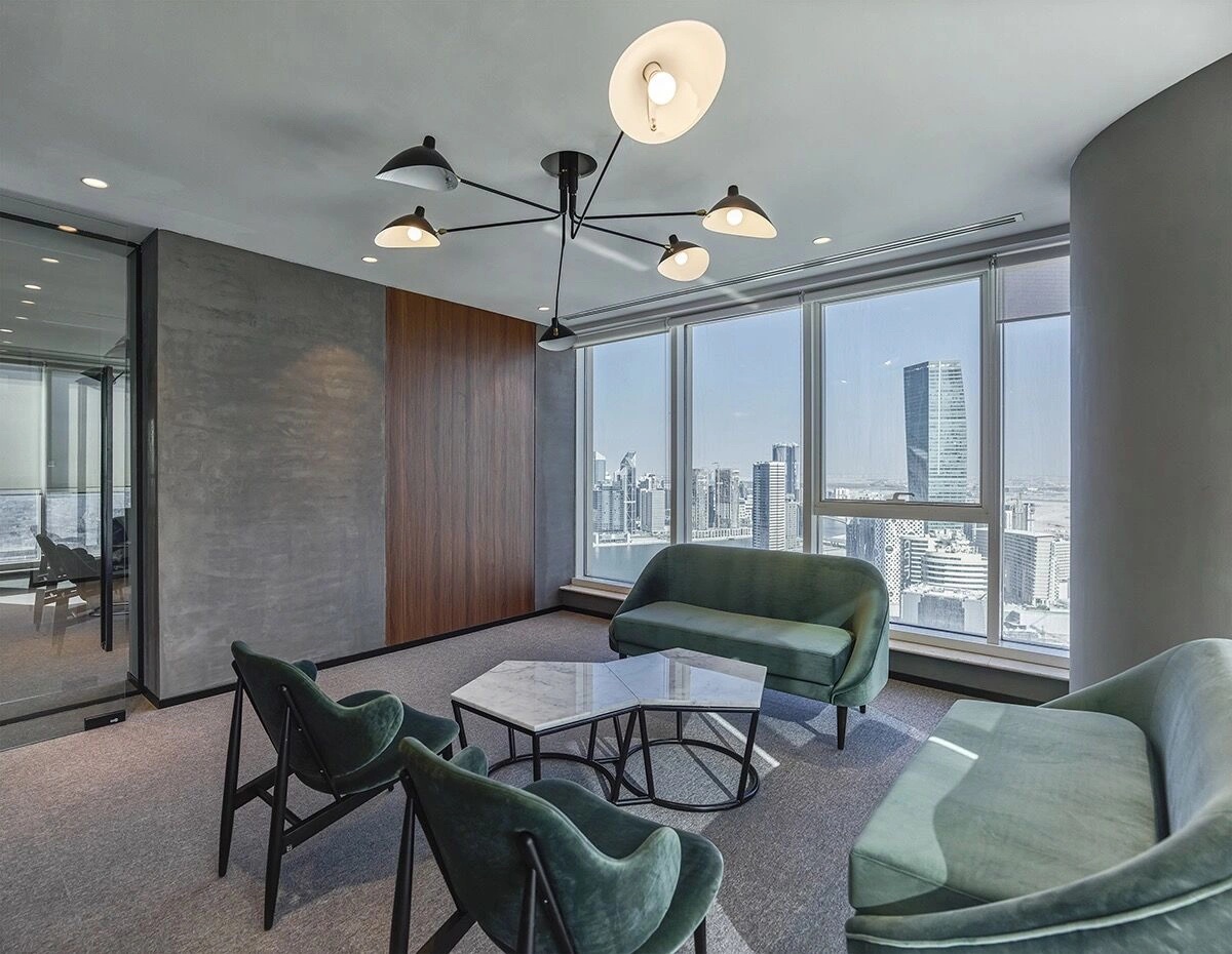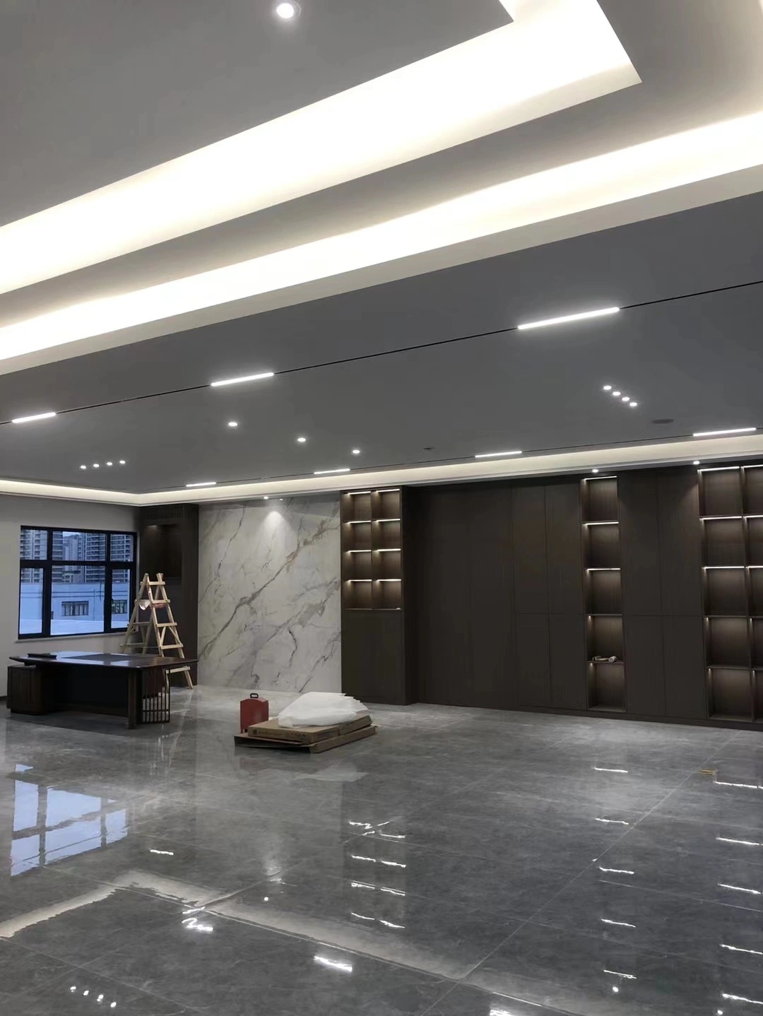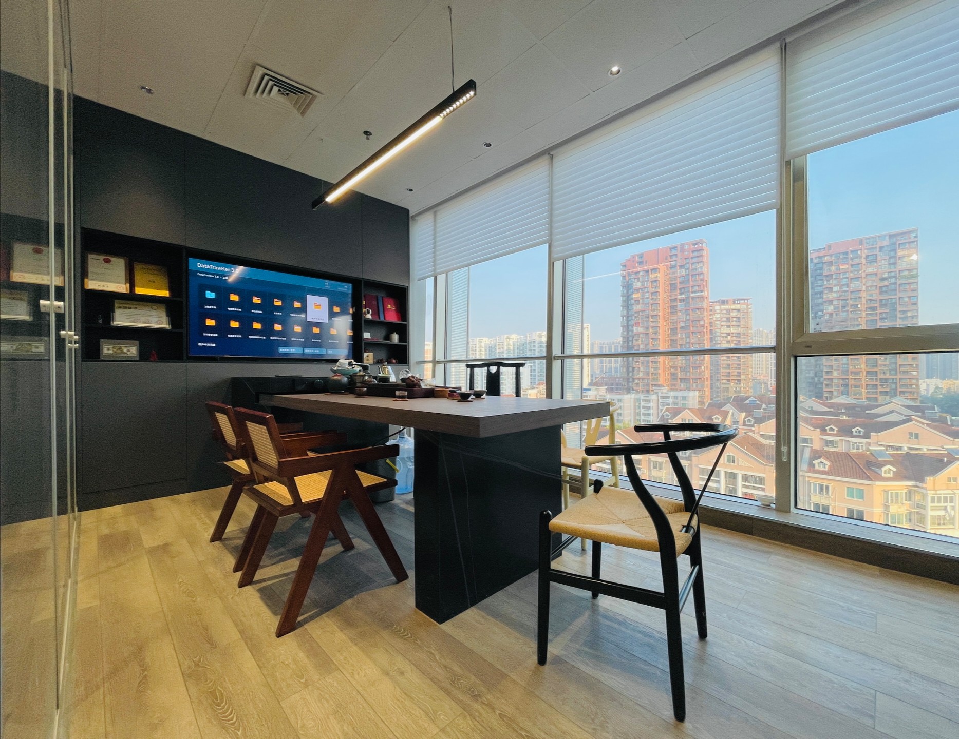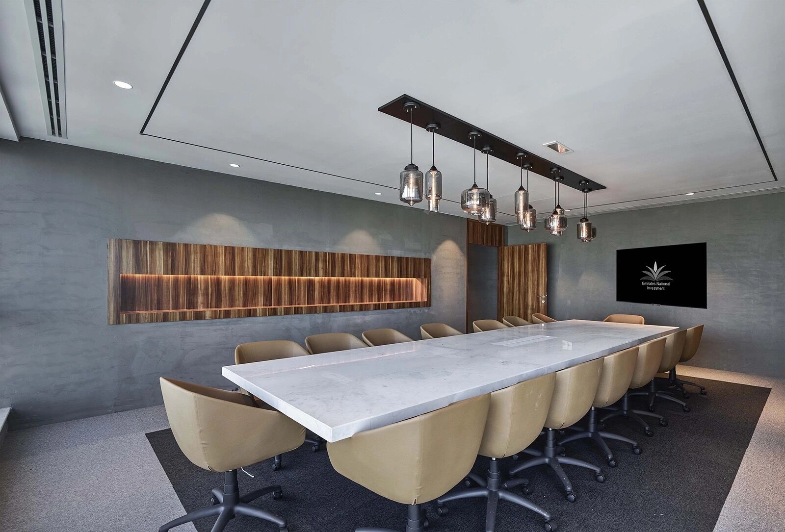 水吧台是办公室空间的另外一重标准体块,在中间背景里表达态度。穿插咬合的关系,在体块尺度中碰撞出平衡,这里既模拟了西厨吧台,也为日常活动及招待客人提供服务。宝格丽岩板的装饰面带来灵动性,不同高度的层板展示酒杯及酒水收藏。