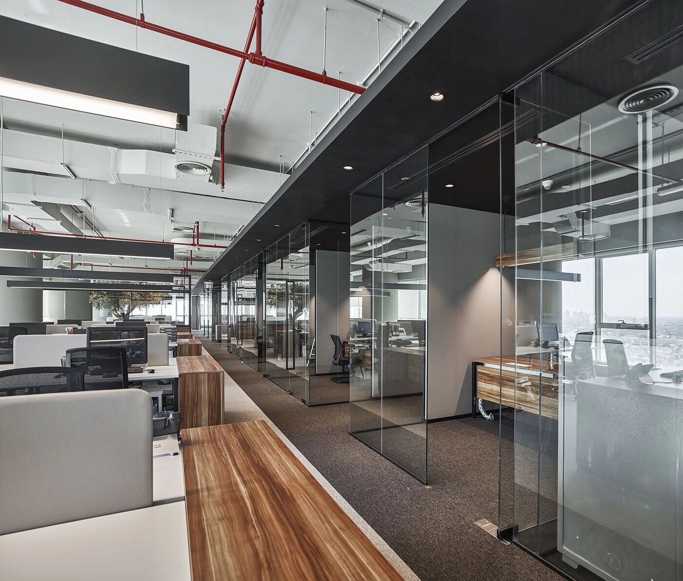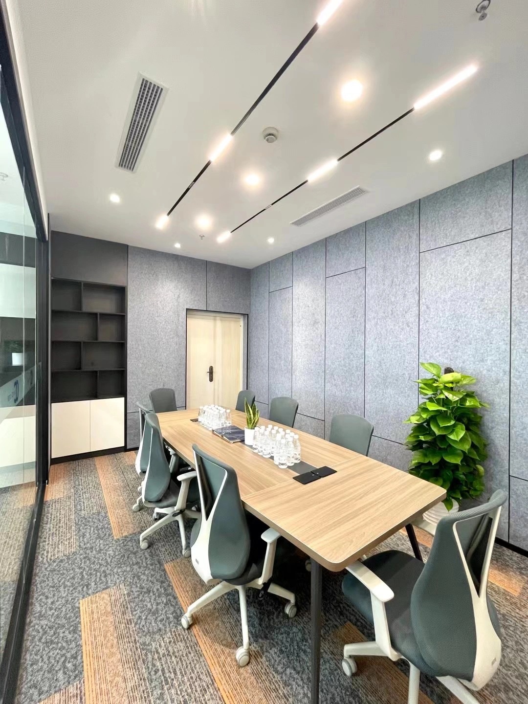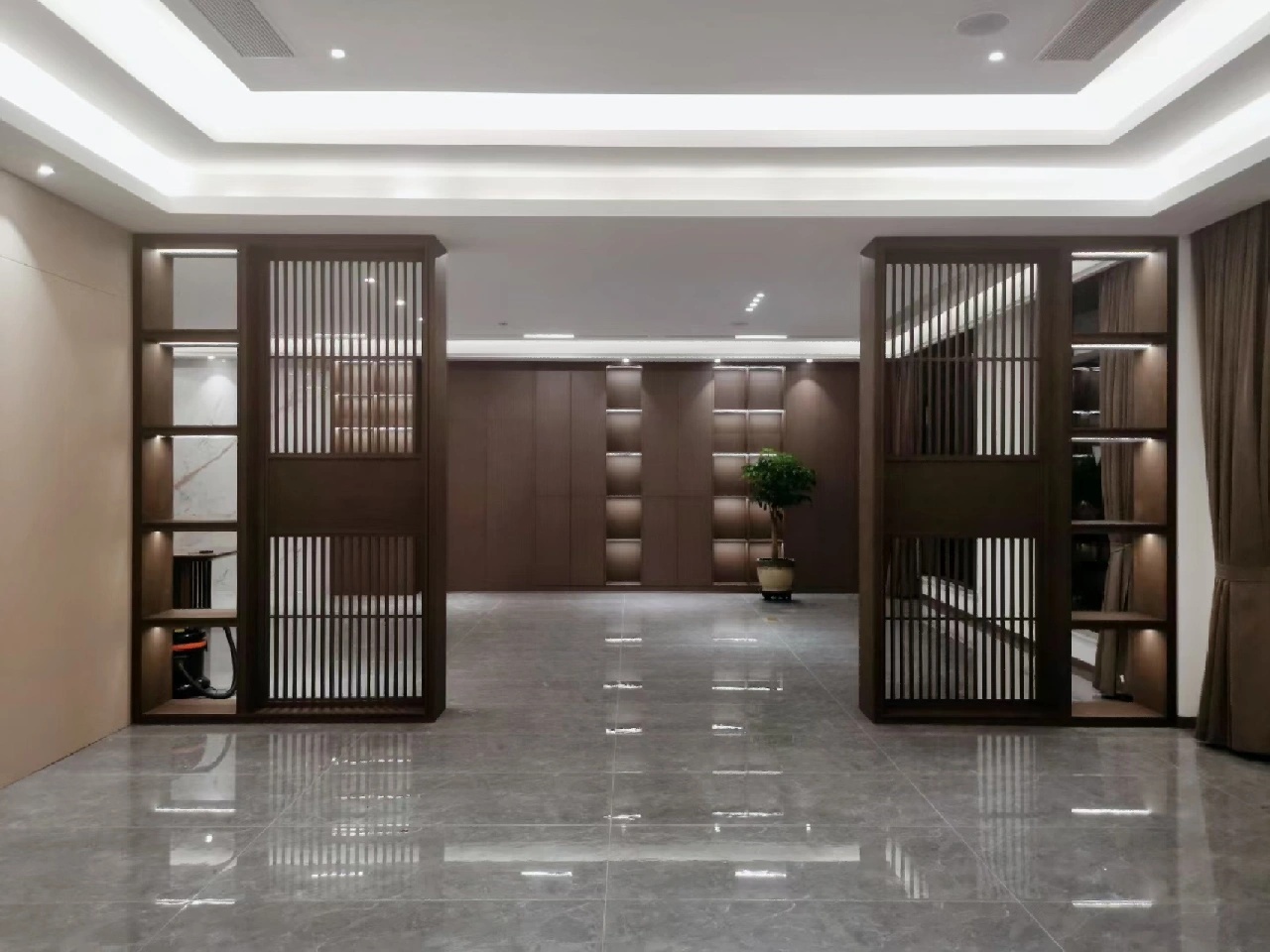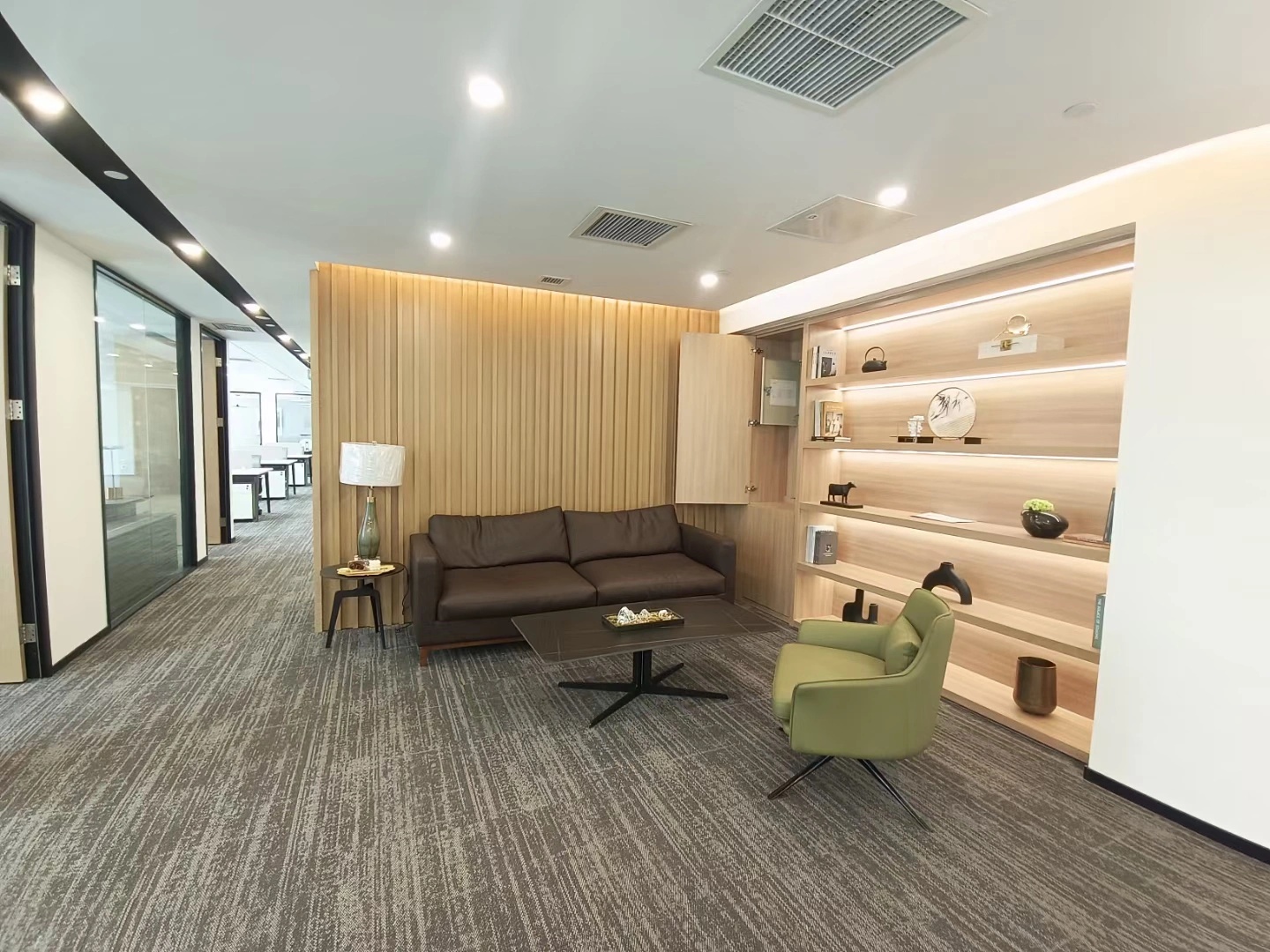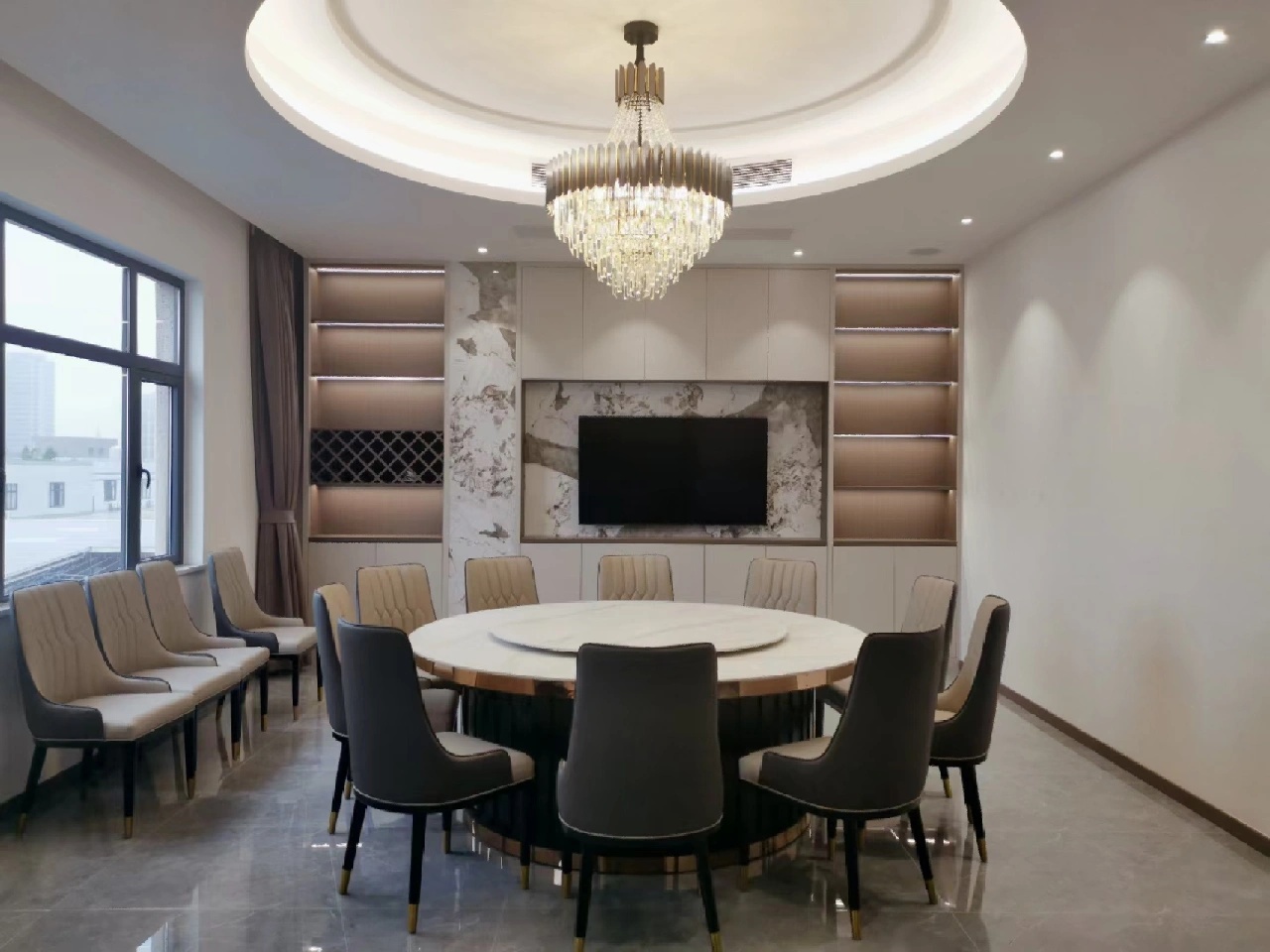 水吧台是办公室空间的另外一重标准体块,在中间背景里表达态度。穿插咬合的关系,在体块尺度中碰撞出平衡,这里既模拟了西厨吧台,也为日常活动及招待客人提供服务。宝格丽岩板的装饰面带来灵动性,不同高度的层板展示酒杯及酒水收藏。