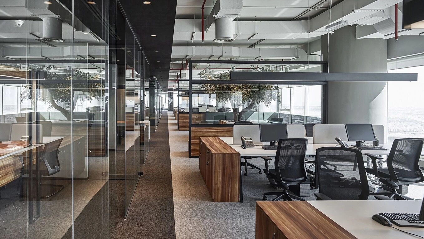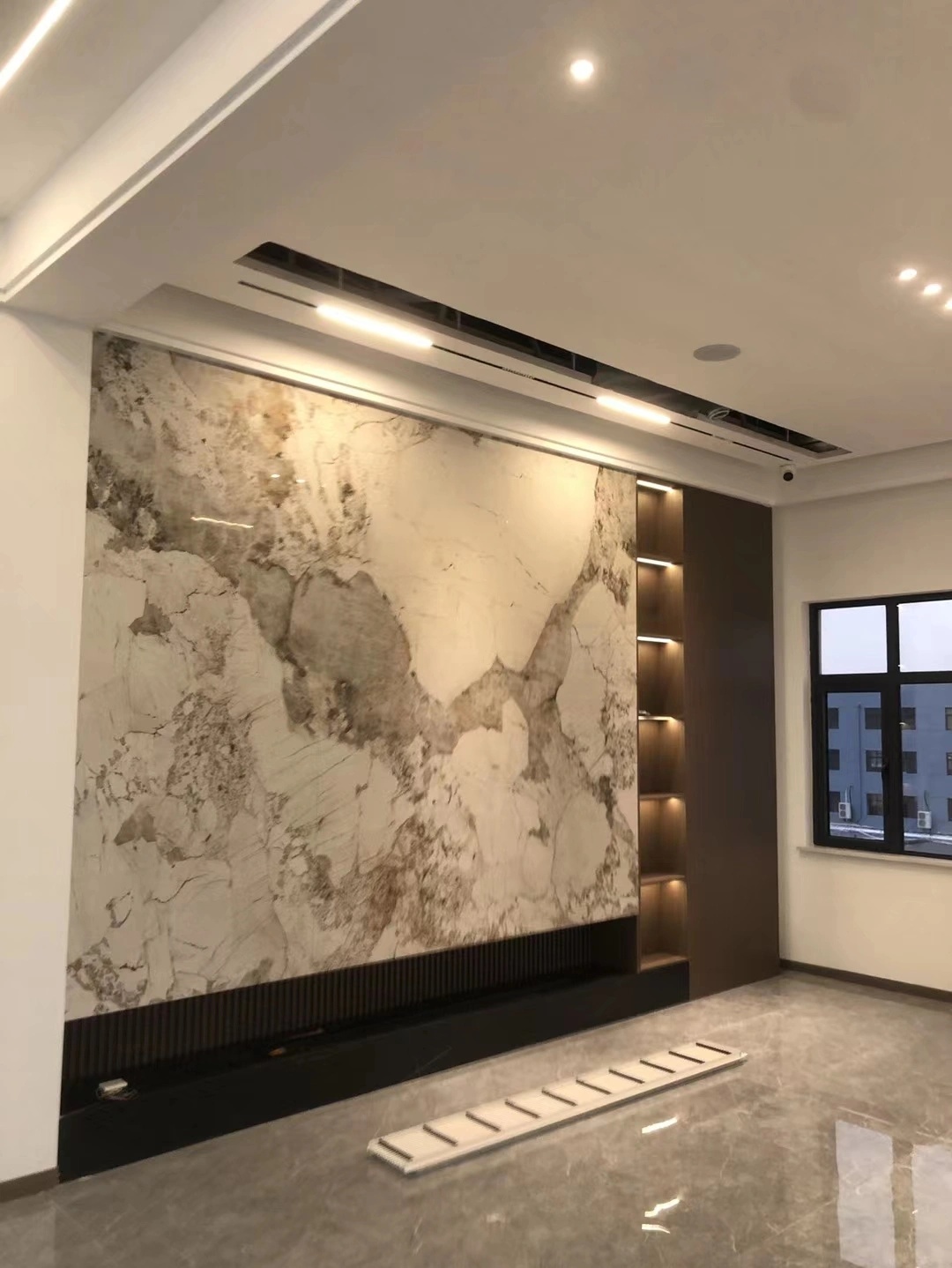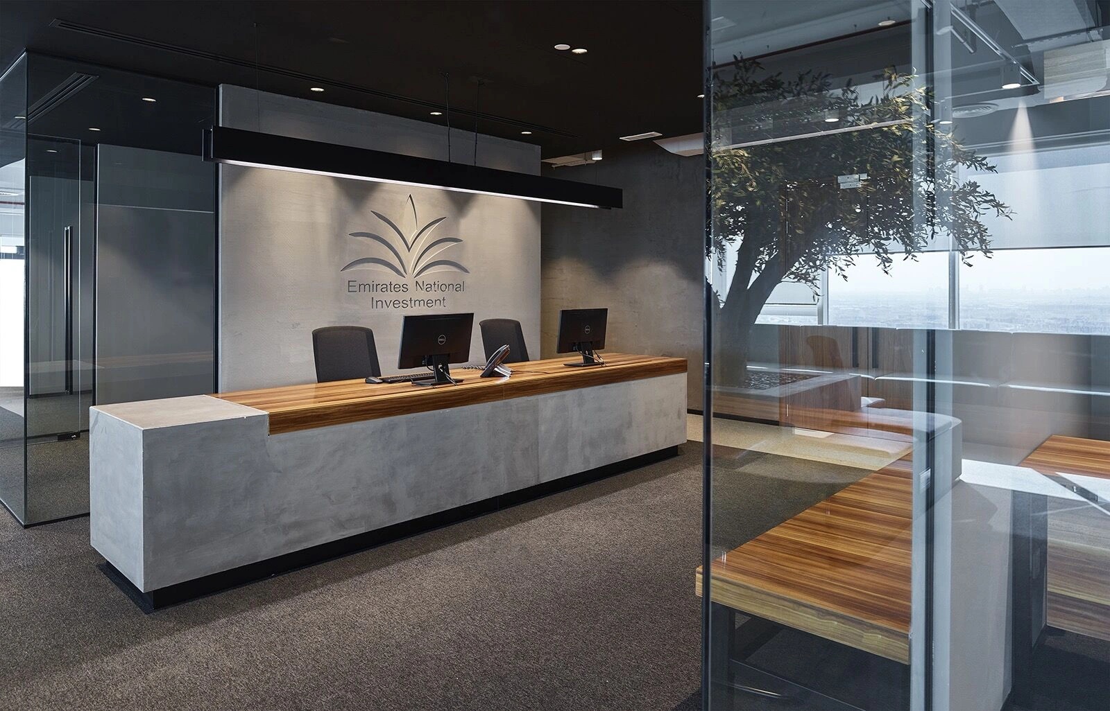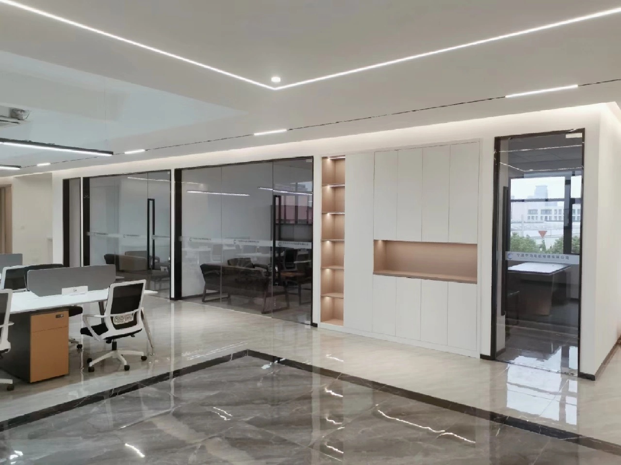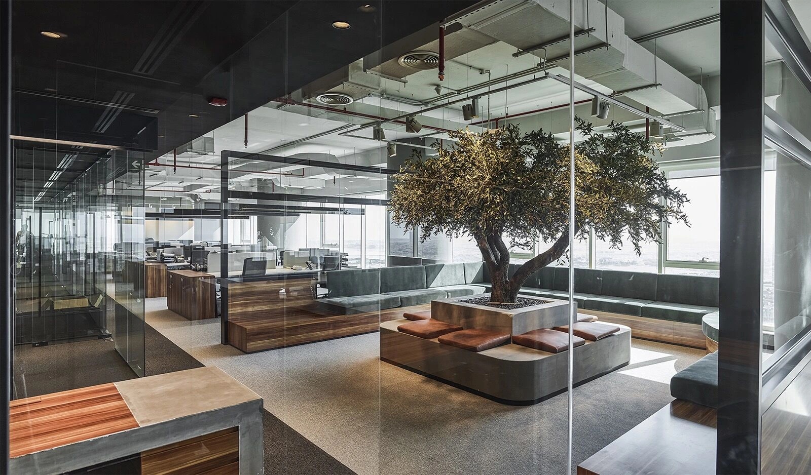 水吧台是办公室空间的另外一重标准体块,在中间背景里表达态度。穿插咬合的关系,在体块尺度中碰撞出平衡,这里既模拟了西厨吧台,也为日常活动及招待客人提供服务。宝格丽岩板的装饰面带来灵动性,不同高度的层板展示酒杯及酒水收藏。