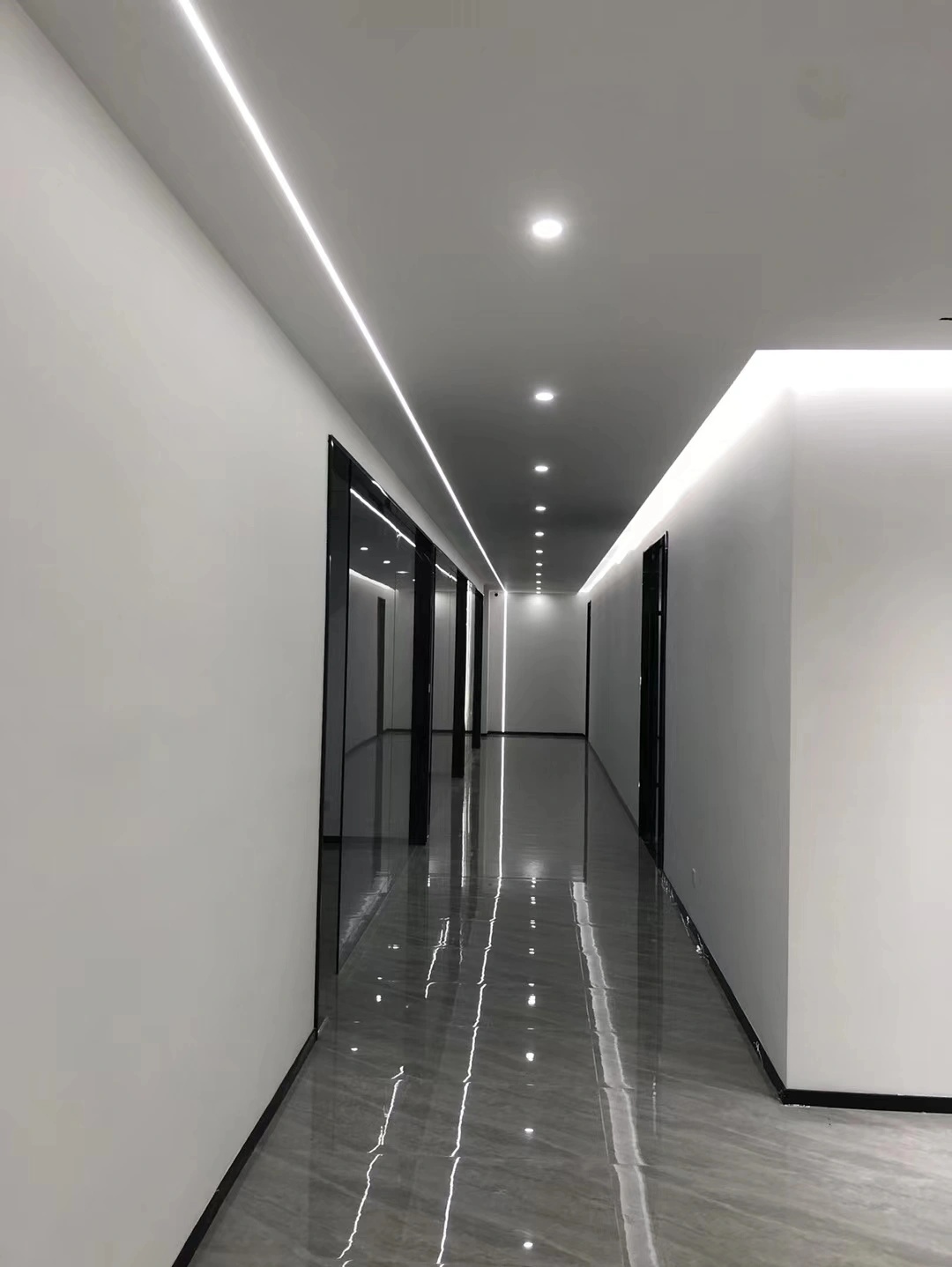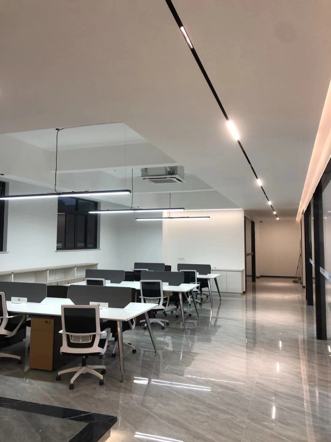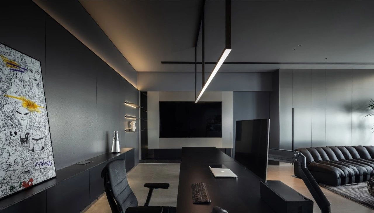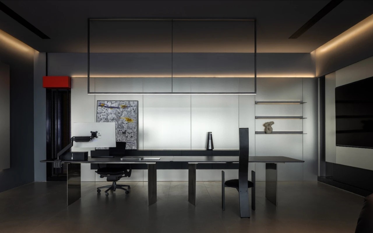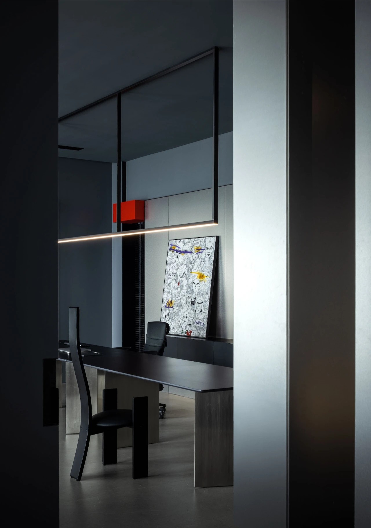 电视背景是从玄关区过渡而来的方块,融合于整个空间的韵律中。水平和垂直线无处不在,所有墙面都包裹了金属板,不同高度和材料过渡位置都增加了线性灯光,增强空间轮廓和立体感。4.2米的超长办公桌和长条灯都是特别定制,墙上的红色小方块隐喻了蒙德里安。