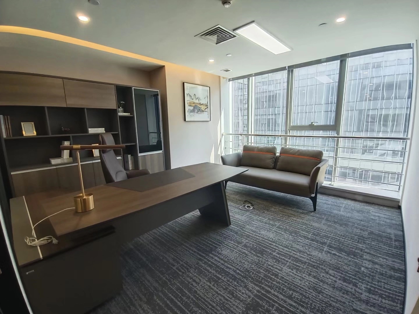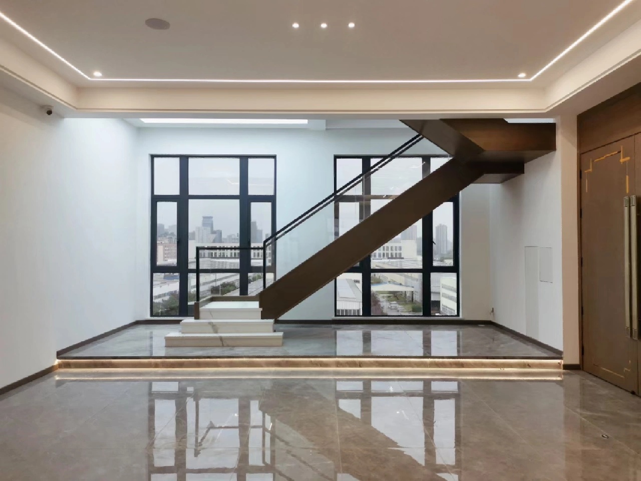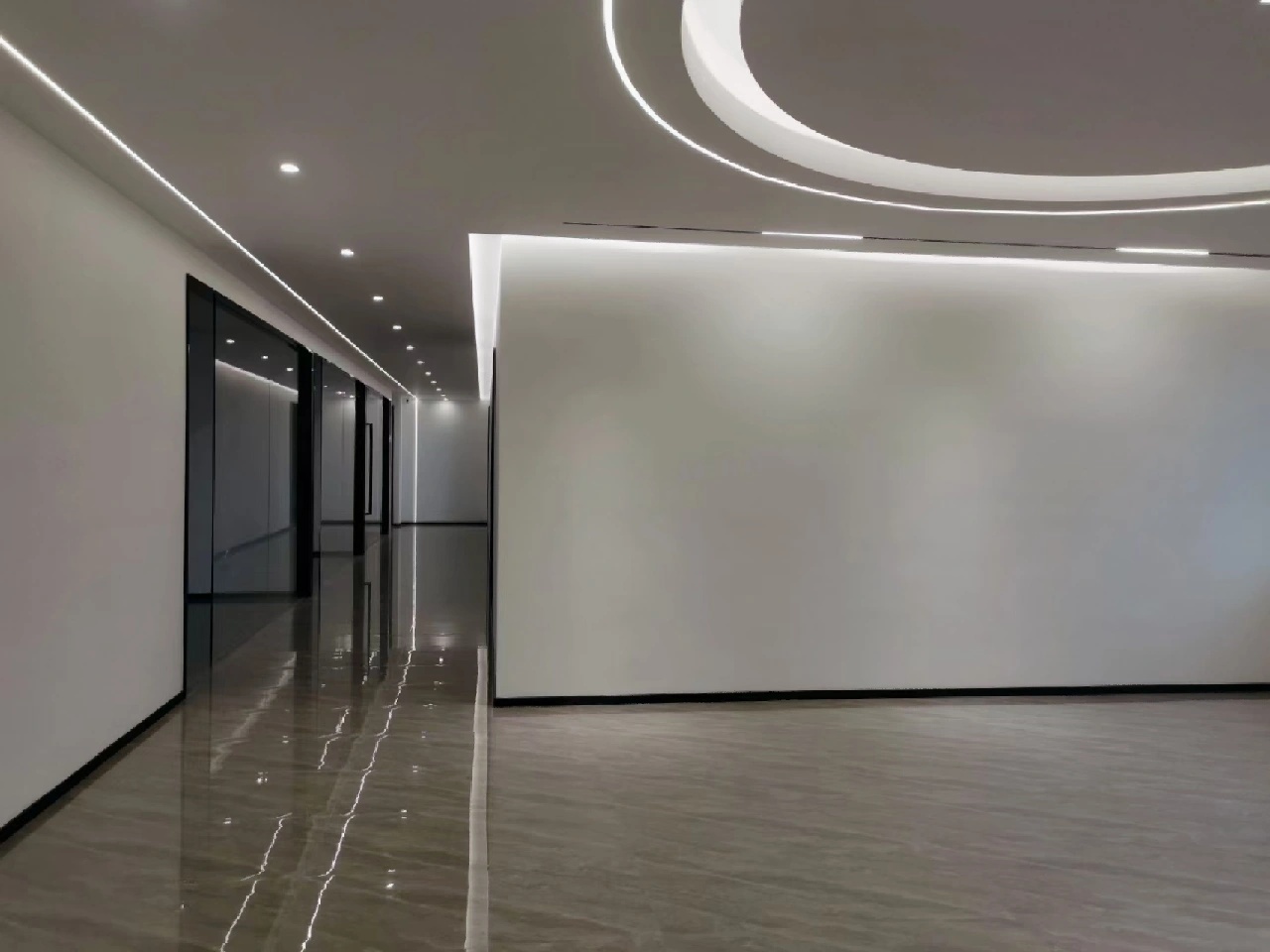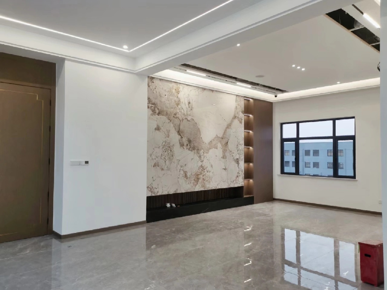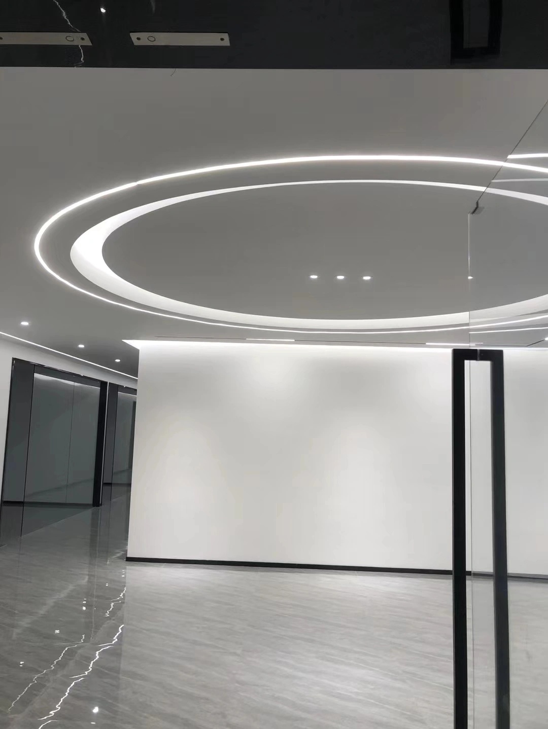 电视背景是从玄关区过渡而来的方块,融合于整个空间的韵律中。水平和垂直线无处不在,所有墙面都包裹了金属板,不同高度和材料过渡位置都增加了线性灯光,增强空间轮廓和立体感。4.2米的超长办公桌和长条灯都是特别定制,墙上的红色小方块隐喻了蒙德里安。
