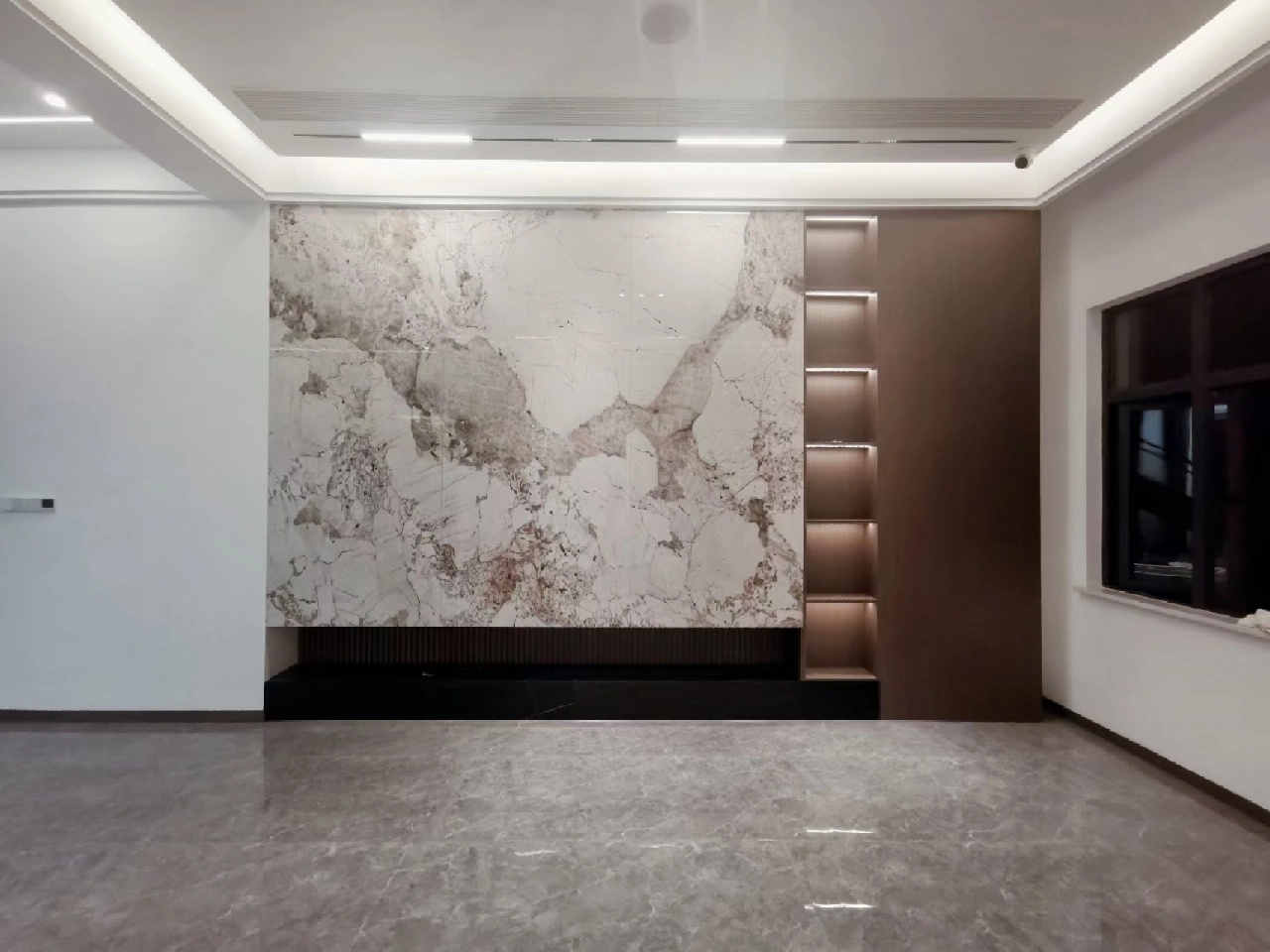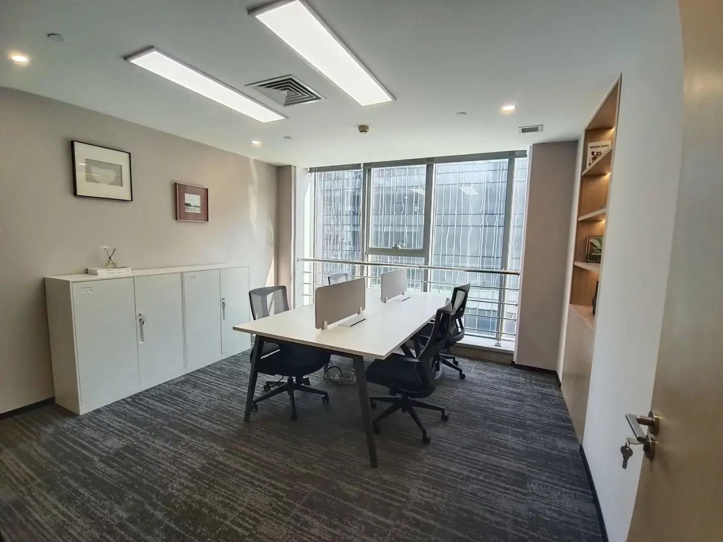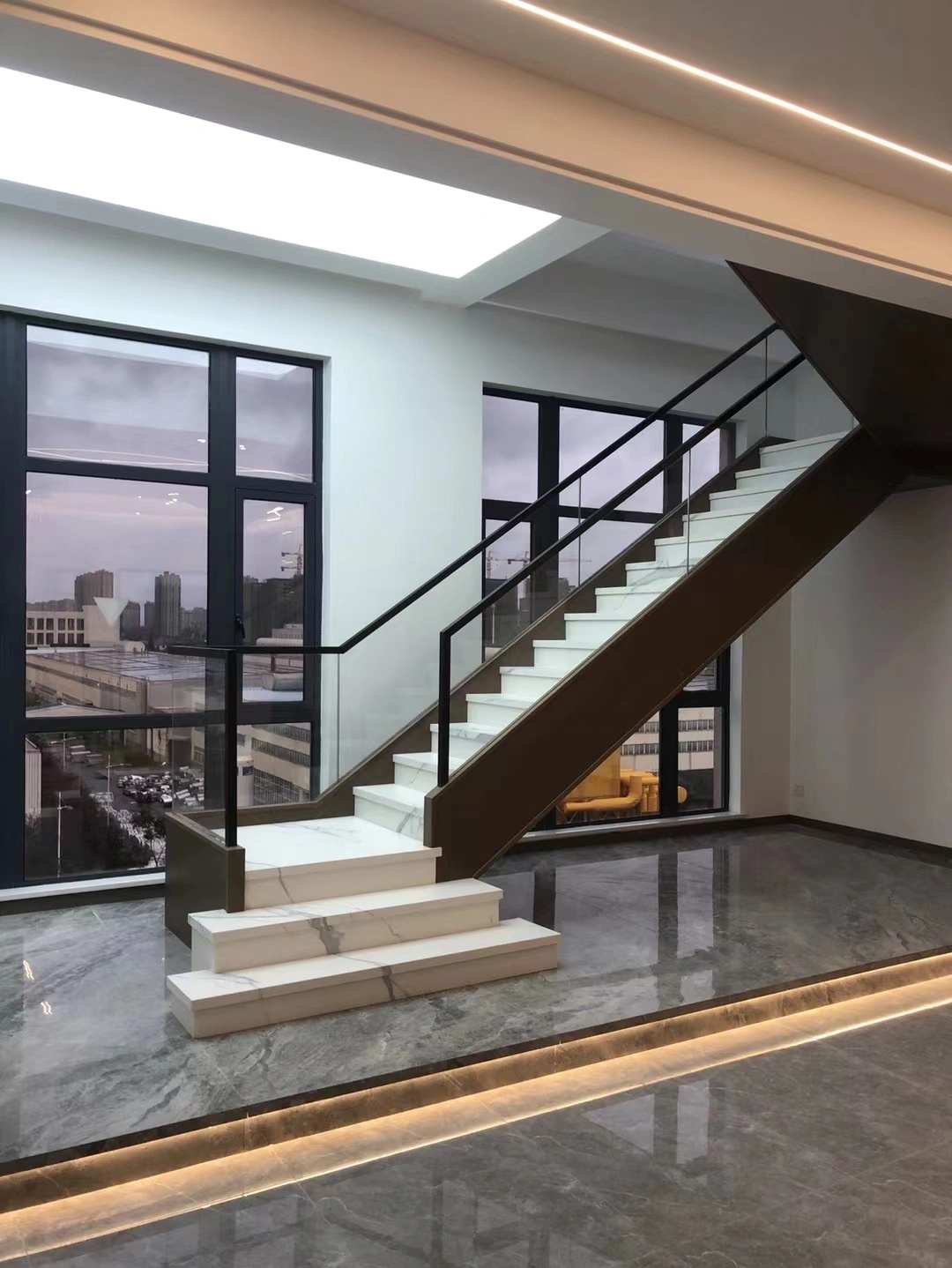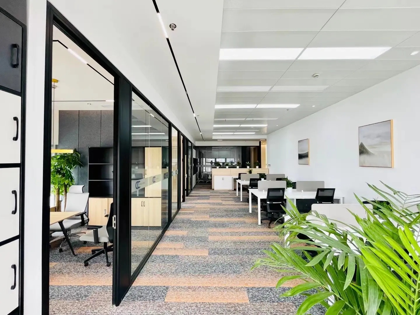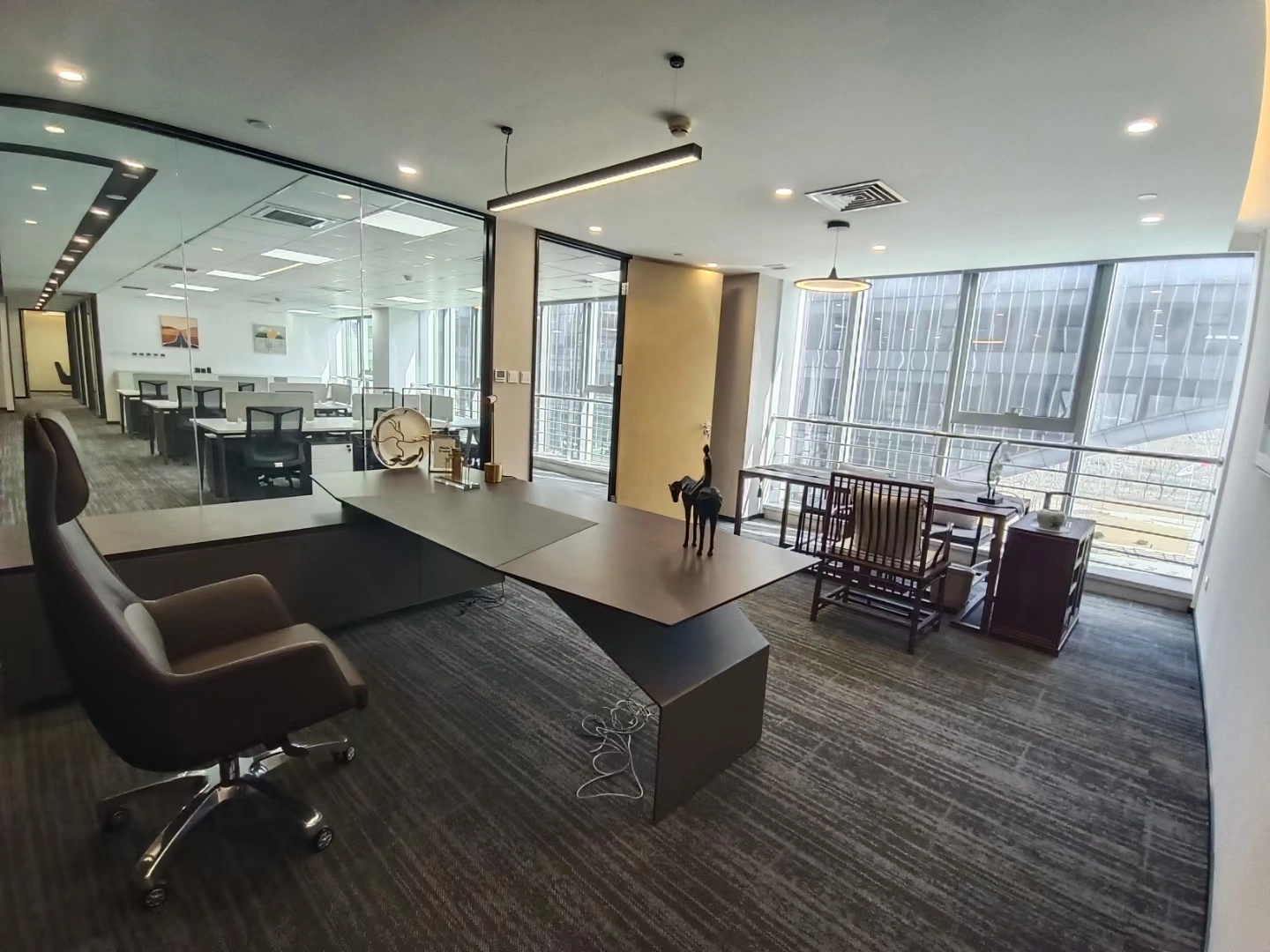 电视背景是从玄关区过渡而来的方块,融合于整个空间的韵律中。水平和垂直线无处不在,所有墙面都包裹了金属板,不同高度和材料过渡位置都增加了线性灯光,增强空间轮廓和立体感。4.2米的超长办公桌和长条灯都是特别定制,墙上的红色小方块隐喻了蒙德里安。
