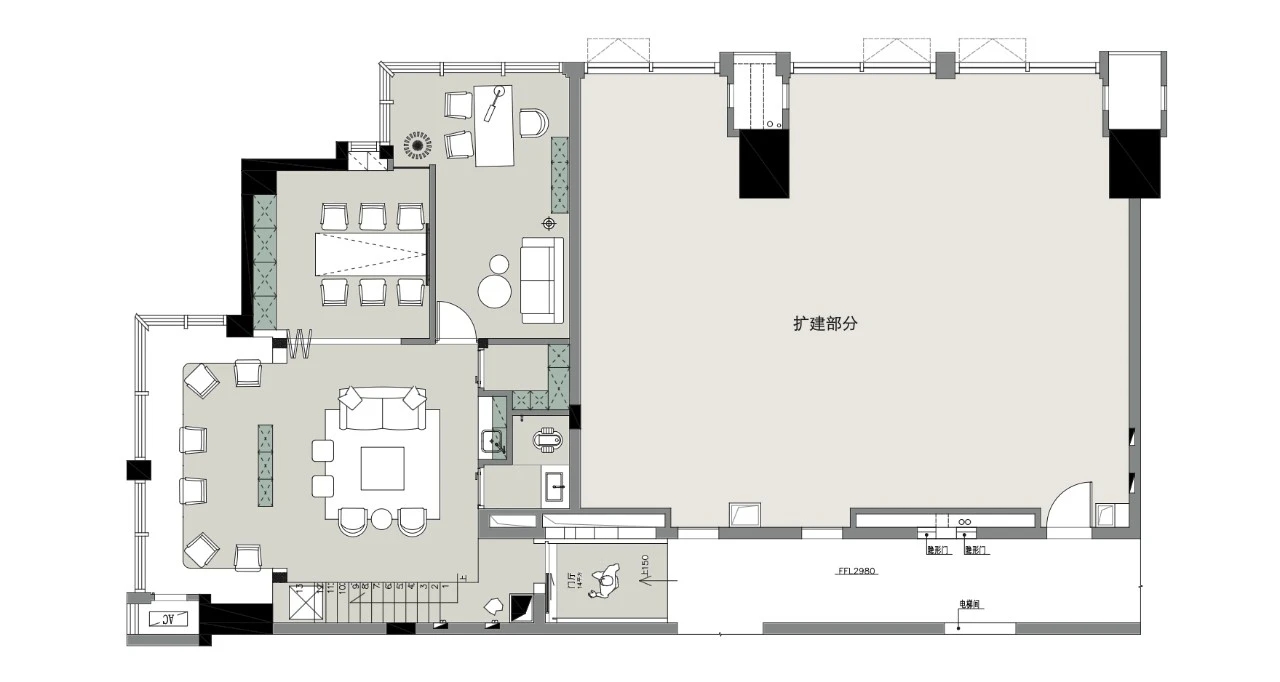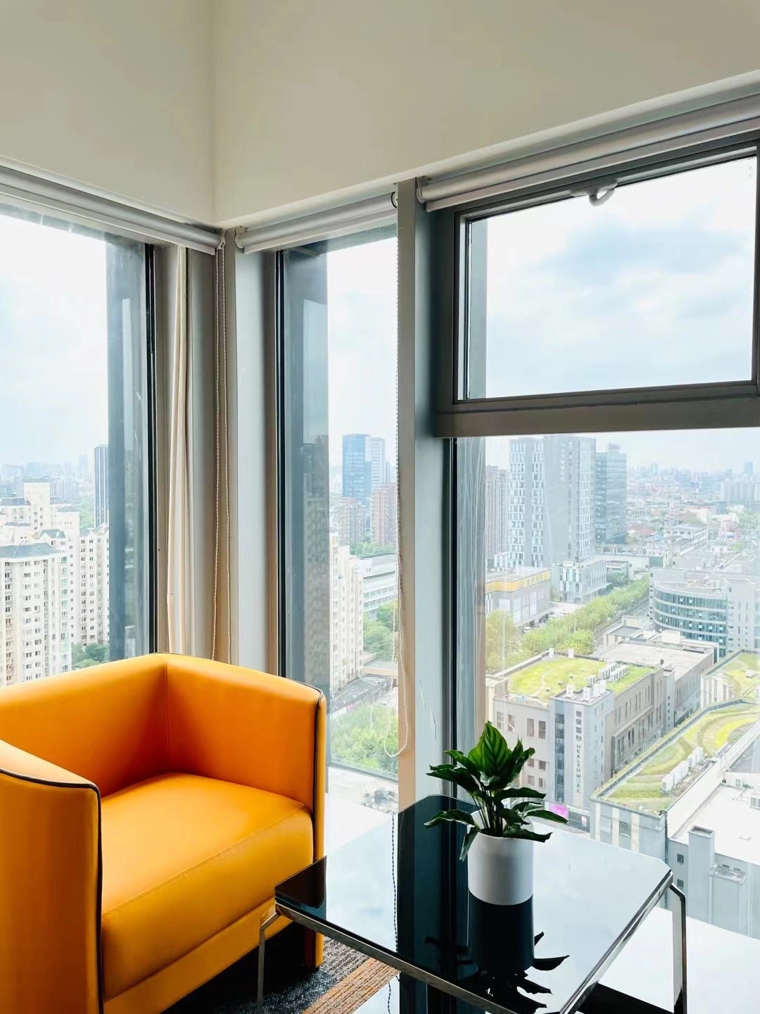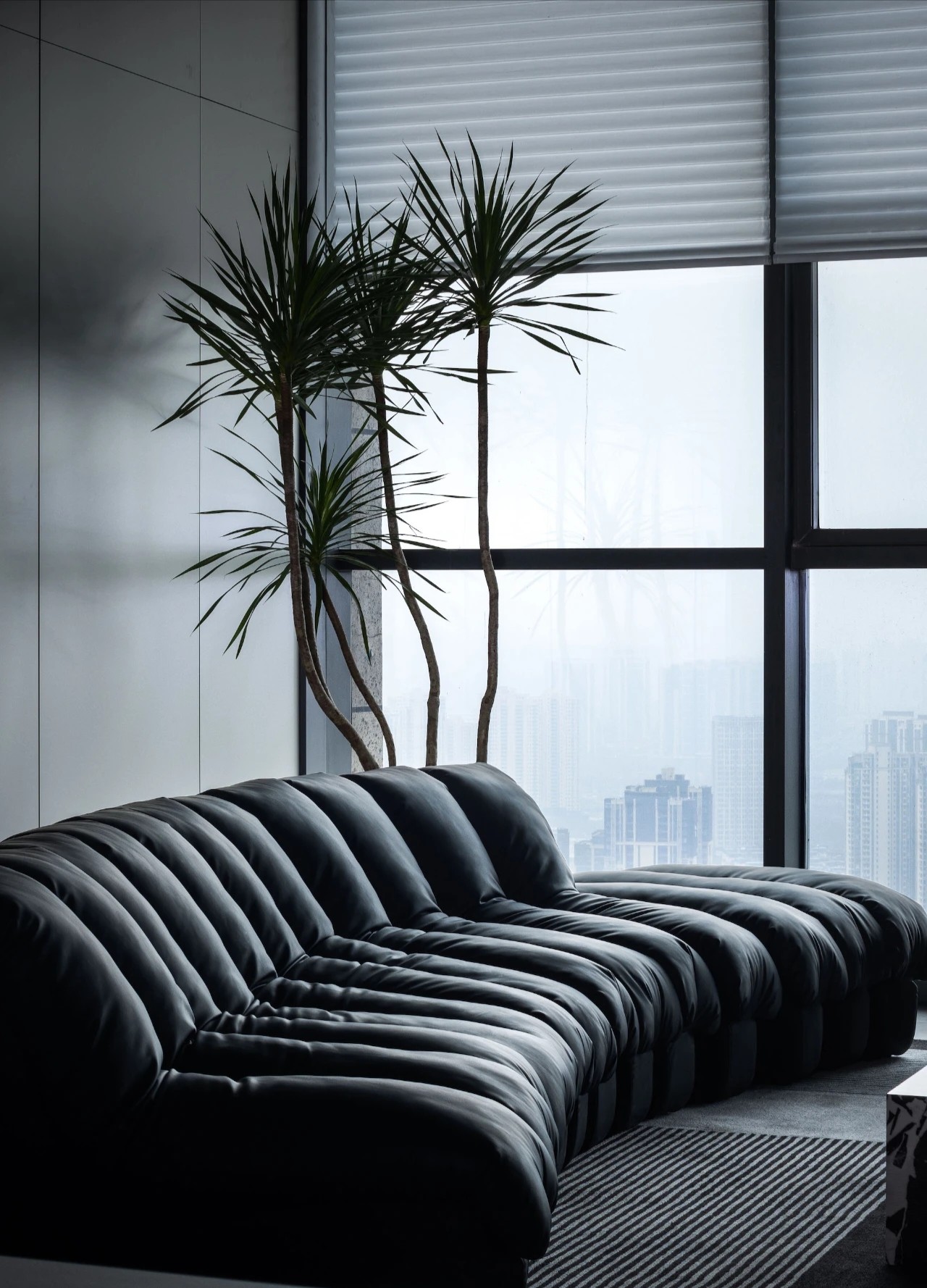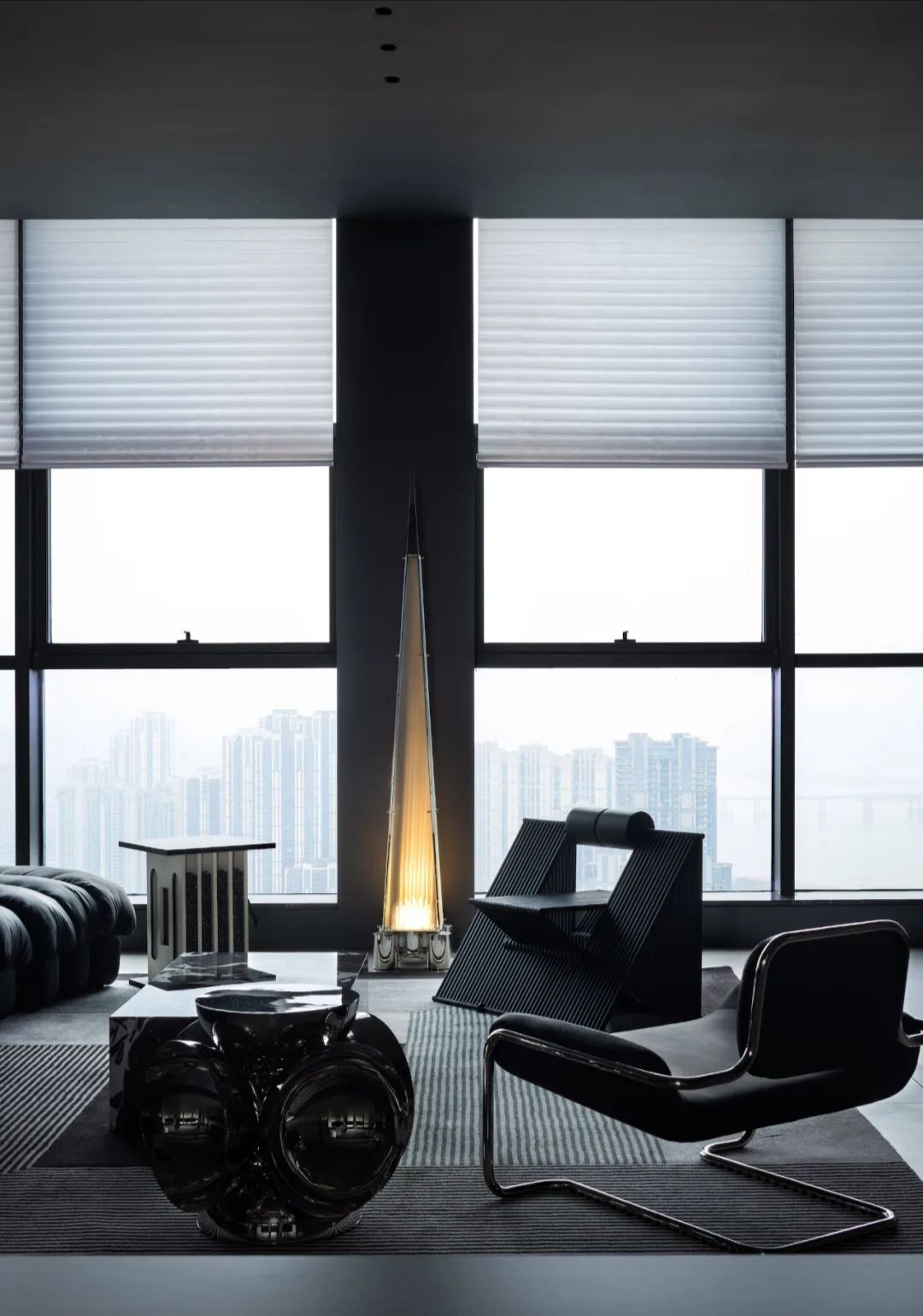 看向江景的方向,模拟了居家客厅,沙发和地毯传达生活气息,中古家具也摆放在相互平衡的位置。每个面都是呼应和对称的,在体块的尺度、比例中碰撞出微妙的平衡。