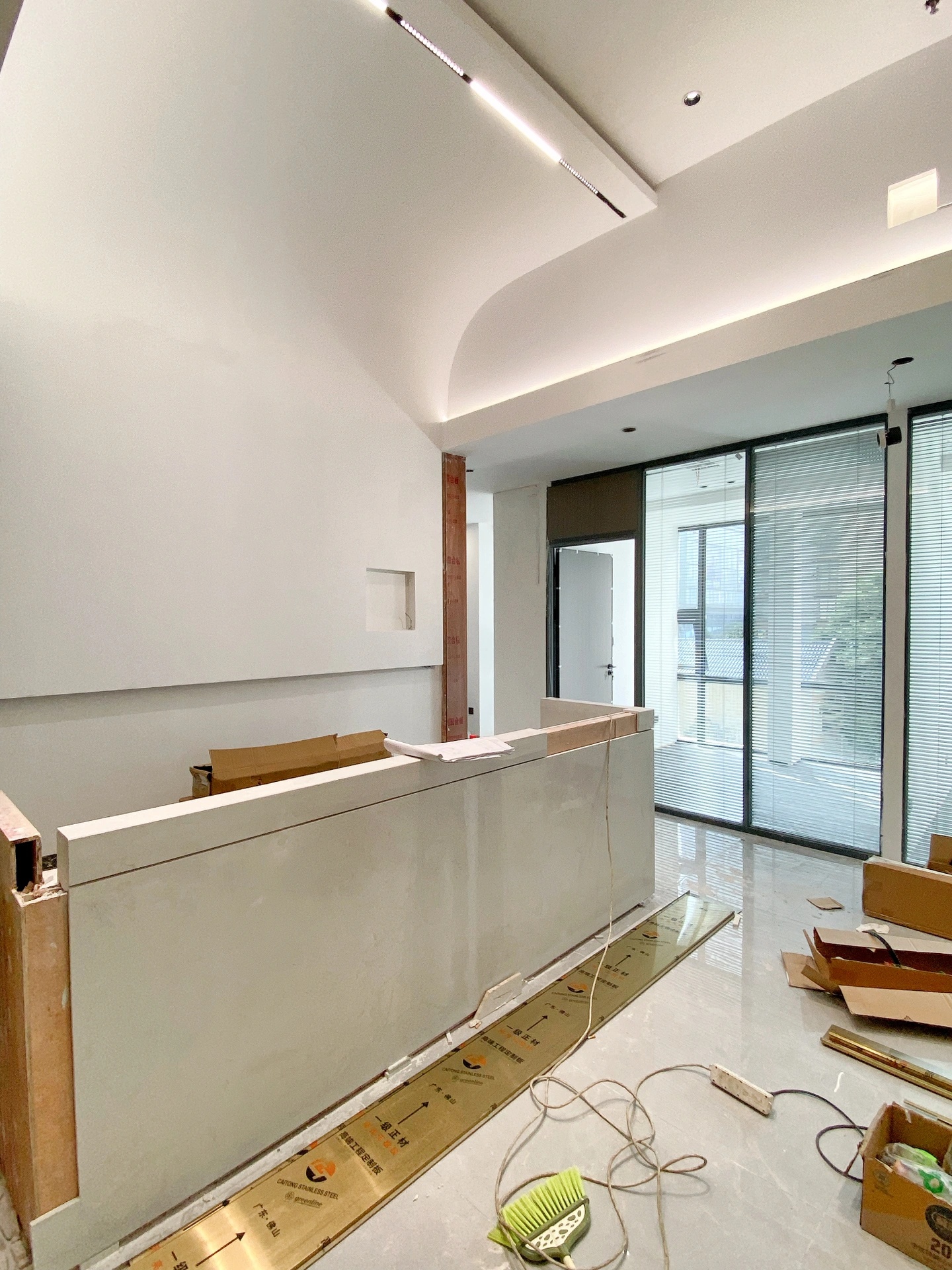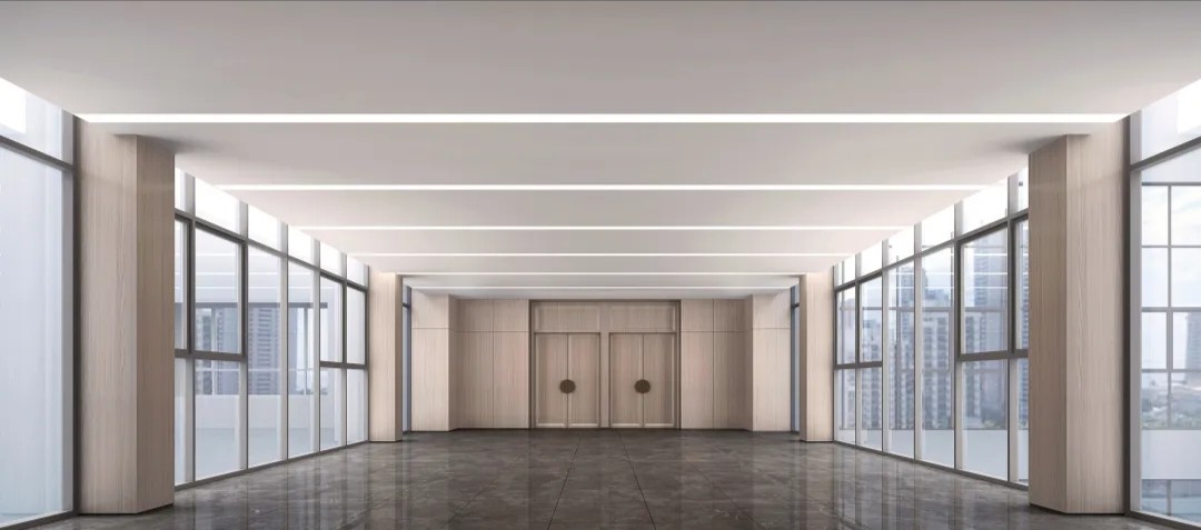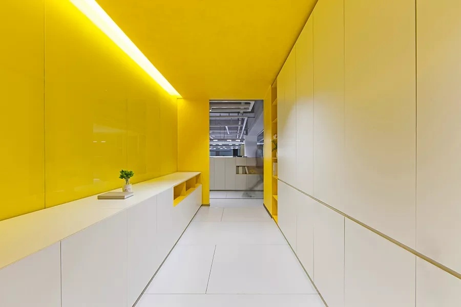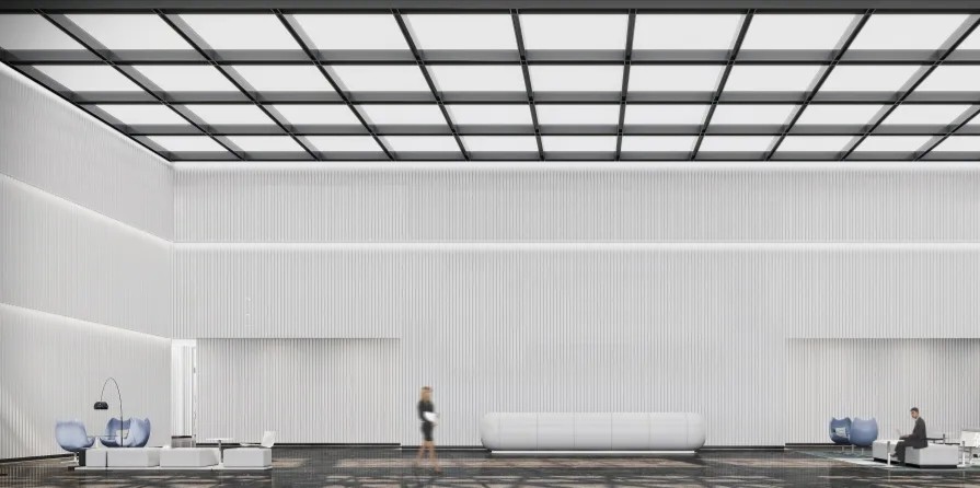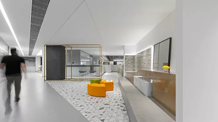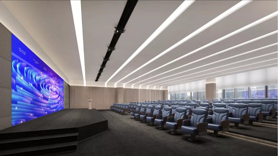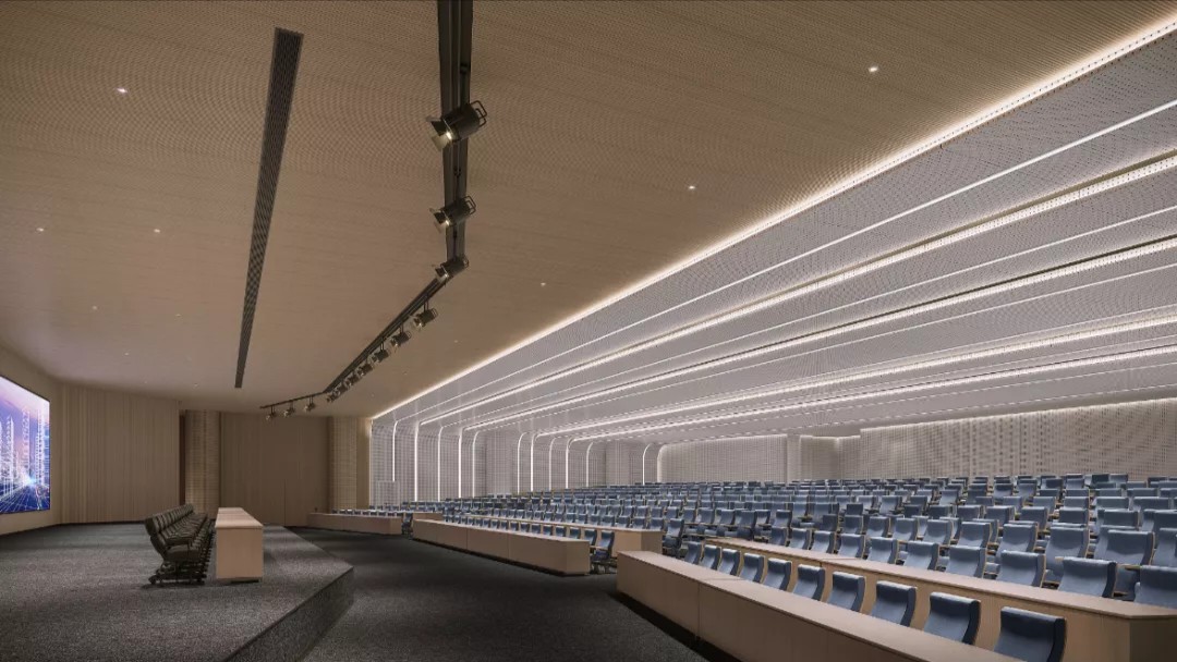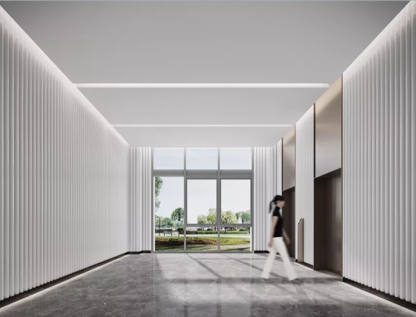 大厅以白色为基调打造轻盈感。墙体叠级的造型犹如海浪,前台和天花亦给人以科技简洁的视觉感受。整体造型如舞台上的幕布,静待开启惊喜。