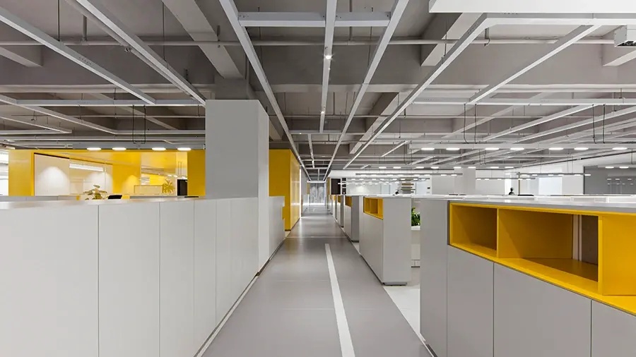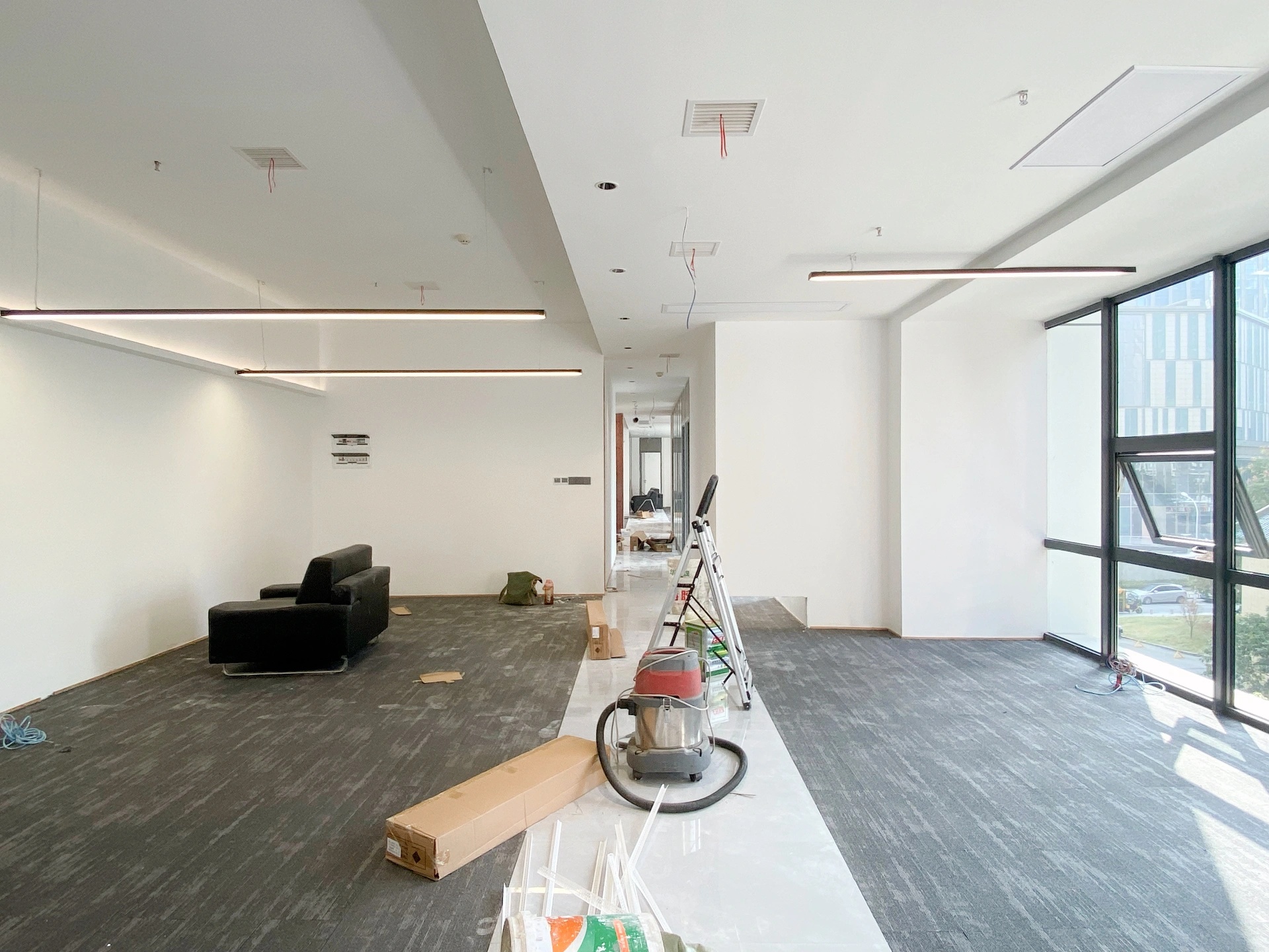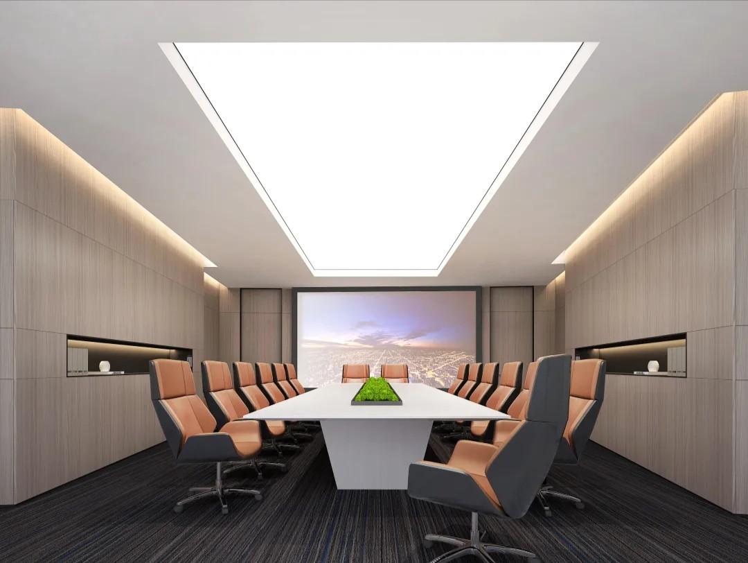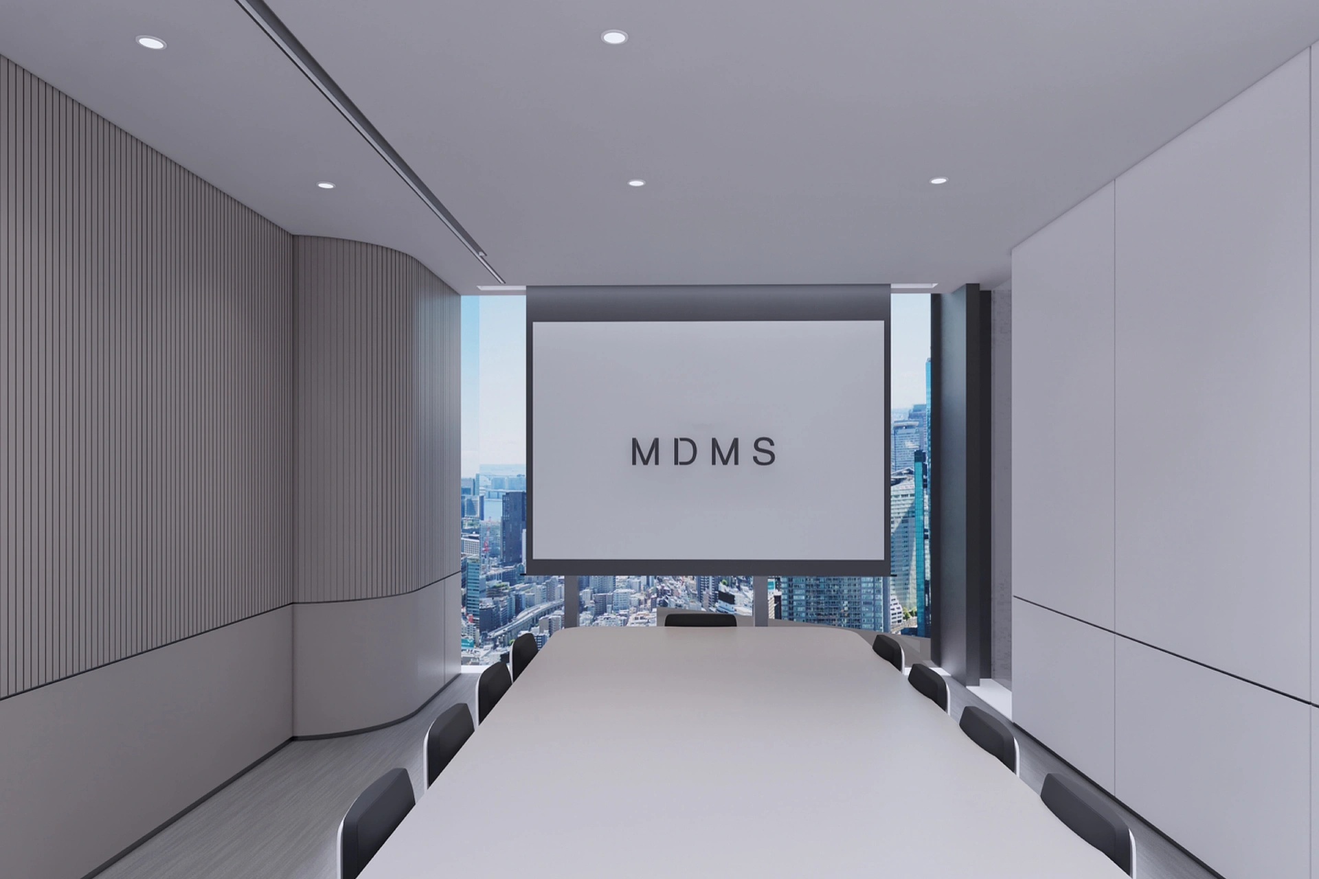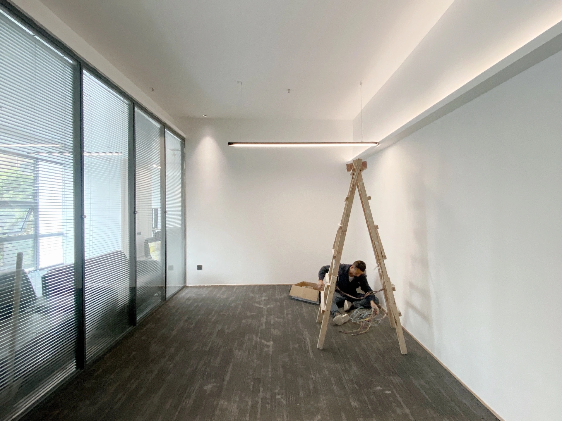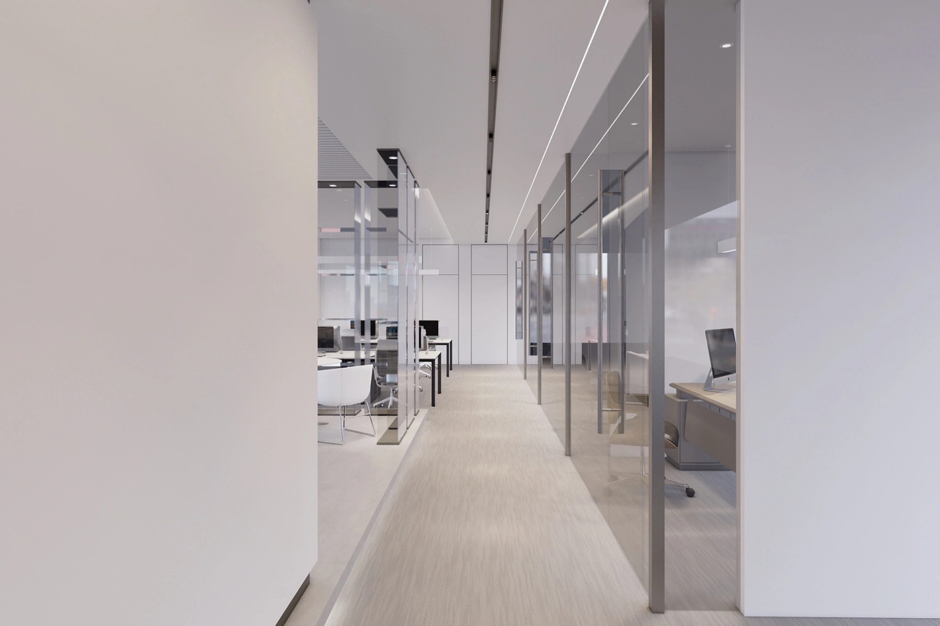 大厅以白色为基调打造轻盈感。墙体叠级的造型犹如海浪,前台和天花亦给人以科技简洁的视觉感受。整体造型如舞台上的幕布,静待开启惊喜。