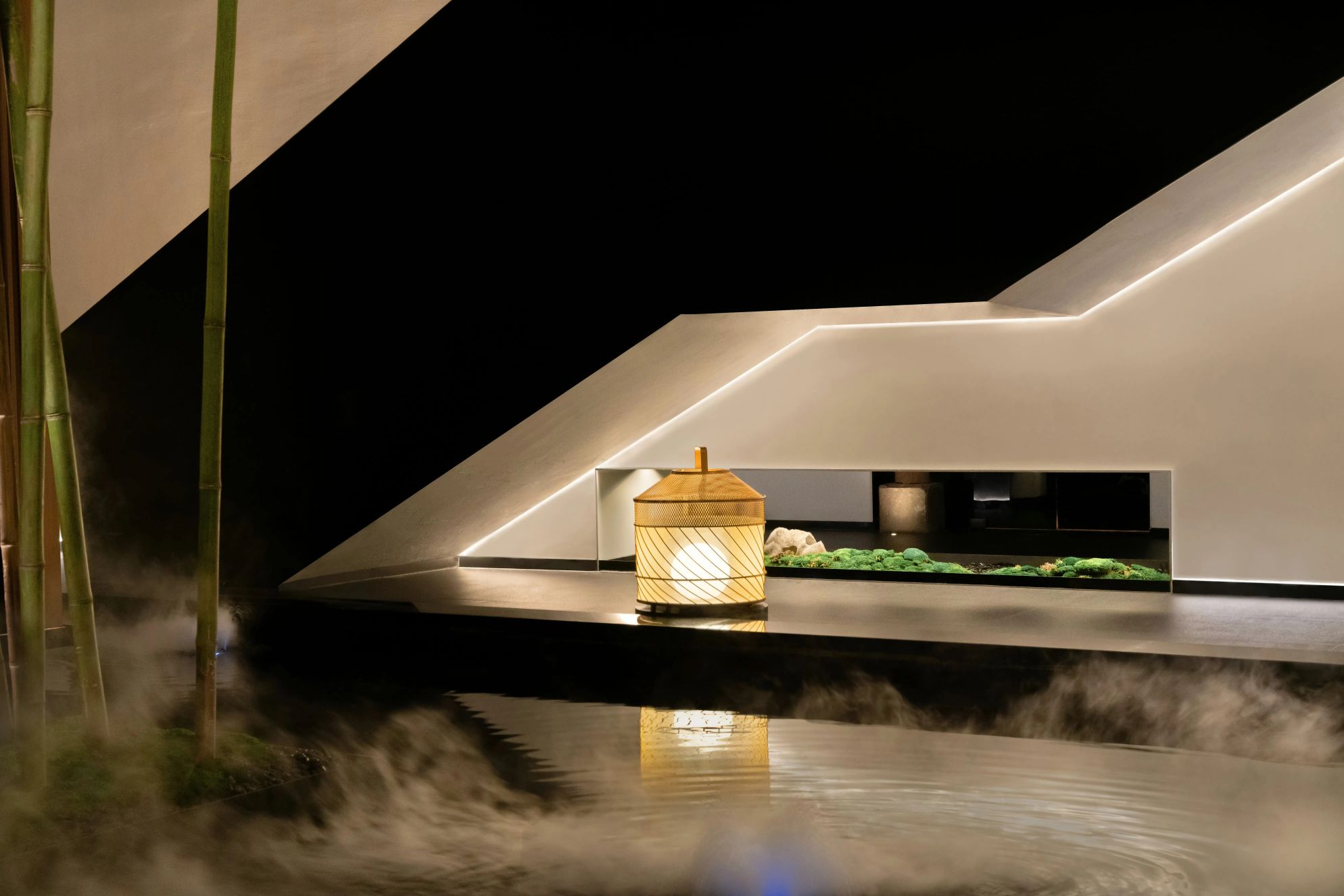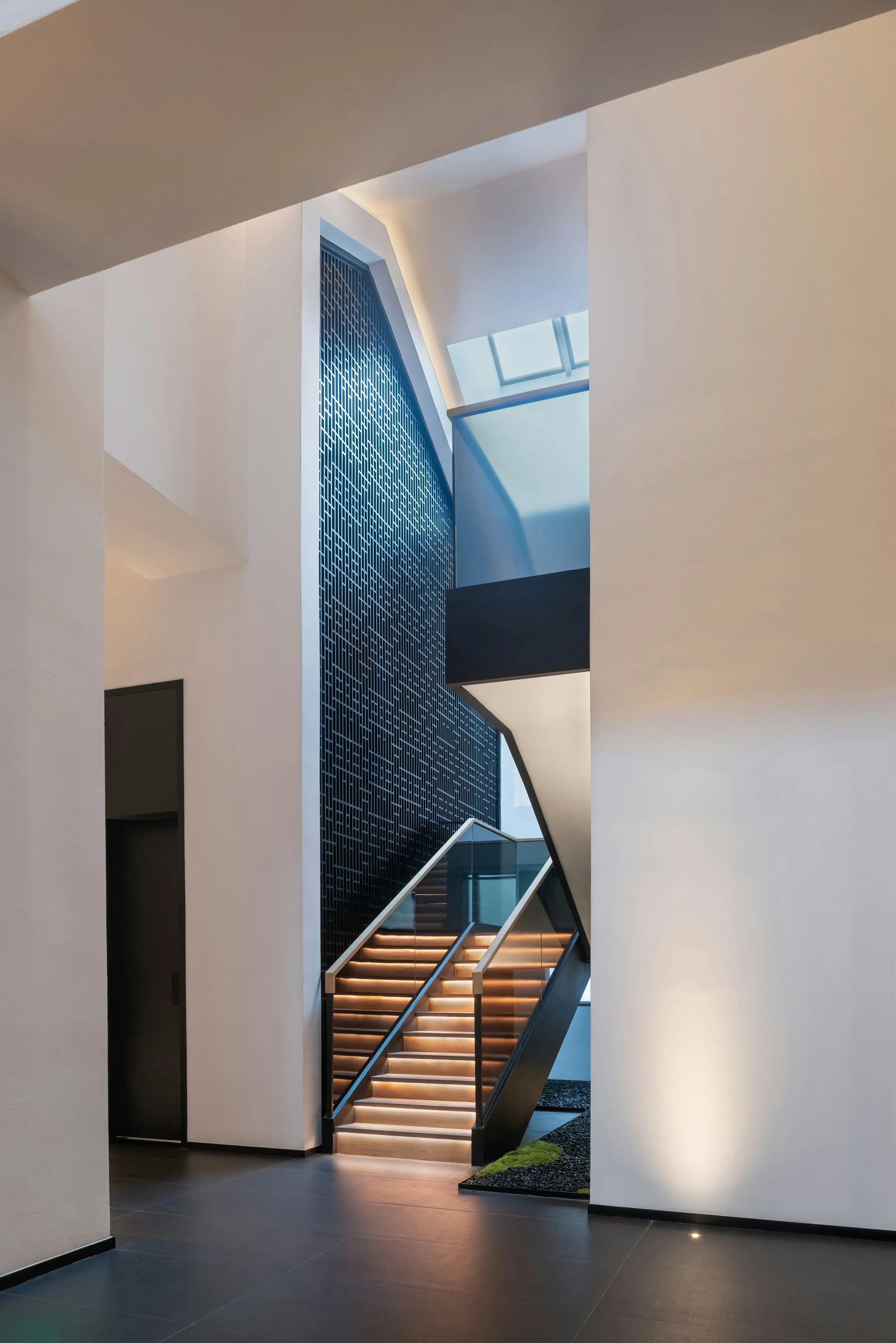 空间延续叠级状海浪般的造型,白色的金属材质极具未来感,木色的融入为空间带来自然的气息。